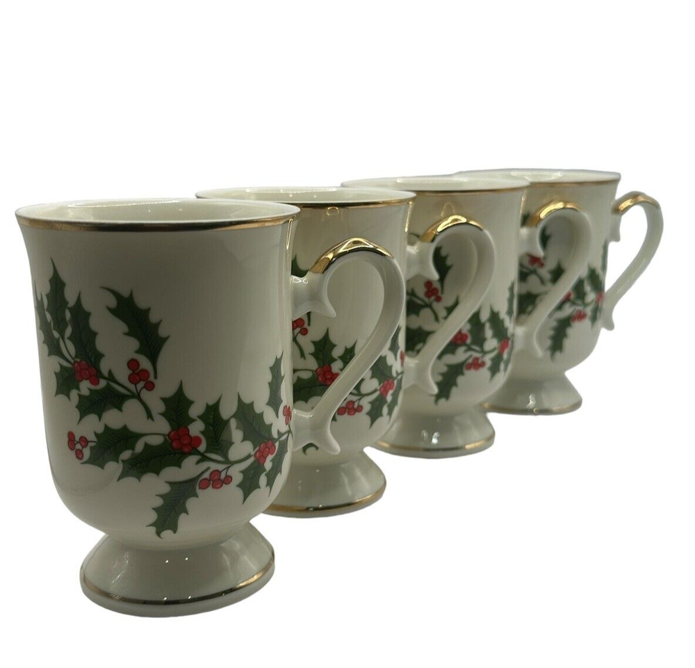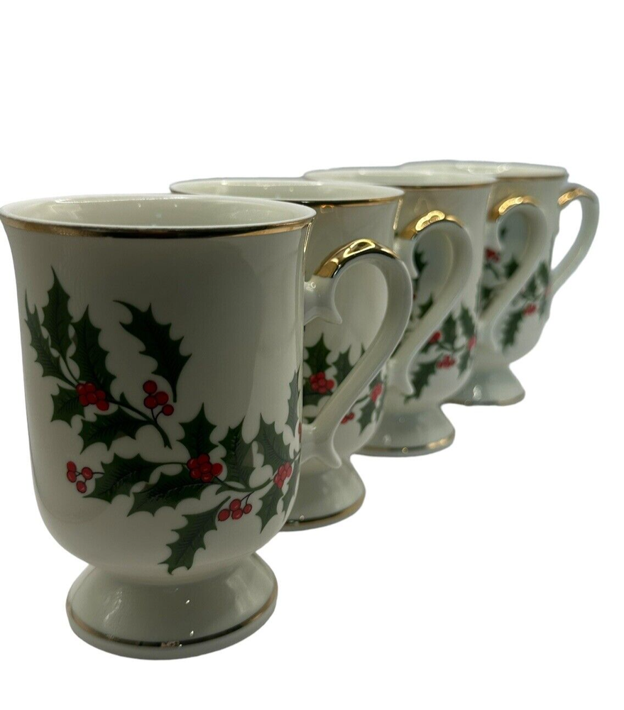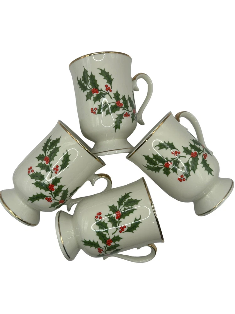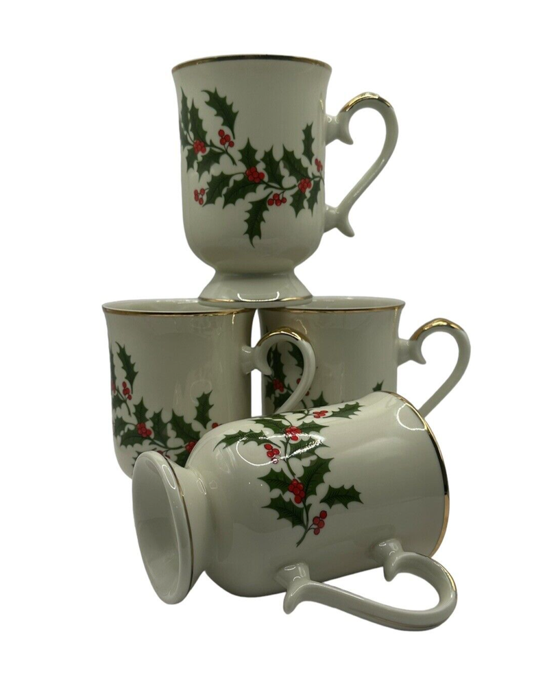 Set of Four (4) Christmas Holly/Berry - Fine China of Japan - Vintage Retired Pattern 1989 FOOTED MUGS - Holly Pattern Description: White Body with Green Holly Red Berry Berries; Gold Rimmed Dimension: 4-3/8"H x 3"Diameter - Mugs are in great condition, Gold-Rim is solid; without chips, cracks or crazing. Set will ship USPS Ground Advantage Tags: Vintage Christmas Footed Mugs, Irish Coffee Mugs, Holly and Berries, Made in Japan, Holiday Mugs, Christmas Mugs, Christmas Dining #1456