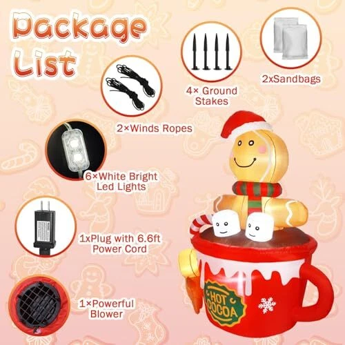 30 Days Return Policy Fast Delivery Trusted seller Christmas Inflatables Outdoor Decorations 6FT Gingerbread Man in Hot Cocoa Cup Blow up Xmas Yard Decoration with Led Lighted Inflatable Décor for Indoor Outside Holiday Party Garden Lawn Product Description 【Cute Christmas Yard Decorations & Super Thick Excellent Material】6ft tall red Christmas hot cocoa cup and a giant gingerbread man in it, a cozy and cute atmosp! this gingerbread is made of super thick durable strength waterproof polyester that is weather-resistant, fadeproof, the excellent stitching improves the durability of the inflatable decoration. Do worry about rips and tears, easy to clean and maintain for a long time use 【Super Bright LED Lights】This 4FT lovely outdoor blow ups Christmas decorations has 4 Built-in eye-catching energy saving bright LED Lights, when you light up at night this gingerbread man, moment illuminate your lawn or garden at night. attracts the attention of neighbors and children, The blow up decorations bring a strong Christmas atmosp,let your family have charming and cheerful holiday time. 【Safe and Stable for Outdoor Use】 This Christmas inflatable yard decoration is equipped with 6.6 ft power cord, you can easily placed it anyw in your yard or garden. Plugs only 12 volts, let your Christmas safer. With 4PCS ground stakes and 2 Build-in heavy sandbags, and tethers on both sides of the product, keeping it secure to the ground. No worries about if this inflatable might fly away by the wind. 【Durable and Self-inflates In Minutes】The height of 6FT Christmas blow ups outdoor equipped with a powerful built-in fan, can easily blow up inflatables in a few minutes, lightweight and self-inflating design make it easy to set up and store. The bottom zipper avoid air leakage and helps fast deflate. NOTE: Please make sure the air blower is facing up when inflating. The air blower facing the ground will affect the effect of inflating. 【Perfect Outdoor Christmas Decorations】Cute inflatable Christmas yard decorations kit included with a built-in air fan, 2 fixed sandbags,4 super bright white led lights,4 ground stakes,2 ropes and a plug w,1 gift box,1 manual. Cute Hawaii Polar Bear a gift inflatable is perfect Christmas Décor for outdoor indoor, yard, garden, lawn, party, holiday, festivals, Xmas. Shipping Returns Payment Shipping Shipping is FREE to all addresses other than APO/PO boxes in the lower 48 states. All our stock ships from US-based warehouses. Shipped via USPS or UPS (depending on location and package weight) Unless stated otherwise, all orders will ship within 24-72 hours of your payment being processed. Check our feedback to see the great reviews of FAST shipping we offer. Returns As our valued customer, we will do our best to make sure the product you receive arrives to you on time and as expected. If you are not satisfied with your purchase, please contact us within 30 days of receiving your order to process a return. Payment We currently accept payment via eBay managed payments only. Once payment is cleared, we will dispatch your shipment within 1-3 business days. Please refer to the "Shipping" tab for more information regarding shipping speed to your destination.
