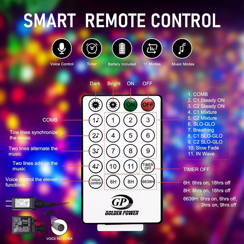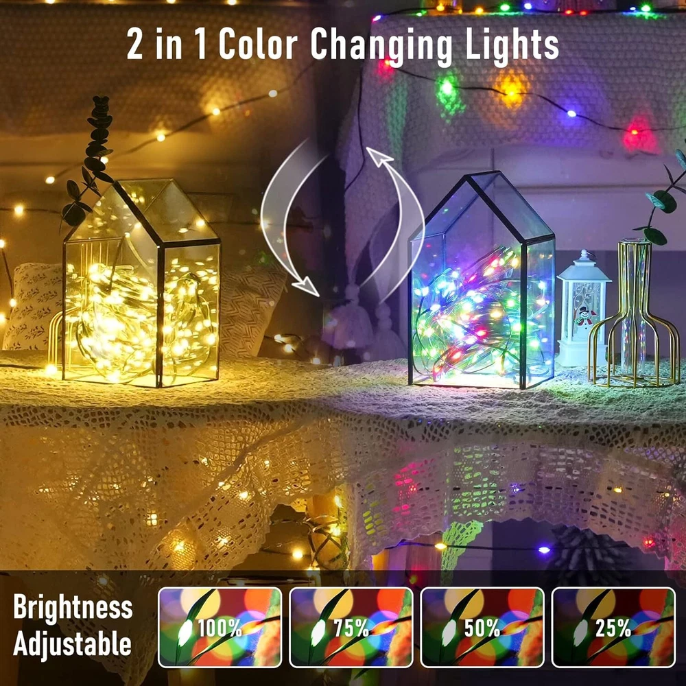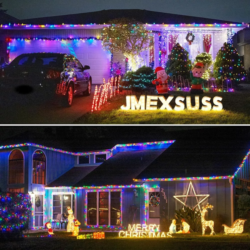 🎄【Enchanting Outdoor Christmas Lights】Elevate your festive decor with our 66ft 200 LED Outdoor Christmas lights, Super Bright Mini LEDs that beautifully adorn your fence, house, and trees in the front yard. Designed with a 3-layer high-quality PVC wire, our outdoor Christmas lights ensure durability and tangle-free convenience, saving you precious time during setup 🌟【Create the Perfect Ambiance】11 Lighting Modes has been updated to replace the previous 8 modes.They are vibrant. Warm white Steady on will meet the masses of consumers requirement.Mulitcolor will crate magic ambiance. Personalize your festive atmosphere further with our innovative 4-levels brightness dimmable function (25%-50%-75%-100%), catering to your every mood and preference ⏰【Effortless Convenience】Experience ultimate ease with our built-in Timer Function, allowing the lights to automatically turn on for 6 hours and off for 18 hours, freeing you from the hassle of remembering to switch them off. The humanized Memory Function ensures your last mode setting is saved, simplifying your life with just one-time setup 🎯【Ready for All Weather】Break free from the limitations of traditional IP44 waterproof lights, as our outdoor string lights waterproof boast a superior IP65 waterproof grade, conquering even harsh weather conditions like heavy rain and snow. Rest assured that our lights will shine bright and beautiful throughout the holiday season(Please protect plug) 🎵【Voice Control & Music Modes】 Music modes have spurred the string lights to a further leap in quality and function. The smart string lights can keep changing with the rhythm of the music because it with a built-in mic ✨【Perfect Christmas Decorations】Embrace endless possibilities with our color changing Christmas lights that are perfect for both outdoor and indoor decor. Accentuate your fences, outline your houses, and bring cheer to your front yard. Indoors, let them dazzle your Christmas tree, making it the centerpiece of festive delight 🌟【Satisfaction Guarantee】Please do not hesitate to reach out to us should you encounter any issues with our Outdoor String Lights Waterproof. We are committed to providing outstanding customer service and will promptly resolve any concerns that may arise. Choose our product, and let these color changing Christmas light up your life