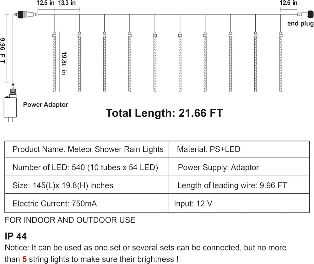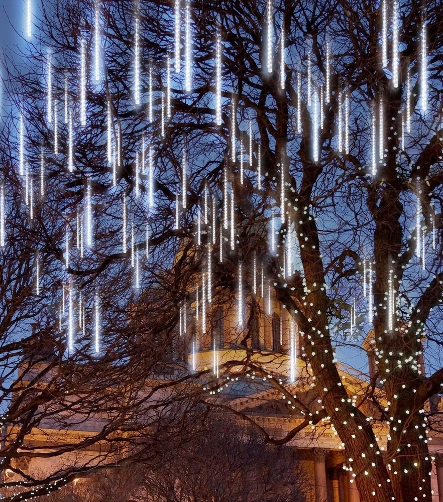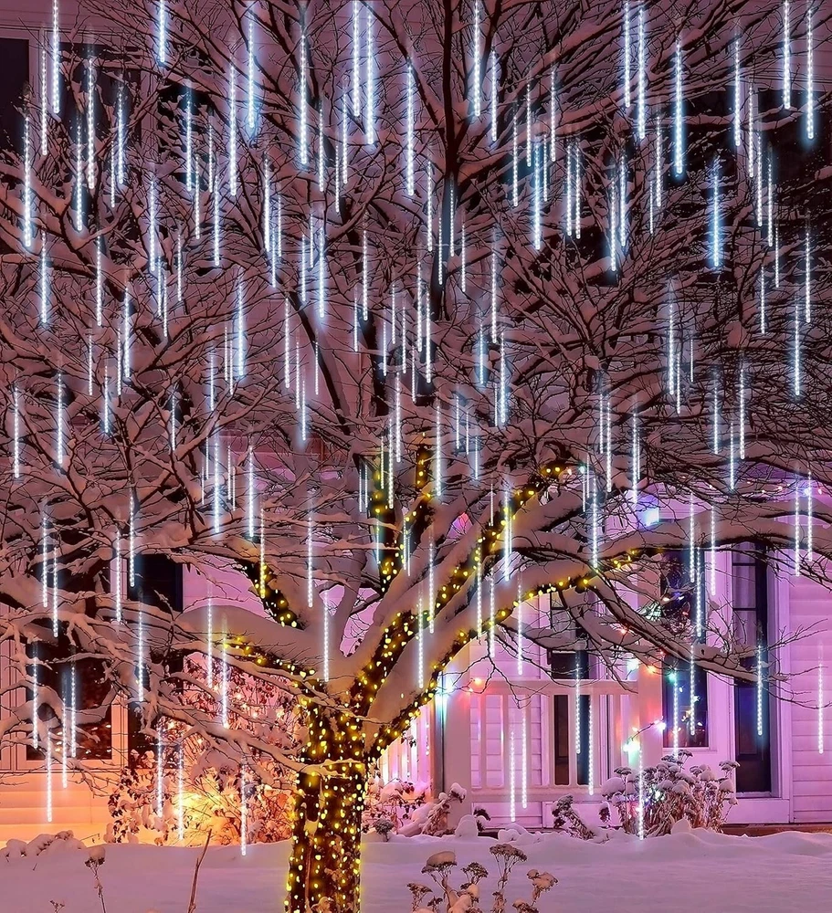 Color White Brand Joiedomi Indoor/Outdoor Usage Outdoor, Indoor Special Feature Waterproof Power Source Corded Electric Light Color White Theme Holiday Occasion Christmas Style Modern Material Polycarbonate About this item PERFECT SIZE. The White LED Meteor Shower Rain Lights have 10 tubes on one strand, each tube is 50cm long, 540 LEDs. EXTENDABLE. Designed with a connector that can connect more than 2 lights together to suit wider occasions. We recommend connecting at most 4 strings to ensure all the lights work well and get the best brightness. PERFECT DECORATION SUPPLIES & WIDE APPLICATION. Each of the outdoor lights fall in sequence then have a slight delay on each tube, just like a meteor shower or falling snow across the night sky, which shows a super beautiful display. They are perfect to decorate trees along street/park/ river, hang along the roof, great for market engineering lighting, urban and architectural beautification. Ideal for patio, yard, garden, hotel hall, shopping mall decoration. PREMIUM QUALITY & WATERPROOF. Made of premium PC material that is transparent, you can see the light glow clearly through the tube. The Christmas light is waterproof, ideal for indoor & outdoor decoration, please protect the plug from the water or heavy raining day. Dustproof, corrosion-resistant, cost resistant, aging resistant, more durable that will last several years using. Safety test approved. CUSTOMER SATISFACTION. Providing a great satisfaction experience is our main priority to our customers. Feel free to message us through “contact seller” if products don't meet your expectations.