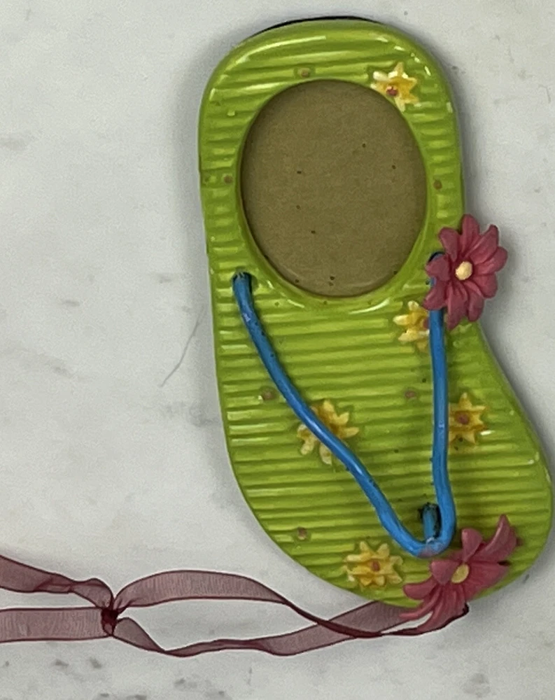 Christmas Ornament Picture Frame SANDAL Flip Flop Beach Slipper Green Tropical 5.75”x3.75” Frame area: 2”H x 1.5”W Pre-owned, never used