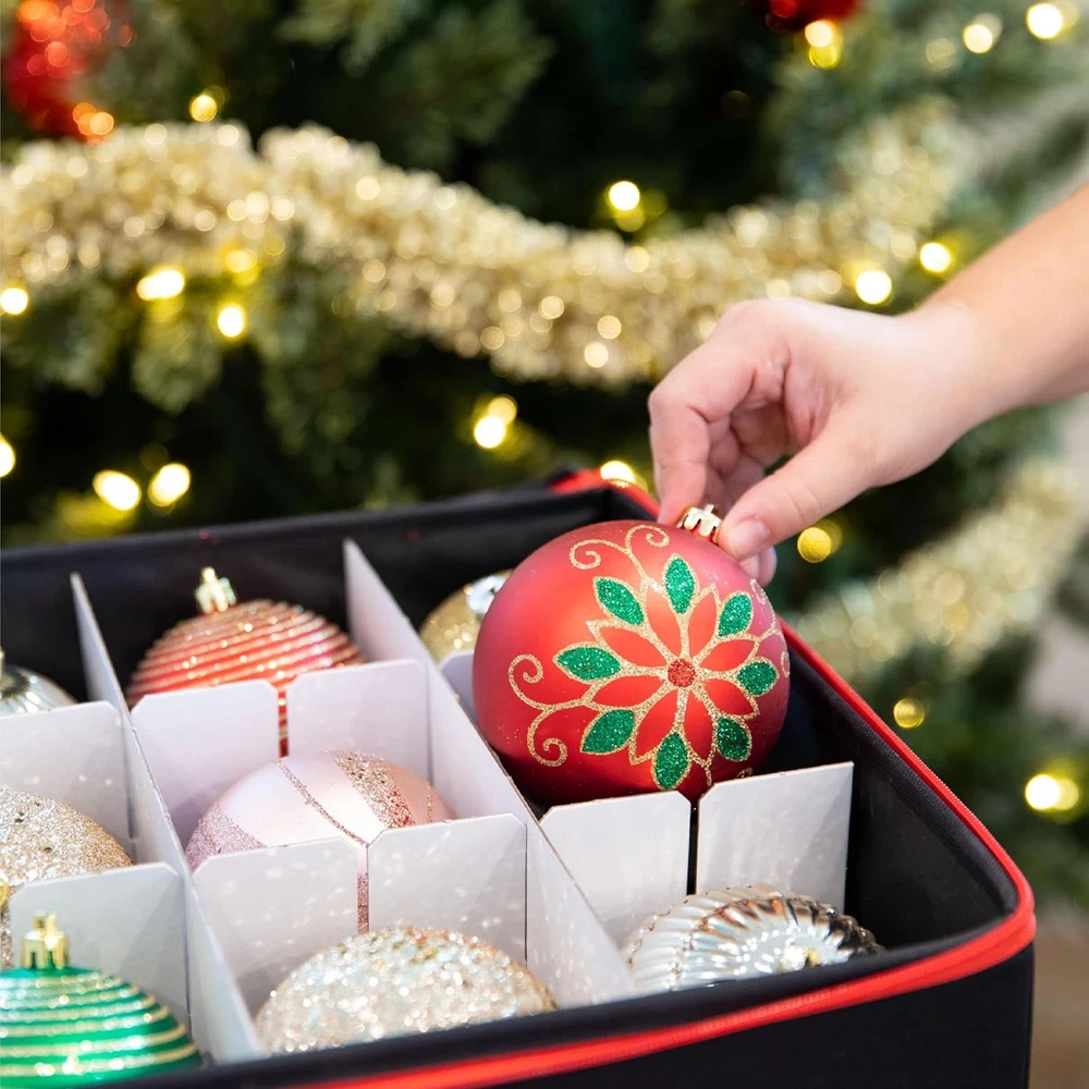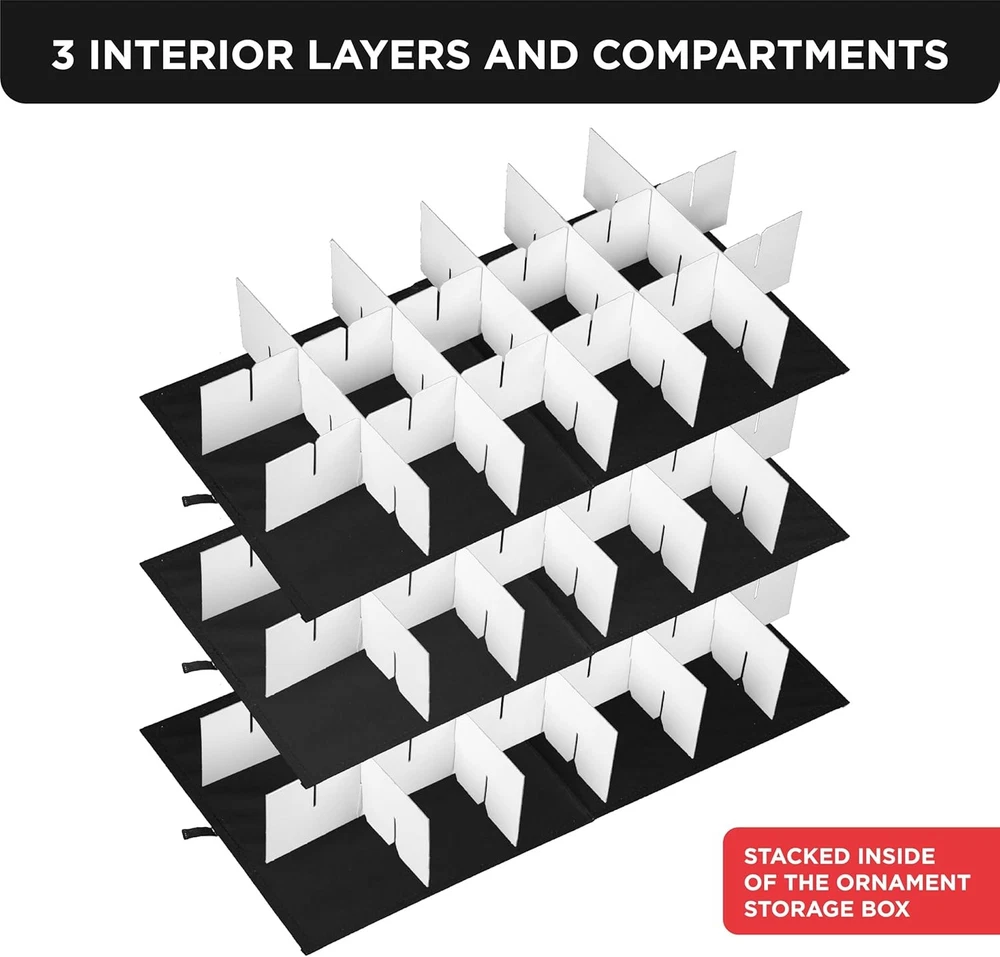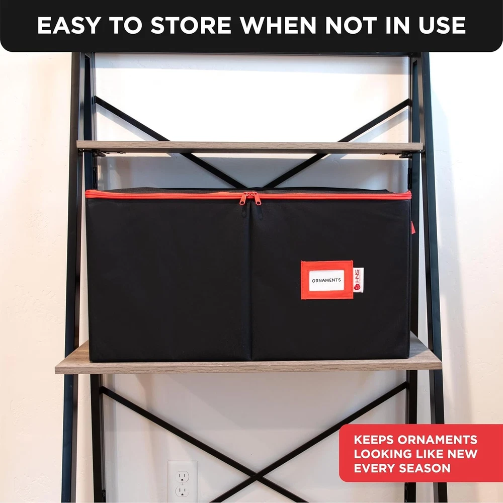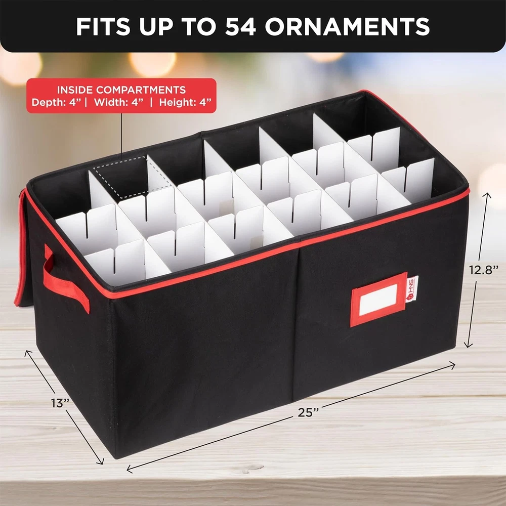 Christmas Ornament Storage Container with 54 - 4" Ornaments, Black Description Features: [PROTECT - KEEP YOUR ORNAMENTS SAFE] Picture yourself taking down your Christmas tree and not having to worry about how you're going to store your holiday decorations. Finally, there's no need to keep the flimsy packaging your ornaments came in with. Our Christmas Ornament Storage Box solves your problem since our 54-count chest can safely and securely protect all your Christmas Ornaments in one place. [SORT - ADJUSTABLE ORGANIZER] The included cardboard dividers can be easily assembled to fit your ornament storage needs. You have the flexibility to store and sort big or small or oddly shaped ornaments without bumping or banging into one another. The compartments can hold either a medium-sized Christmas ball or two small ones. Larger sized adornments can be accommodated by removing the inserts [SAVE - HIGH-QUALITY CONSTRUCTION] Made of durable, heavy-duty cardboard, 600D fabric exterior, and zippered closure cover, this storage container ensures that your ornaments will last for years to come. The individual compartments will keep your decoration from bumping into each other preventing breaks. The bin lid blocks dust, dirt, and light from damaging your ornaments keeping them looking like new every season [STORE - SPACE SAVING DESIGN] The storage container comes in 2 colors: red and gray and measures 25" W x 12.8" H x 13" D. A clear identification card slot is positioned in front so you can label your ornaments and keep them organized. Box collapses flat when not in use and can be stored anywhere. Durable handles allow you to comfortably carry your container from room to room. Product Details: Brand: HOLDN’ STORAGE Color: Black Material: Tear-Resistant 600D Special Feature: Customizable Dividers, Durable Zippered Top Style: Classic Recommended Uses For Product: For Christmas Ornaments Product Dimensions: 25"L x 13"W x 12.8"H Capacity: 25 Cubic Inches Water Resistance Level: Not Water Resistant Item Weight: 2.67 Kilograms Opening Mechanism: Zipper Shape: Rectangular Number of Items: 1 Number of Compartments: 18 Unit Count: 1.0 Count Item Package Quantity: 1 Occasion: Christmas Closure Type: Zipper Manufacturer: HOLDN’ STORAGE Item Weight: 5.87 pounds Size: 54 - 4" Ornaments Number Of Pieces: 1 Special Features: Customizable Dividers, Durable Zippered Top Batteries Included?: No Batteries Required?: No Brand: HOLDN’ STORAGE Color: Black Material: Tear-Resistant 600D Special Feature: Customizable Dividers, Durable Zippered Top Style: Classic Handling We will ship all orders within 3 business day of payment. Delivery We take pride in offering fast and reliable delivery for your orders! We are committed to getting your products to you as quickly as possible. Generally, we would like to inform you that all orders will be delivered to you within 1-3 business days after processing.However, in some cases, delivery times may vary depending on the buyer's location. Especially in remote or rural areas, the expected delivery time may be extended. In such situations, we do our best to ensure that your order reaches you as quickly as possible.If there are any delays, we will be happy to contact you to explain the situation. Our goal is to enhance your satisfaction with our fast delivery times. We work diligently to ensure that your order arrives safely.Trust us and enjoy our speedy delivery! Return Policy All items qualify for returns within 30 days of receipt. Buyer is responsible for return shipping on any item that is not damaged. Feedback We take our reputation seriously, we buy and sell online, so we understand the value of trust. If you are unsatisfied with your order, please contact us and we will work with you to resolve it to your satisfaction.