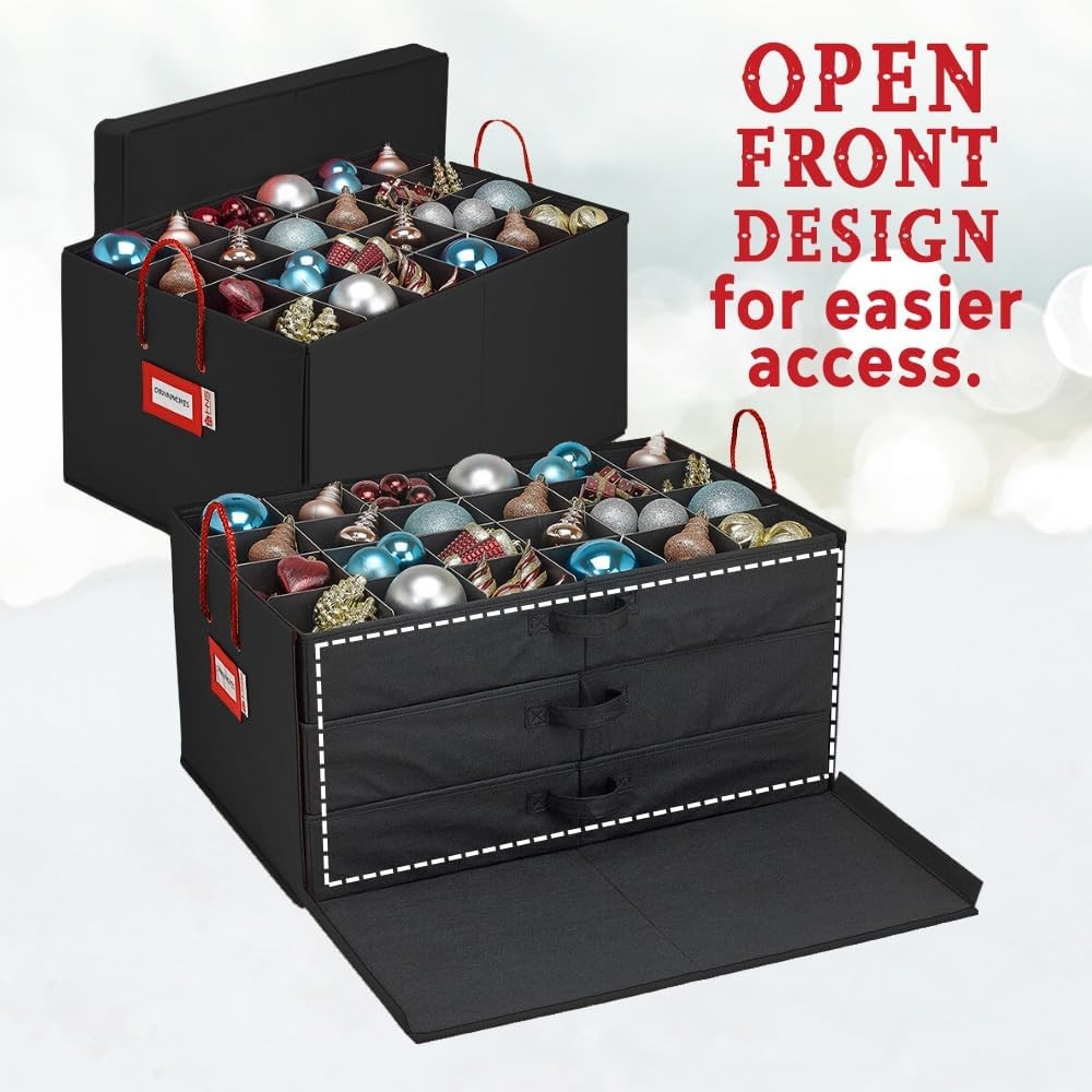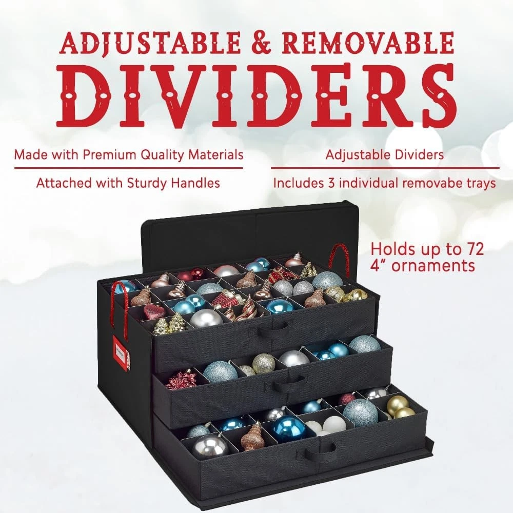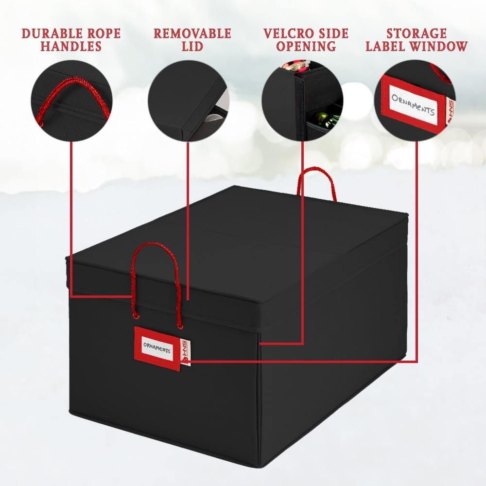 HOLDN’ STORAGE Christmas Ornament Storage Box 72 - 4" Ornaments, Black Product Details Brand: HOLDN’ STORAGE Color: Black Material: Durable Non-Woven Fabric Special Feature: Stackable, Durable, Foldable, Adjustable Style: Modern Recommended Uses For Product: For Storing Christmas Decorations Product Dimensions: 25.5"L x 17.5"W x 17.75"H Closure Type: Lid Water Resistance Level: Not Water Resistant Opening Mechanism: Hinge Shape: Rectangular Pattern: Solid Number of Items: 1 Number of Compartments: 3 Unit Count: 1.0 Count UPC: 810155080259 Manufacturer: HOLDN' STORAGE Part Number: HS-40028-RS-BLK Item Weight: 12.23 pounds Country of Origin: China Item model number: HS-40028-RS-BLK Size: 72 - 4" Ornaments Number Of Pieces: 1 Special Features: Stackable, Durable, Foldable, Adjustable Batteries Included?: No Batteries Required?: No Brand: HOLDN’ STORAGE Color: Black Material: Durable Non-Woven Fabric Special Feature: Stackable, Durable, Foldable, Adjustable Style: Modern Protect Your Ornaments: Store up to 72 ornaments (4 inches each) with sturdy dividers that prevent scratches and damage, ensuring your decorations stay safe year after year. Customize Your Storage: Adjust the dividers and use the 3 stackable trays to organize ornaments of any size or shape for a neat and efficient storage solution, featuring a front-opening design for easier access. Move with Ease: Carry the container or individual trays effortlessly thanks to the durable rope handles that provide a convenient and secure grip. Save Space: Perfect for all ornament sizes, including large or oddly shaped ones, thanks to the box dimensions of 25.5”W x 17.5”D x 12.75” H. Built to Last: Constructed with Durable non-woven fabric and Acid-free cardboard, this box ensures your ornaments remain protected and organized for years.