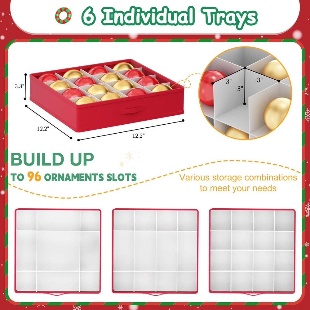 ornament storage box ornament organizer christmas ornament organizer ornament box christmas storage containers christmas ornaments storage box christmas storage box Features ❖1. Extra Large Capacity -- Our christmas ornament storage box measures 25.5 inches in length, 12.9 inches in width, and 9.5 inches in height. The christmas ornament organizer storage box includes 8 individual trays, each designed to securely hold ornaments. Each tray has ample room for ornaments, allowing for easy organization and safe handling. ❖2. Sturdy Material-- The christmas ornament storage containers features a 600D Oxford fabric exterior and cardboard dividers inside. The materials provide strength and stability, helping to keep ornaments separated, dust-free, and well-organized. ❖3.Foldable Design-- When not in use, the box is fully collapsible, allowing it to fold flat to save storage space. ❖4.Easy to Carry-- The christmas ornament boxes storage features sturdy side handles, making it easy to carry and transport, whether moving it around the house or to different storage areas. ❖5.Easy to Store-- Perfect for both long-term storage and quick access during the holiday season, this ornament storage box keeps your decorations safe, organized, and easy to transport. ❖❖❖ornament boxes ornament holder christmas organizers and storage christmas decoration storage❖❖❖ Christmas Ornament Storage Box Adjustable Dividers Store Up to 96 Holiday Ornaments 3 Inch Christmas Decoration Ornament Storage Containers Ornament Organizer with Lids & Removable Drawer Trays ★【Large Storage Space - Christmas Ornament Storage Box】The size of ornament storage box is 25.5" L x 12.9" W x 9.5" H, large to hold up 96 ornaments. The ornament holder provides ample space to keep them protected and neatly arranged for the next season. ★【8 Individual Trays - Christmas Ornament Storage】The ornament organizer includes 6 individual trays, each measuring 12.2" L x12.2" W x 3.3" H. These trays help in organizing and protecting your ornaments, preventing scratching and tangling. You can customize the layout to fit any shapes and sizes of ornaments. ★【Quality 600D Oxford Material- Christmas Ornament Boxes Storage】The Christmas ornament storage boxes are made of heavy duty 600D Oxford fabric and thick cardboard, sturdy and stable, to ensuring that your ornaments are protected from dust and damage throughout the year. ★【Easy to Carry - Ornament Boxes for Storage】The ornament storage box is dsigned with reinforced handles for effortless carrying, even when fully loaded with ornaments, perfectly suited for closets, attics and garage. ★【Keep Organized & Sapce Saving】With a collapsible design, the christmas ornament storage containers can be easily folded flat, making it easy to store without taking up much space. If you have any questions, don't worry, our professional customer service team will solve it for you in time.