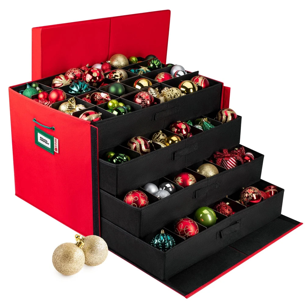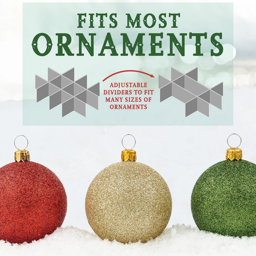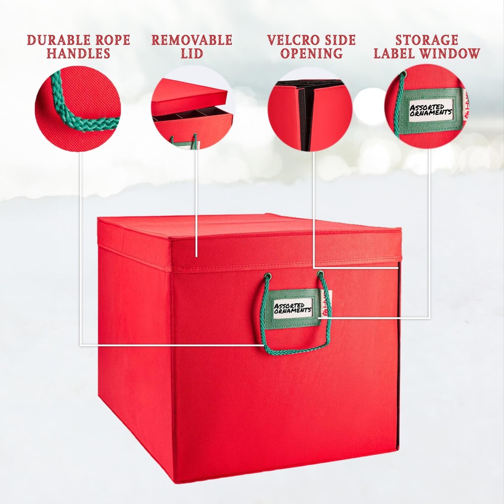 Heavy Duty Fabric Christmas Ornament Storage Container - Holds up to 96- 3 Inch Ornaments Don't be heartbroken this year when you open up your holiday decorations expecting them to be in the same condition as when you've stored them but only to find out they're either broken, damaged, or lost their luster. Stop storing your ornaments in makeshift boxes and wrapping them in tissue or newspaper doing more harm than good. Try our Christmas Ornament Storage Container and protect your ornaments. Sturdy, Generously-Sized and Incredibly Convenient - Protect your ornaments from dust, dirt, discoloration, and breakage. This Christmas Ornament Storage Container will neatly protect and organize your holiday ornaments with ease. That's because this holiday storage container comes with removable trays and durable handles. No need to carry the entire container with you when you're removing the ornaments from the tree. Premium Quality Design Makes Storing Your Ornaments Effortless. KEY FEATURES: Secure Top Lid and Identification Card Slot 4 - Acid-Free Thick Cardboard Trays Each Tray Holds up to 24 - 3in Ornaments Durable Zippers Cheerful Holiday Colors Sturdy, Side Rope Handles Premium Quality - Non-Woven Fabric 100% SATISFACTION GUARANTEE Why Wait!? Click "Add to Cart" to order your Christmas Ornament Storage Container today! Store up to 96 Ornaments Safely: This 3-inch ornament storage box features cardboard dividers, keeping your Christmas balls secure and organized for easy access. Maximize Convenience with Lift Trays: The box includes 4 stackable trays, each with a comfortable-fit lid and durable side handles for effortless portability. Carry with Ease: Featuring 2 sturdy carrying handles, this ornament storage container makes transporting your decorations a breeze. Perfect Dimensions for All Ornaments: Store both large and small ornaments with ease thanks to the front-opening and spacious design of this Christmas storage box. Preserve Your Ornaments with Premium Dividers: Made from durable, acid-free cardboard, the dividers prevent fading and damage, ensuring your ornaments stay in top condition.