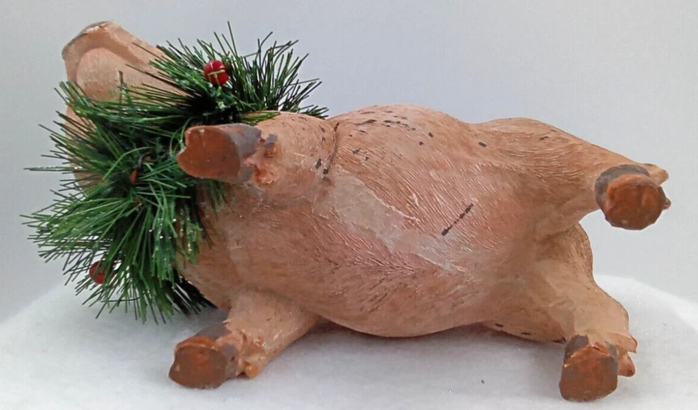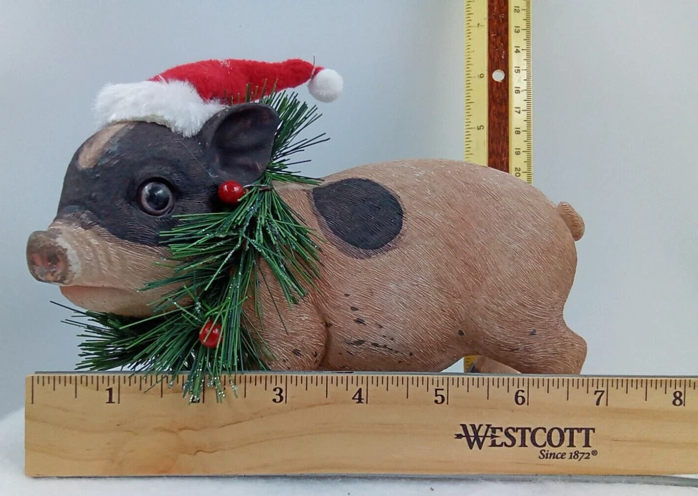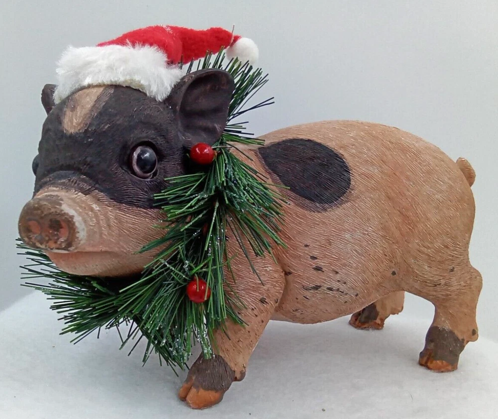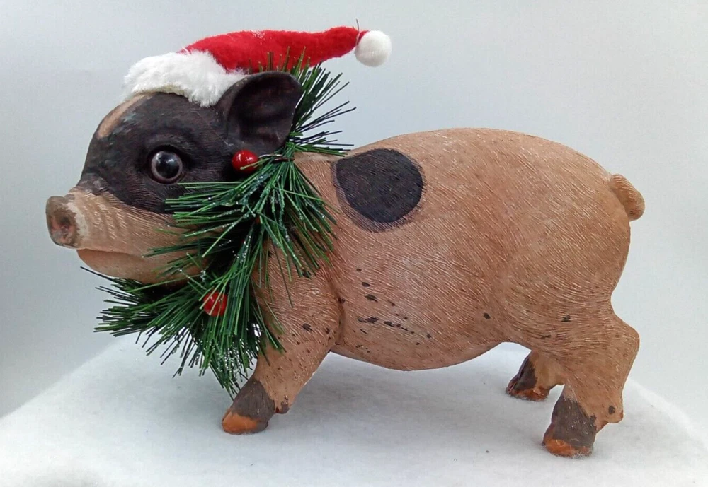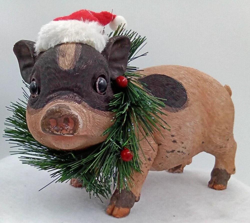 Christmas Pig Figurine Statute Santa Hat Wreath Snout Hoof Tail Textured Stands