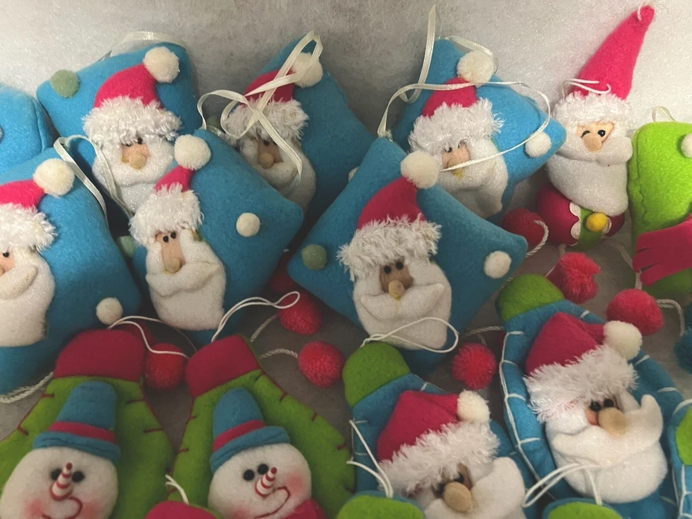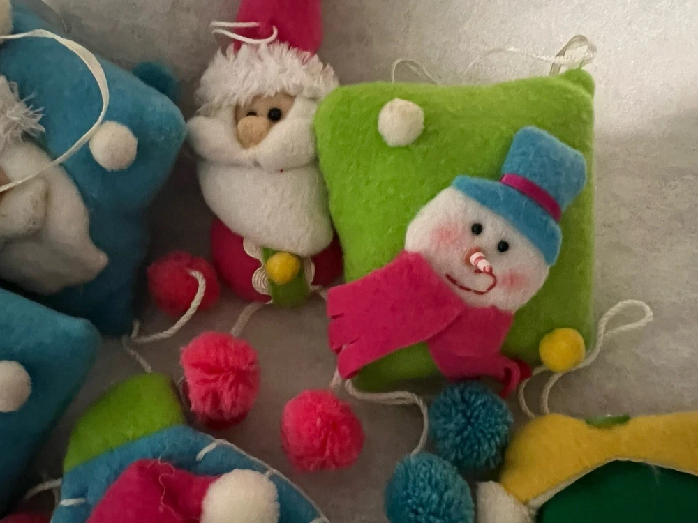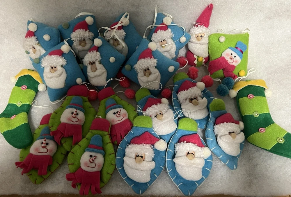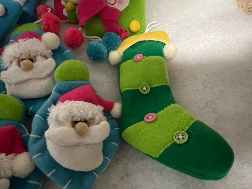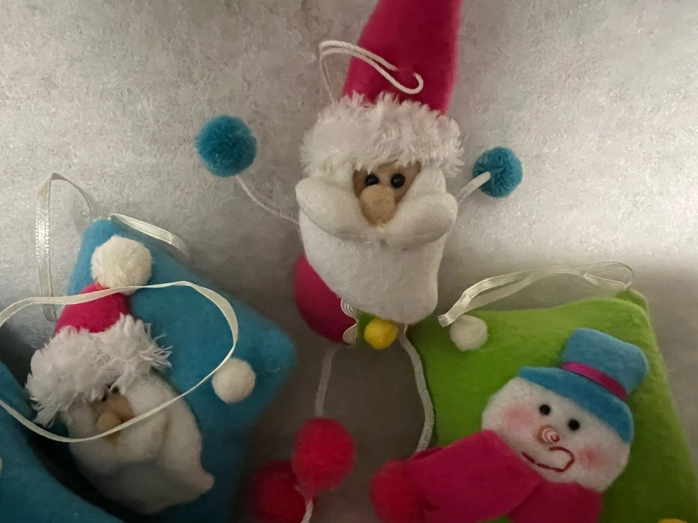 festive assortment of plush ornaments, including characters such as Santa Claus, snowmen, and 2 stockings. This set of 20 medium-sized decorations, each standing 5 inches tall, i vibrant blue and green colorblock design, soft fabric and stitch details, these ornaments are a delightful nod to traditional Christmas themes. They feature a variety of shapes, including the classic bell and box are all equipped with a hanging loop for easy decoration. Whether you're accenting your own holiday decor or gifting them to a friend, these ornaments bring the spirit of the season into any space.