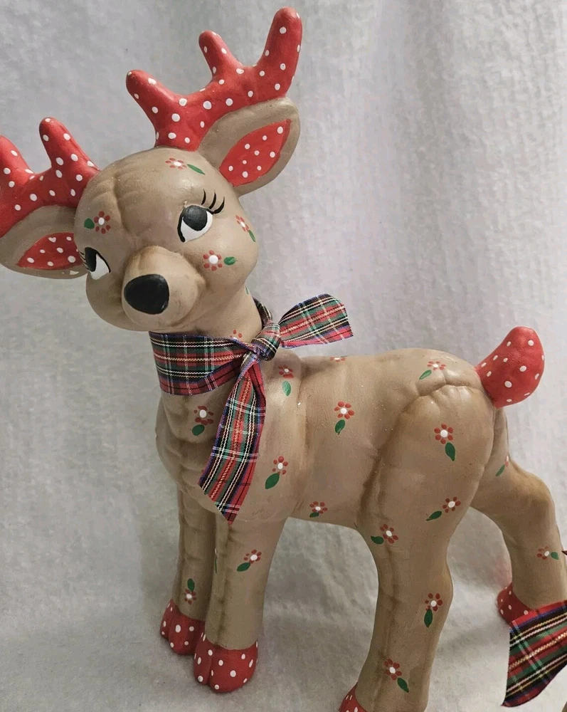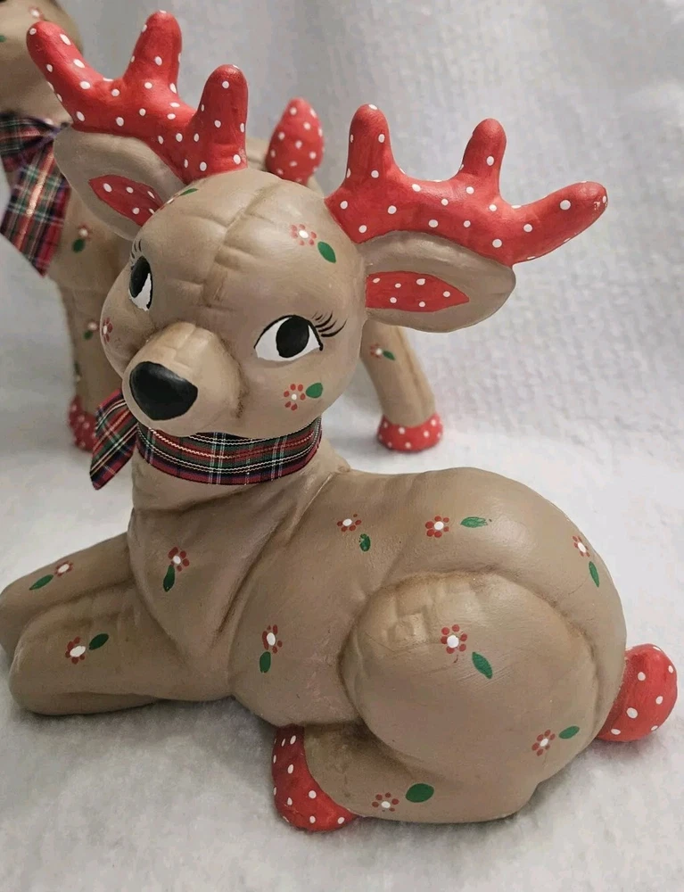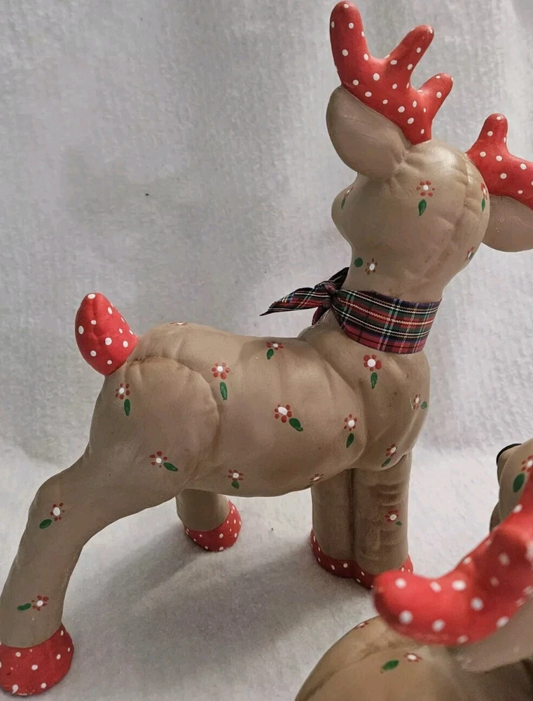 A set of two medium-sized ceramic reindeer figurines manufactured in 1988 by Kimple. These retro-style figurines feature a quilted look and are hand-painted in multicolor. They are suitable for Christmas decor in any room, with a festive reindeer theme. The figurines have a matt finish and are handmade in the United States. Care instructions include cleaning with a damp cloth.