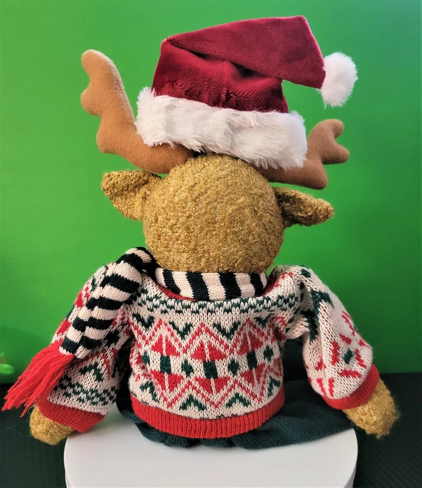 Christmas Reindeer with Santa Hat & Sweater 18” Long Shelf Sitter Dangling Legs. Used in good condition from a smoke and pet free home.