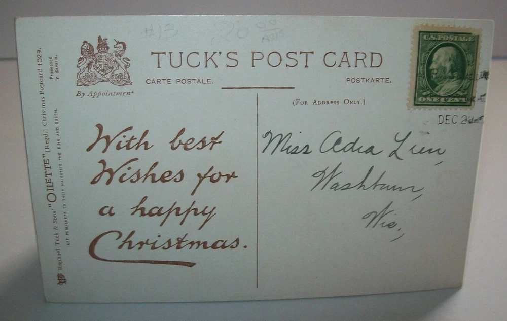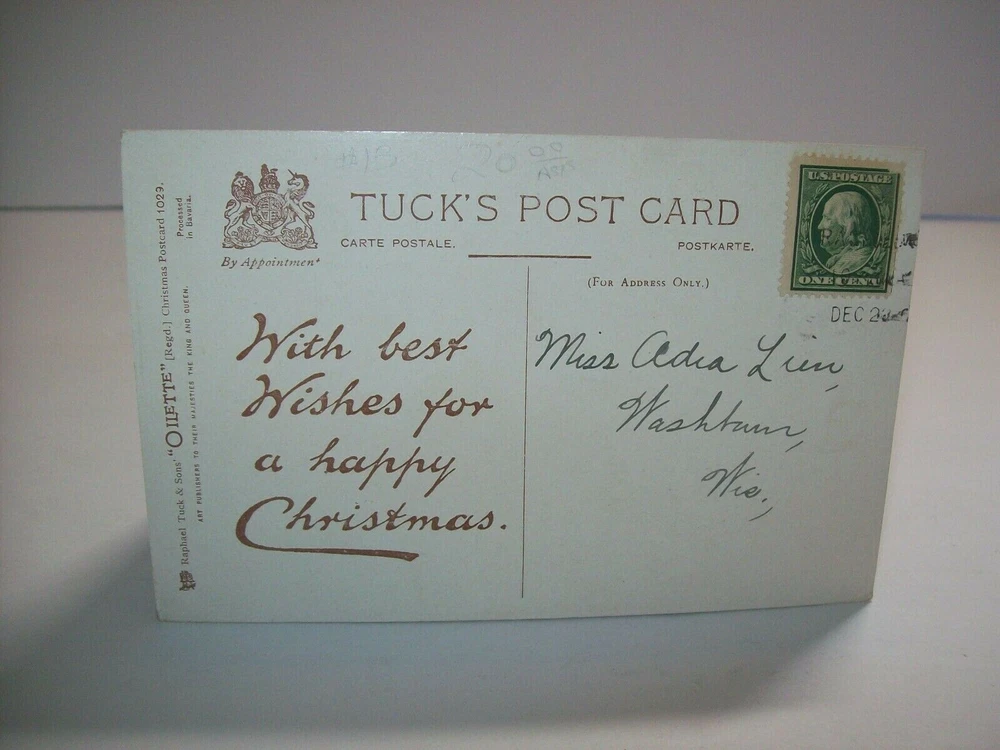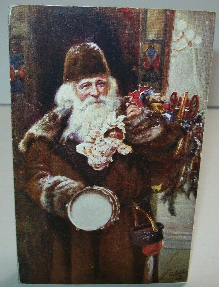Antique vintage original Tucks Christmas postcard. Brown robed Santa. Has artists name Gilette on lower corner. Posted with ink cancel and old 1 cent postage stamp. Series 1029 Oilette on back. Card has ight corner/edge wear. Stock# santa11. Additional vintage Halloween, Santa, Christmas, holiday postcards, are in our store. SHIPPING Bundle and save by using cart and making single payment. International buyers are responsible for any import fees/taxes. ABOUT US Seller of vintage ephemera, collectibles, retro gifts, advertising, artwork, vinyl records, pinball and arcade game flyers and parts, Mad magazines, antique Halloween & holiday postcards, Christmas items, super hero memorabilia, horror themed art, fun stuff. Any questions about this item please just ask.
