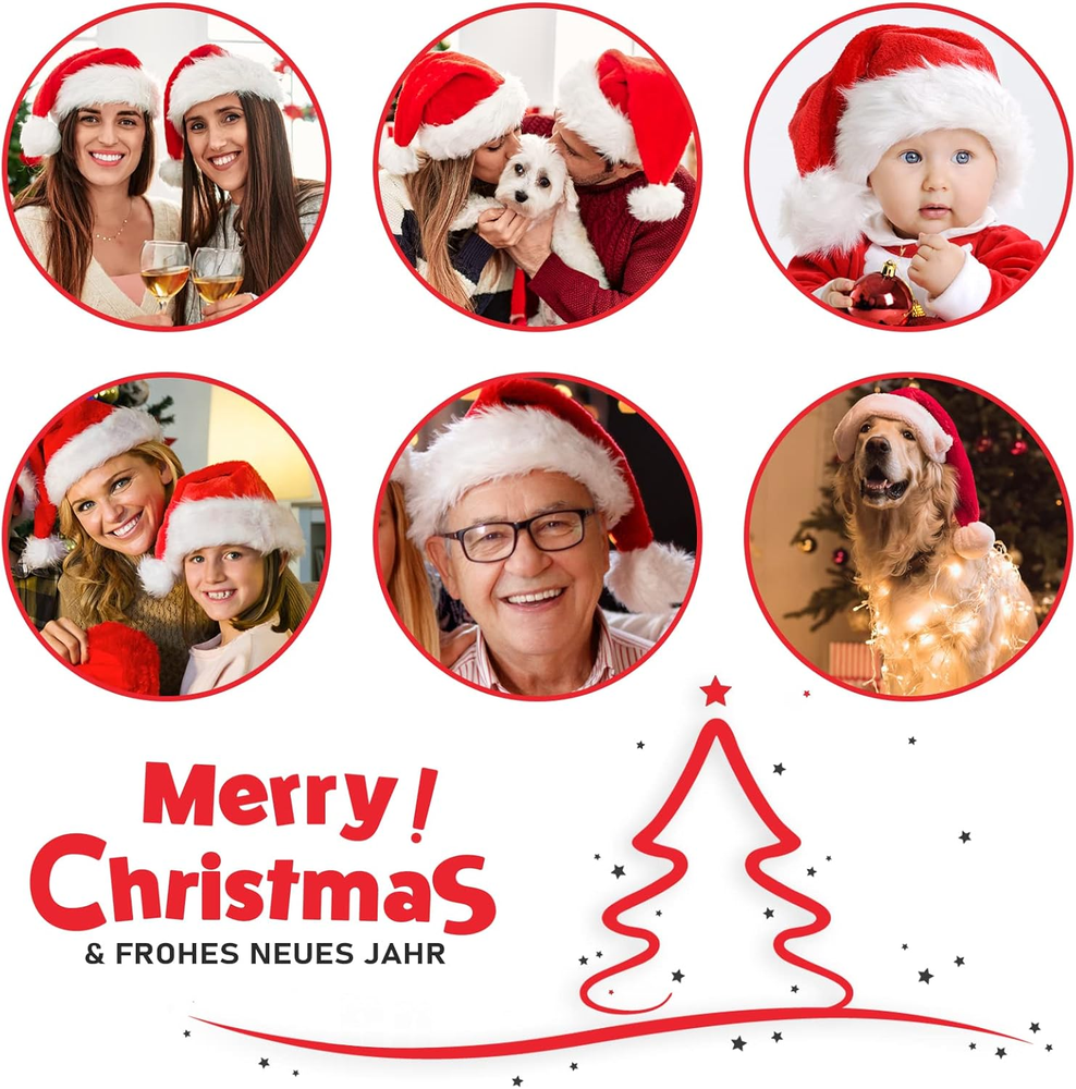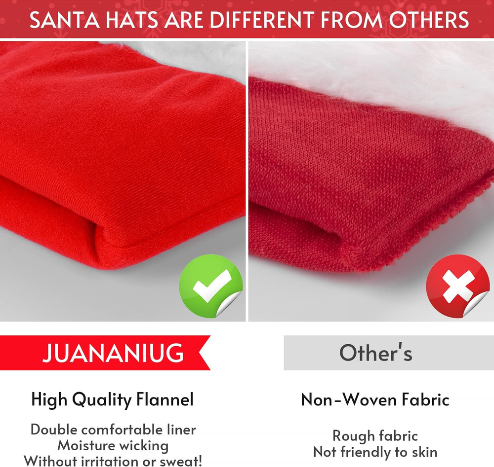 Christmas Hat Santa Hat Adult: Xmas Holiday Hat for Women and Men Polyester Head circumference: 6 3/8-8 3/8 ♥Wonderful Christmas Gifts: Adult santa hats are very suitable for adults, ladies and men, and are great christmas gifts for friends and family. The santa hats adult bring a strong Christmas atmosphere to your christmas day, good quality makes santa hat will be nice for a Christmas photo shoot every year. ♥Ensure Long-term Use: This Christmas hats use the advanced sewing technology, does not shed hair, and is very suitable for long-term wear. Excellent workmanship can even let you use it until next Christmas. ♥Double Thickened & Keep Warm: Extra large santa hat was made with double thickened fabric, inner layer is softer and more comfortable than other ordinary red santa hat, you will feel super warm after wearing it for a even short time. You will feel warm and happy in the New Year. ♥Soft & High Quality: Santa claus hat selected high quality red velvet to made this santa hat, 80% Velvet, 5% Lycra, 15% Plush. Soft comfortable fabric to protect your head and hair without irritation or sweat! We believe that you will fall in love with it because of its material. ♥Best Christmas Party Decorations: Christmas Santa Hat is perfect decoration prop for your party costume to create a pleasant and interesting atmosphere. suitable for Christmas, Halloween, Christmas cosplay, annual ceremony, community activities, stage performance, holiday party and etc. Santa Hat for Adults Santa Hat Women Men Santa Hat Headband Large Velvet Santa Hat Gorrito de Navidad Product Description Santa Hats Are Really Cute And Quirky For Family Christmas Christmas is one of the most grand festivals of the year How can a high quality ceremonial Christmas hat be missed! ! Wear santa hat extra large and enjoy a happy time with your family. Velvet santa hat is also the best partner to take pictures and remember the happy Christmas. Soft &Comfort Liner This Christmas Festival Hats made of high-quality plush, red Velvet fabric and double comfortable linerred fuzz, very warm, suitable for any mild or sensitive skin Super Plush The long velvet quality material is the same as the capball. It can't effectively protect the warmth of the mostimportant head after wearing The smooth long fluff can modify your face and look softer and warmer Christmas atmosphere Or just like Santa Claus . M Soft but Strong Pompom The pompom of this Christmas Santa hats for unisex adults is made of soft and high-quality fluffy so pure white and beautiful ,unlike a short-haired flat Christmas hat but more cute and warm feeling on the moving Every unforgettable moment of Christmas 3.86 inches x 6.06 inches x 2.95 inches. Weight: 2.46 oz Item model number -001 Color 1pack Item Weight 2.46 ounces Manufacturer recommended age 12 months - 6 years Department Unisex Package Dimensions 6.06 x 3.86 x 2.95 inches