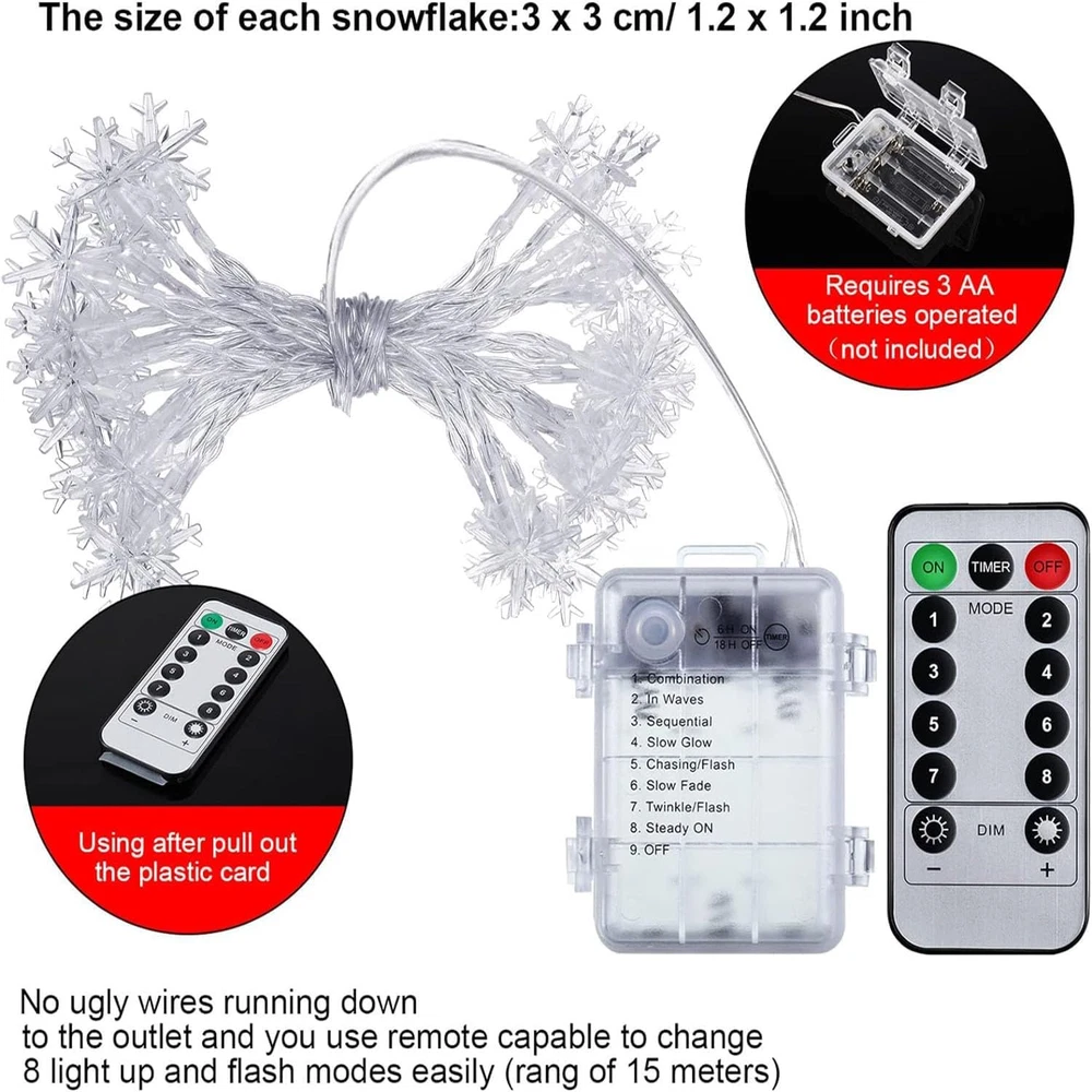 Store New Arrivals Add to Favorite View Feedback Contact Fast deliveries to the customer's home Quality customer service John Make the customers happy! Christmas Snowflake Lights, 20Ft 40LED 8 Modes & Timer Battery Operated Christmas Decorations Lights with Remote Control, Fairy Lights for Indoor Outdoor Holiday Party Decorations Description Festival Decorations:Snowflakes light is 20 feet long, and it is composed of 40 1.4-inch transparent snowflakes. Festival lights are the atmosphere addition to your festival decorations. Snowflake lights string can be bent at will to turn your bedroom into a winter wonderland, and you can enjoy the fairytale sparkle effect of our snowflake lights Remote Control & 8 Modes:Battery operated snowflake lights is equipped with a remote control, and you can adjust the brightness of the string lights from 17 feet away. Outdoor tree decorations have 8 blinking modes (Combination, In waves, Sequential, Slow Glow, Chasing/Flash, Slow fade, Twinkle/Flash, Steady on). Fairy lights will create a warmer, romantic, cheerful and relaxing atmosphere for you Battery Powered & IP65 Water Proofing:Festival decor bedroom only need 3 AA batteries (not included) and can work for up to 40 hours. Festival wall décor are not affected by power problems, so they can be used wherever you want to decorate. The IP65 certified battery box and LED lights can withstand most weather conditions including rain and snow, making them perfect for decorating any outdoor space such as bushes, trees, front porches, courtyards, gardens Safe to Use:Copper wire of the Christmas tree light timer is wrapped with epoxy resin material, so even if it is used for a long time, the snowflake decorations will not be hot. You don't have to worry about the quality of the snowflake lights, if there is any dissatisfaction during your use, please contact us, we will serve you 24 hours Beautiful Snowflake Decorations:Battery Festival lights can be used both indoor and outdoor, such as Festival tree, bedroom, dormitory, bar, window, fence, gallery, terrace, door, porch or pergola, it can add the Warm atmosphere to any space. Snowflakes string lights can also be used for various occasions, Festival, parties, weddings, homes, windows, bathrooms, festivals, holidays, shows, restaurants, hotels, office, shopping centers Product Description The video showcases the product in use. The video guides you through product setup. The video compares multiple products. The video shows the product being unpacked. The 20 foot Christmas Fairytale Light is designed with 40 delicate illuminated clear snowflakes. Continuous, Wave, Flashing, Flickering, Fast Flashing, Slow Flashing, Fantasy, Full Bright. Power up the adapter turn on the timer function, it will stay on for 6 hours and off for 18 hours. IP65 certified outdoor LED string lights and bulbs can withstand most weather conditions. Better extension for your outdoor, indoor, patio, Christmas tree Christmas lights decoration. 1 Christmas Snowflake Light 2 8 Lighting Modes 3 Timer Function 4 Waterproof Rating IP65 5 Christmas Decoration 8 Lighting Modes and Timer Function The snowflake string lights have 8 different modes: continuous, wave, flashing, bright and off, fast flashing, slow flashing, dreamy, and full bright. You can control it by pressing the buttons on the remote control. When the adapter is pressed for power, it will automatically stay on for 6 hours, and only when you turn on the timer function, it will automatically go off for 18 hours. Save yourself the hassle of turning the lights on and off every night and save electricity at the same time. Snowflake Shape Lights Unique snowflake shape lights for colorful Christmas atmosphere, unique Christmas lights for outdoor garden and indoor room decoration. Perfect for Decorating Snowflake shapes emit a warm light that creates a cozy atmosphere for decks, lawns and homes, giving your home a more Christmassy vibe! Christmas Decorations Snowflake LED String Lights. Snowflake lights are bright yellow and starlight, perfect for positioning lights into any decor or holiday project. Creates a Christmas Atmosphere You can put the string lights on your bedroom, living room, stairs, lawn. It is perfect for decorating stage, party, wedding, Christmas and holidays. Perfect Decoration Christmas snowflake string lights can be used both indoors and outdoors, such as Christmas trees, bedrooms, dormitories, fences, terraces, doors, they can add the perfect atmosphere to any space. It can also be used for various occasions, such as Christmas, parties, shows, restaurants, hotels etc. Light Source Type LED Style Snowflake lights Power Source Battery Powered Number of Light Sources 40 Country of Origin China Theme Christmas,Snowflake Batteries Included? No Controller Type Remote Control Batteries Required? No Material Plastics Seasons winter Number of Batteries 3 AA batteries required. Package Dimensions 5.51 x 3.66 x 2.83 inches Indoor/Outdoor Usage Outdoor Control Method Remote Light Color White Water Resistance Level Waterproof Item Weight 5 ounces Occasion winter wonderland decorations christmas Special Features Dimmable, Twinkling, Waterproof, Timer Special Feature Dimmable, Twinkling, Waterproof, Timer Color Warm White Wattage 3 Watts Batteries 3 AA batteries required. Voltage 4.5 Volts ABOUT US We offer the best prices around on high quality products. Our E-store includes media such as books, movies, music and games while offering electronics, toys, sporting apparel, clothing, tools, general home, garden items and more. SHIPPING We are always working hard to ensure your package arrives as soon as possible. Please understand that some factors like weather, high postal traffic, and the performance of shipping companies are outside of our control. We offer free shipping to the lower 48 states and ship within 2 business days of payment, usually sooner. We do not accept P.O. Boxes. Please provide a physical address. For shipping outside