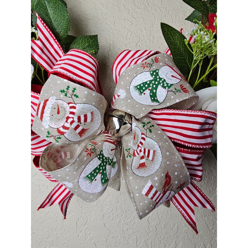 Christmas Snowman Wreath, Snowman Wreath, Winter Wreath, Farmhouse, Grapevine Christmas Wreath, Christmas Wreath, Snowman Bow Wreath, Wreath This beautiful handmade Wreath would be perfect on a door, front door, mantel, mailbox, or anywhere you would like to add seasonal decor! -This wreath is made with a grapevine wreath, 2 different types of wired ribbon, a bell, faux red and white roses, and greenery. -The measurements are approximately 22” wide and the total length is about 19” long. -All wreaths are handmade. Due to the movement during shipping, the ribbons may need to be re-shaped or fluffed to reach your desired look. Thank you!