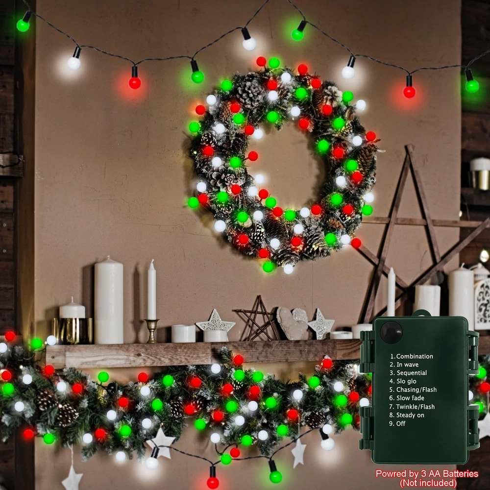 Christmas String Lights Battery Powered 16.4Ft 50LED Red Green White Globe String Lights with Timer 8 Modes Waterproof Fairy String Lights for Indoor Xmas Tree Holiday Party Outdoor Decor Sepcifications Wire material:PVC rubber LED Quantity: 50 Power Source:Battery Powered Cable Color: Green Light Color : Red Green White Size: 16.4ft Lead wire: 60CM (Approx.1.96 ft) Waterproof: IP54 8 Lighting Modes: Combination In wave Sequential Slo-glo Chasing/Flash Slow fade Twinkle/Flash Steady on Package included: 1 x Red Green White String Lights Globe String Lights: The total length of the green wire string light is 16.4ft, lead wire: 23.6 inch,two bulbs distance: 3.9 inch. Green wire design is perfet hidden inside the Christmas tree Red Green White String Lights:The fairy string lights feature 50 Globe red white green LED lights, which create a joyful festival atmosphere for Christmas Auto Timer Function:The LED string light will auto set a timer for 6 hours on and 18 hours off each day when you light up the string fairy lights,which could save energy costs and keep a long battery life Battery Power String Lights: The LED string light with battery box is portable to place anywhere you want, no need to find the socket. Powered by 3 x AA batteries(Not Included), 3V lower volt output, safe and free to touch for child and pet 8 Lighting Modes: Press the button of the battery box to choose the different mode to suit the different occasion Widely Application: Christmas color string lights is perfect for wrapping Christmas trees, wreaths, patios, hedges, fences, pillars. Good choice for increasing your holiday atmosphere for Christmas