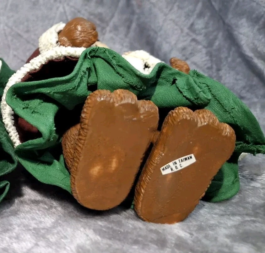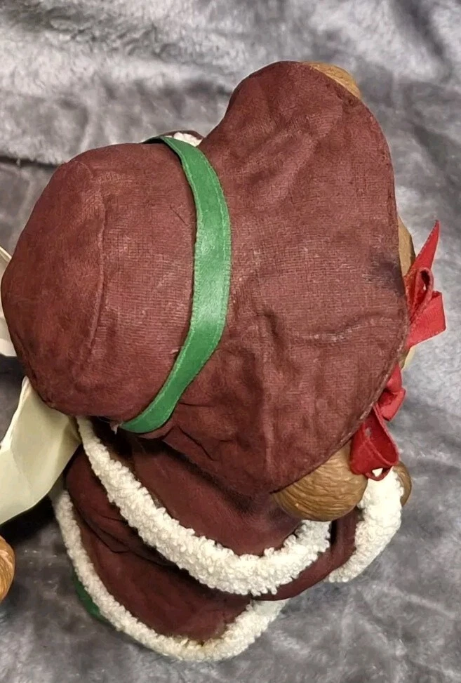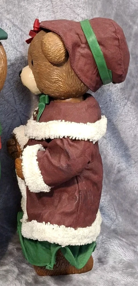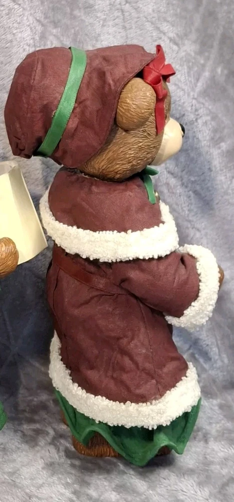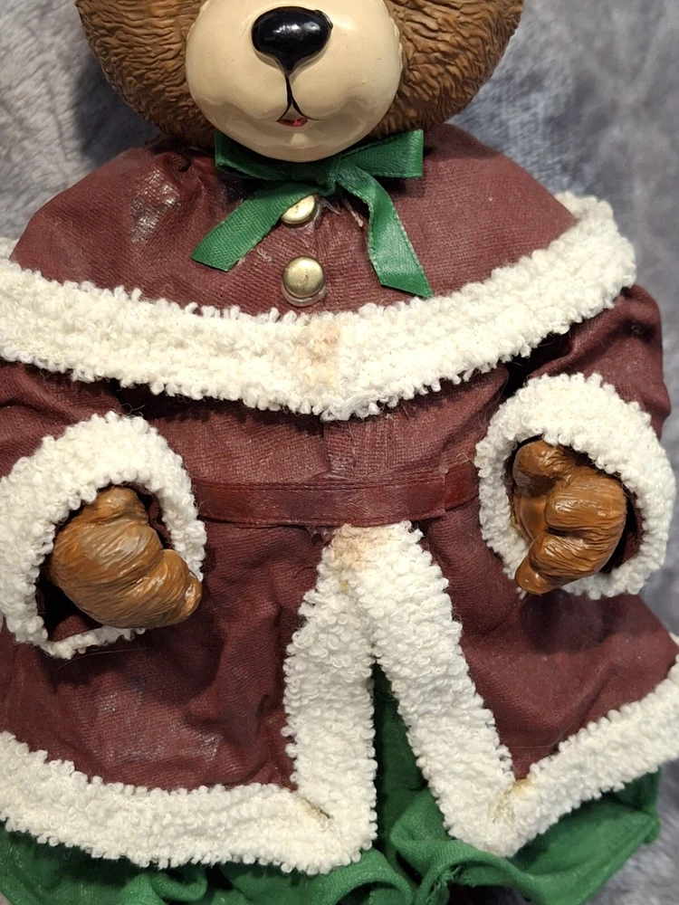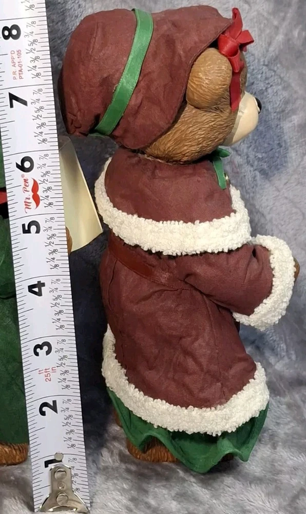 Mrs Bear Figurine Girl Green Red Christmas Teddy Bear Figure Holiday Decor See photos for measurements I consider this to be in good preowned condition I think she is made of a resin/ plastic and her clothes are cloth that has been stiffened - but I can't say this for sure Please view all photos zooming in on them as they are part of the description for you to judge condition. At one time, she may have had something in her hands