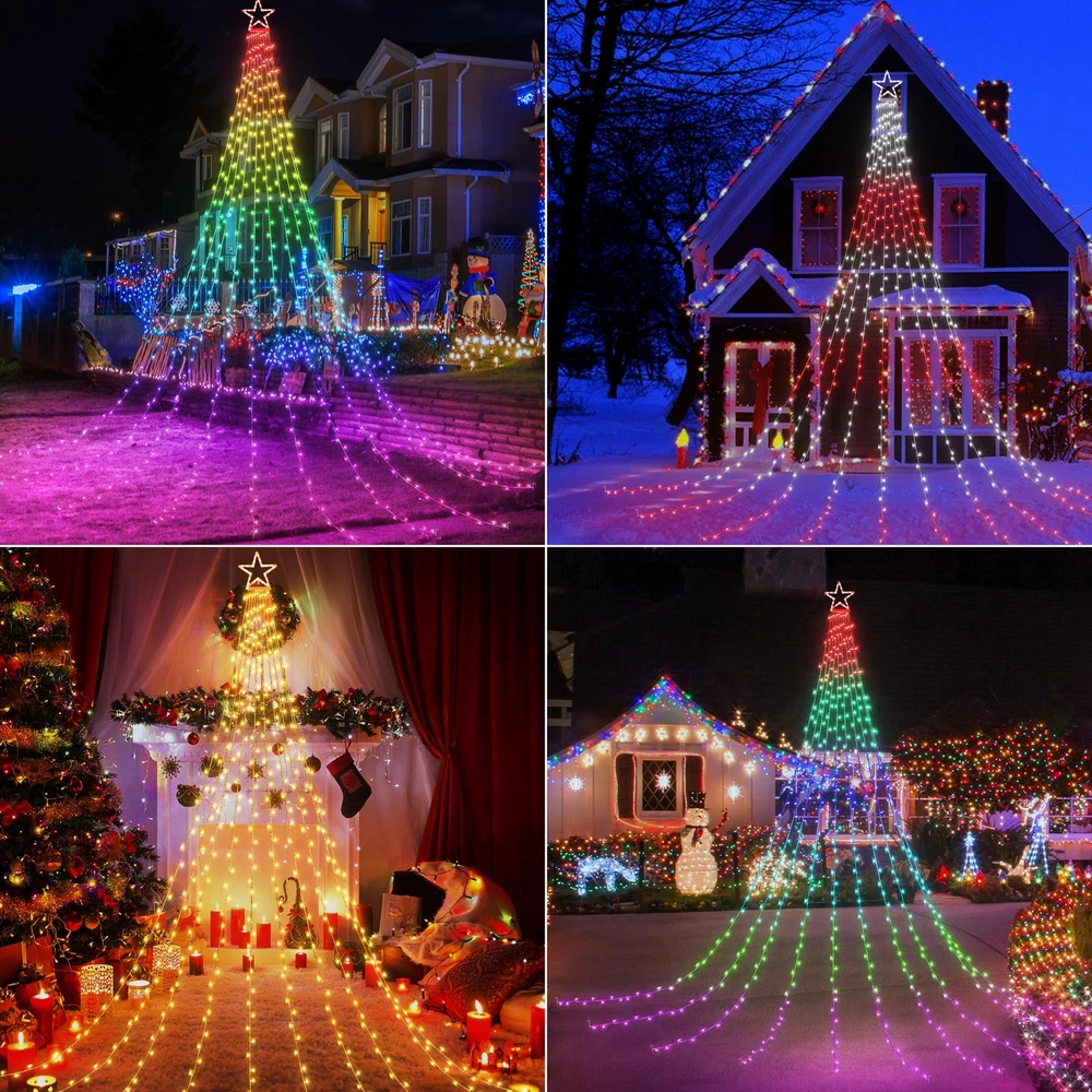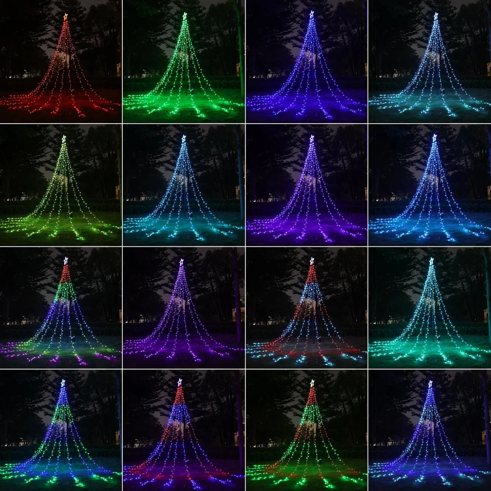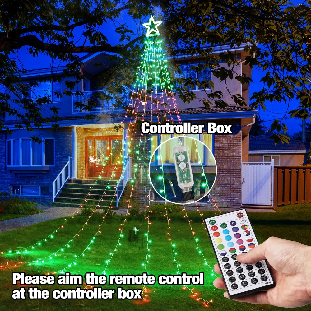 Various Colors and Modes: RGB color changing waterfall lights choose from 20 color options, including 13 single, 5 dual, and 2 multicolor. Each color offers 8 modes for dynamic displays for holidays like Christmas, July 4th, Halloween, St. Patrick's Day, and Valentine's Day 42-Key Remote Control: Use the remote to select colors, pick from 8 modes per color, adjust speed and brightness, and set a timer (4/6/8 hours). Remove the insulation sheet and aim at the green controller box when using the remote Adjustable Speed and Brightness: Customize lighting with 4 brightness levels (100%, 75%, 50%, 25%) and 4 speed settings in dynamic mode. The memory function retains your settings, eliminating the need for daily resets Timer Function: Timer options(4H/6H/8H). Press "4H" (4hrs ON,20 hrs OFF), Press "6H" (6hrs ON,18 hrs OFF), and Press "8H"(8hrs ON,16hrs OFF, then the circle repeats automatically. Press "TIMER OFF" and the timer will be canceled (Do not use timed power outlets) Easy to Use and Waterproof: The Christmas LED star waterfall lights with topper come with a low voltage plug for safety and low power use. Made with green wire and rated IP44 waterproof, suitable for both indoor and outdoor use Color-Changing Christmas Lights: Our decorative star string lights have 504 LED bulbs in total. 11.8 in Star Shape tree topper has 24 LED Bulbs; 10 Strands 15.4 ft string lights,each one has 48 LED, plug cable is 26ft length. Then have 10 pcs ground spike and 10 pcs tie tape Warm Tips: 1. These RGB tree lights cannot be connected end-to-end. 2. The white color has a slight blue tint. 3. Remove the insulation sheet from the remote and point it directly at the controller for proper functionality