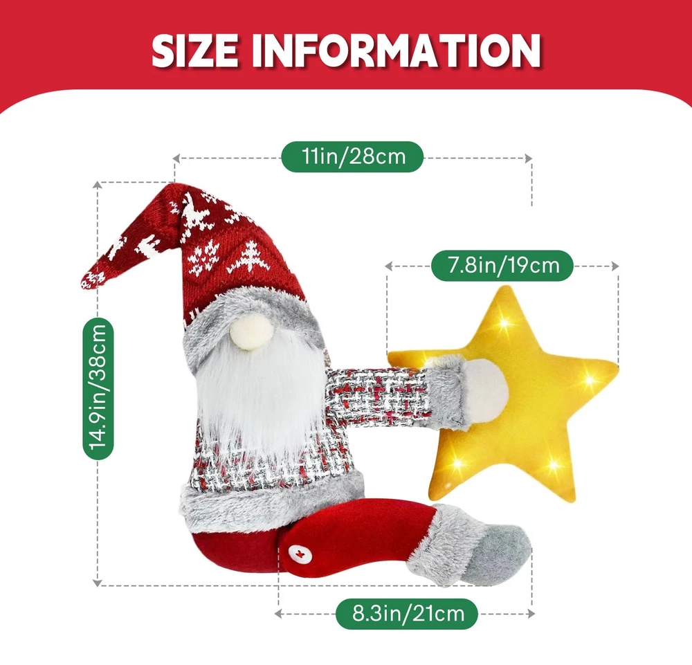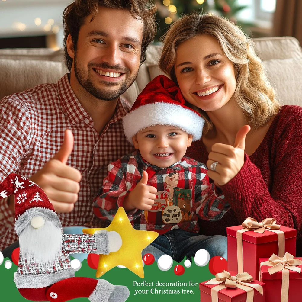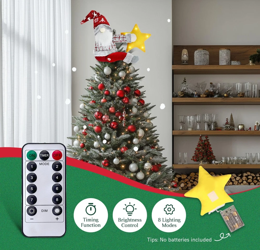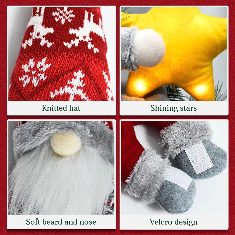 christmas tree topper, christmas tree toppers, christmas tree decorations, christmas tree star gnome tree topper, christmas gnomes christmas gnomes decorations, gnome christmas tree topper CHRISTMAS TREE TOPPER LIGHTED: This Funny Scandinavian gnome plush has a long white elegant beard, The red hat is printed with a Christmas tree and elk pattern, extra soft flexible and adjustable hands legs, Yellow stars that support 8 modes of illumination.bring you and your family more warmth this winter Unique Funny Christmas Tree Topper Gnome:This glowing dwarf Christmas tree decor features a dwarf who is 21.7 inches tall and 9.5 inches wide.diameter of the stars is 7.4 inches. The dwarf has velcro on his hands and legs, making it easy for him to hug the top of the Christmas tree. The knitted hat of the Christmas dwarf is equipped with flexible metal wires inside, allowing you to freely pose in different positions SUPPORT CONTROL OPERATION: The glow function of the Christmas Tree Top Star Dwarf decoration is on his yellow star. Simply open the zipper to remove the battery box and insert three AAA batteries (not included) to glow! Operation supports 8 modes, such as constant light mode, flashing mode, alternating mode, etc; Simultaneously adjustable brightness and timing function! It can also be operated directly from the battery box button VERSATILE DECORATION: This elegant Christmas gnome decoration can help you pull the curtains and let winter sunshine enter your room, bringing you warmth. He can also hold a red wine bottle and celebrate this festive holiday with you and your family! On winter nights, glowing dwarfs can bring warmth to your body and soul, as well as to your family. Light up your winter CHRISTMAS GIFTS: Gnome Christmas tree decorations with lights are often thought to bring good luck and warmth to the family. As a gift to your family or friends to express your blessings! Our commitment: If you have any problems after receiving the Gnome Tree Topper, such as the loss of the battery back cover, defective goods, lights not working or other dissatisfaction, you can contact us immediately, and we will help you solve the problem quickly and friendly