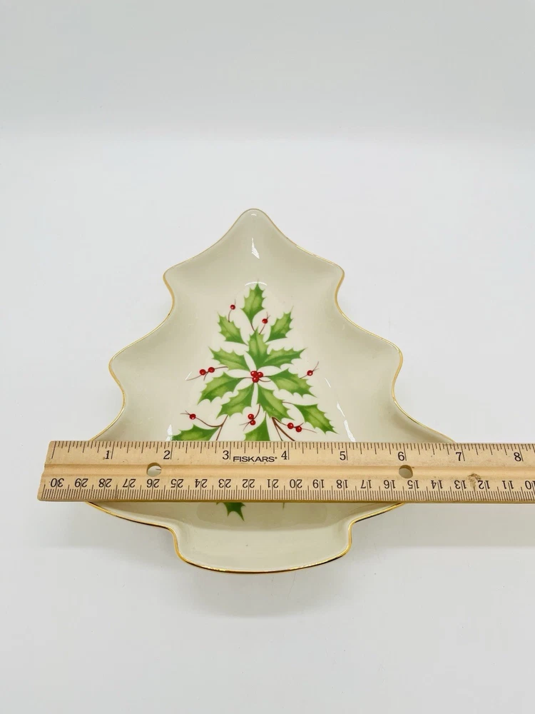 This beautiful Christmas tree trinket dish by Lenox is sure to add a touch of elegance to your holiday decor. Featuring intricate holy leaves and gold trim, this dish is made of high-quality porcelain, bone china, and ceramic materials. It was manufactured in 2006 and is part of the 2000-2009 time period. Perfect for storing small trinkets or jewelry, this multicolor dish is a great addition to any Christmas tree. Whether you're a collector of holiday memorabilia or just looking for a unique decoration, this Lenox trinket dish is sure to impress.