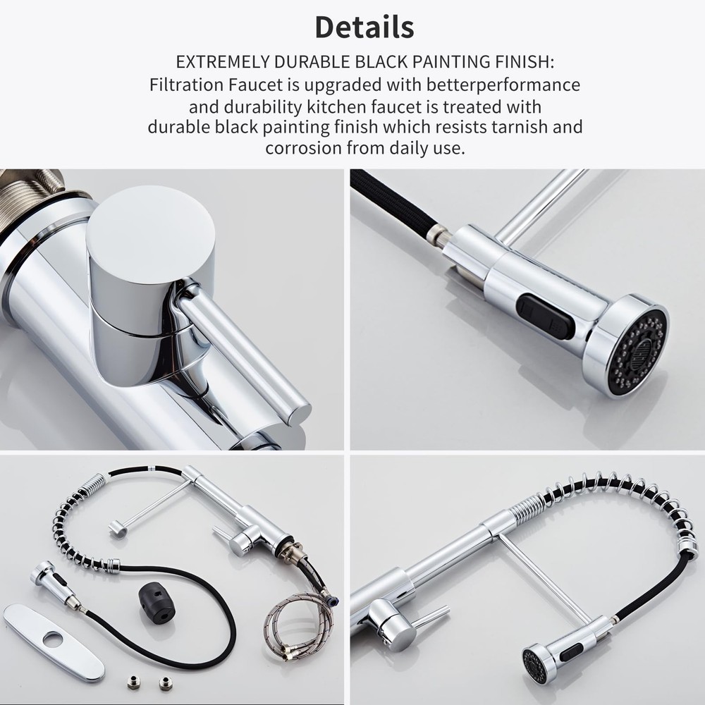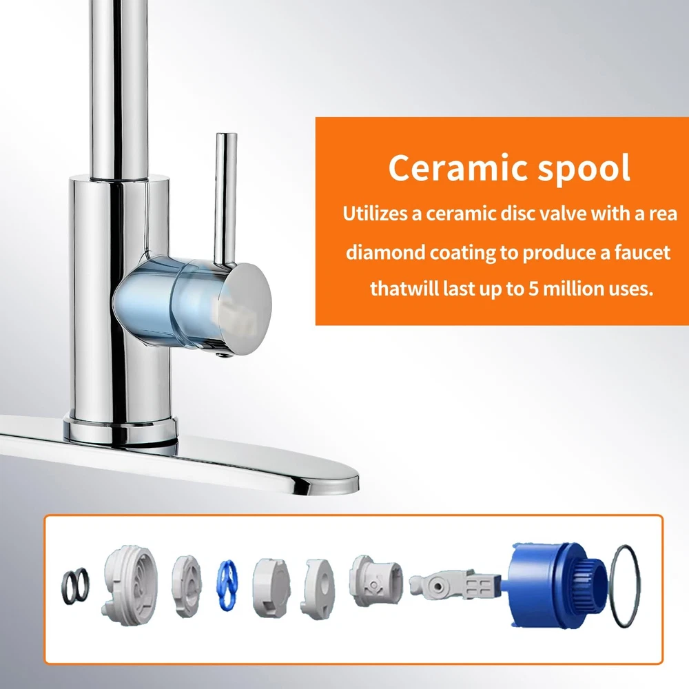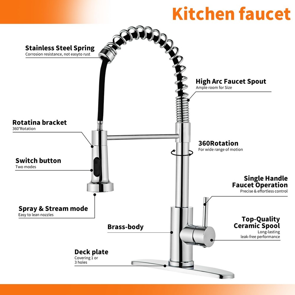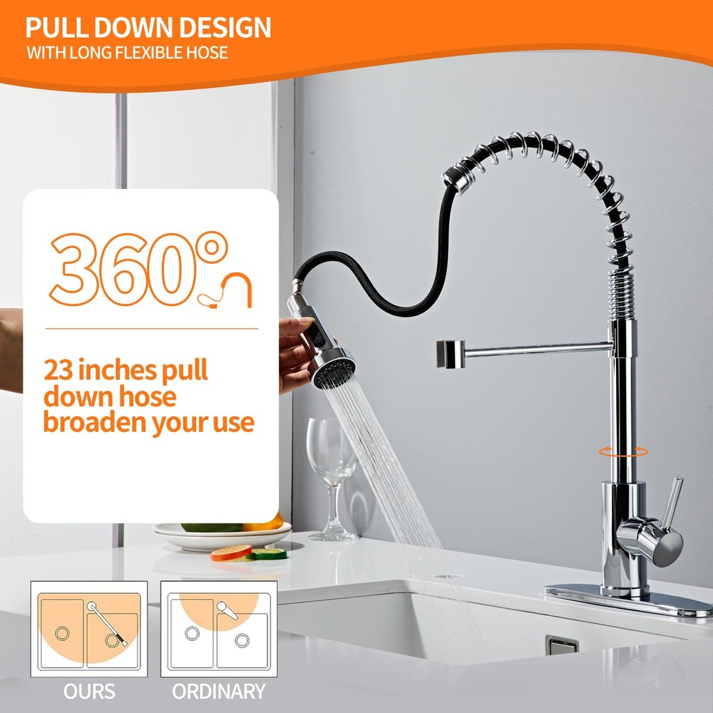 Pull down kitchen faucet has been made of premium SUS304 stainless steel without LEAD, which could provide reliable protection for water health together with the PEX inner hose. 【Stainless Steel Sink Faucet】:Pull down kitchen faucet has been made of premium SUS304 stainless steel without LEAD, which could provide reliable protection for water health together with the PEX inner hose. 【's Upgraded 4.0】:Drip-free ceramic disc mixing valve cartridge Technology utilizes a ceramic disc valve with a real diamond coating to produce a faucet that will last up to 5 million uses. That's an amazing 10 times the industry standard, guaranteeing a lifetime of leak-free, trouble-free performance. 【360 Degrees】:Sprayer features push button controls to move from an aerated stream to a powerful spray, Pause button able to stop the flow of water from the spray head without turning off the faucet, Spout swivels 360 degrees to cover the entire sink. if you prefer a clean sink deck without a sidespray or additional accessories, a pull out faucet may be the right solution. 【Dual Water Modes】:This kitchen faucet with sprayer features with 2 kinds of water modes in order to meet your daily cleaning needs, one is spray mode to rinse the dishes and sink for large area, and the other is stream mode for filling water accurately and quickly into the container without sputtering. 【Design for Your Kitchen】:This RV kitchen faucet features with clean lines and sleek looks will perfectly fit your kitchen, which can make your kitchen look very clean and comfortable. Please feel free to contact us if you have any other questions.