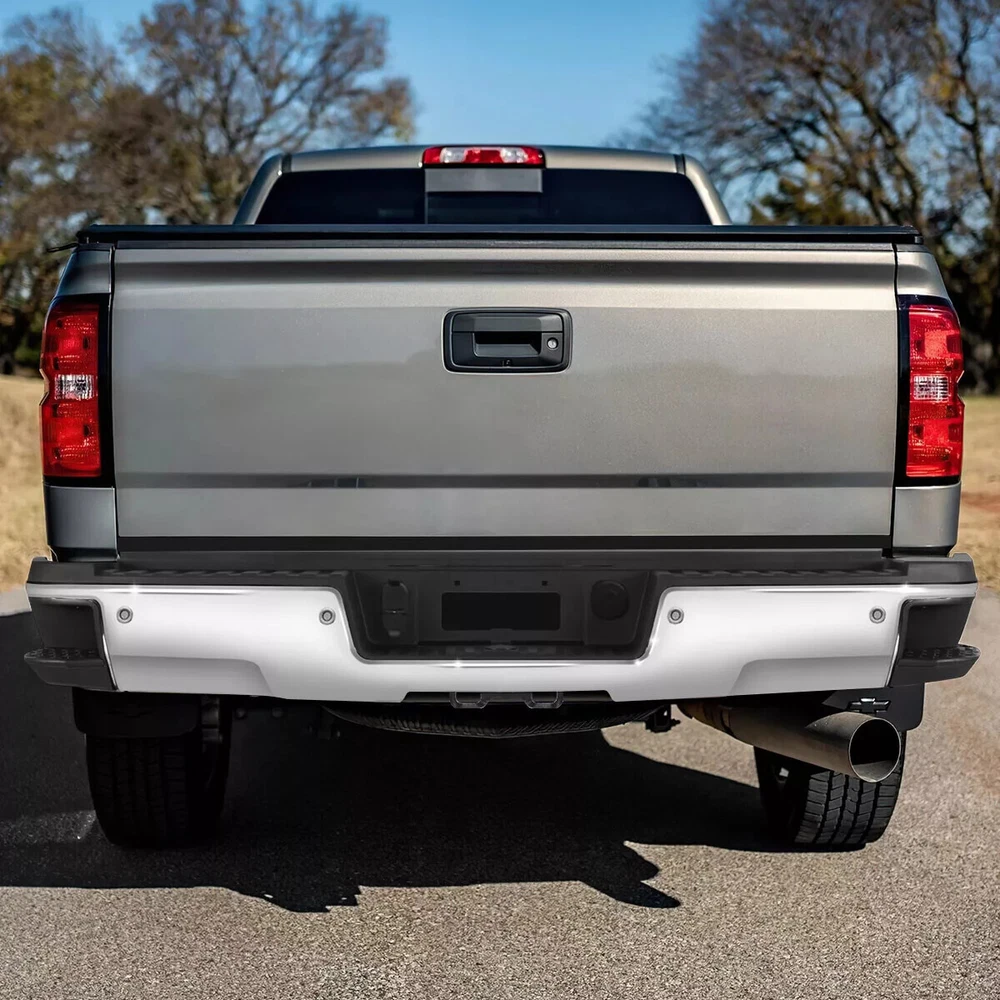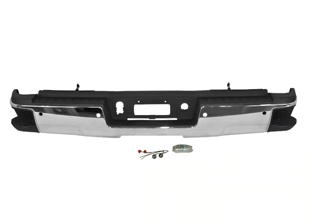Fitment: 2015-2019 Chevrolet Silverado 2500 HD 2015-2019 Chevrolet Silverado 3500 HD 2015-2019 GMC Sierra 2500 HD 2015-2019 GMC Sierra 3500 HD For Models With Park Sensors For Use With Factory Tow Hitch (Hitch Plate Not Included) High Polished Chrome Finish For Rear Single Wheel Models ONLY Includes Reinforcement, Brackets, Hardware, Lamps and Step Pad Direct OE Replacement