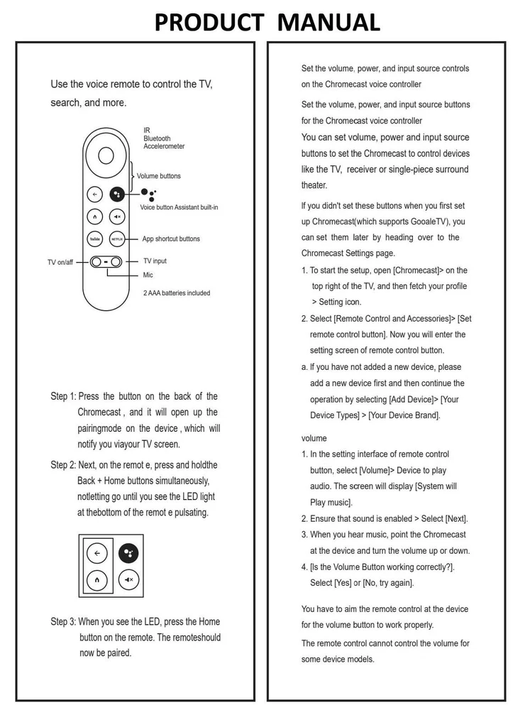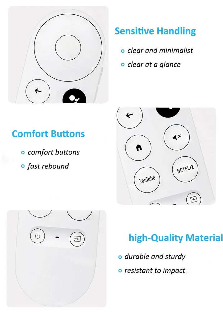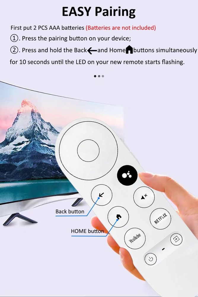 New Voice Remote Control for Google Chromecast TV 4K (Snow), Replacement Remote for Google Chromecast 4k Snow HD TV G9N9N GA01409-US GA01919-US GA01920-US GA01923-USGA01409-US 【WIDELY COMPATIBLE】Replacement Voice Remote Control for Google Chromecast 4k Snow HD TV,The function is the same as the original remote control, which is very suitable for replacing old remote controls or as a backup. 【COMPATIBLE Remote Control Model】Suitable for G9N9N, GA01920-US, GA01923-US, GA01719-US, GA02463-US, GA01409-US, GA202464-US. 【Intelligent Voice Function】Remote control allows for voice control, simply press the microphone button and say the keywords you want, such as lowering volume, playing music, etc., to control the TV. Please note that it is only compatible with voice enabled TVs. If your TVs do not support voice functionality, the remote control will not work and only one TV device can be connected at a time. 【EASY Pairing】First put 2 PCS AAA batteries (Batteries are not included), then Press the "Auto pairing" button on the google device, and when "Start pairing" is displayed on the TV screen, press and hold the BACK and HOME buttons on the replacement remote control. The LED light starts to flash, and then release the button to use the remote control. 【Sensitive Response】Built in intelligent upgrade chip, quickly response in 0.2s between TV and remote. Precisely control far from 40 feet, ABS durable material, sensitive and comfortable buttons. 【YOU Need KNOW】1. The voice remote control needs to be manually matched; 2.You need to put in 2 AAA batteries for the remote control to work (note that the package does not include Batteries). 3.Please note that it is only compatible with voice enabled TVs. If your TVs do not support voice functionality, the remote control will not work. 4.Only one TV device can be connected at a time. Shipping We offer FREE shipping on all orders! We ship within Three business days of payment, usually sooner. We use a selection of shipping services such as UPS, FedEx, USPS etc. We only ship to the lower 48 states, no APO/FPO addresses or PO Boxes allowed. Local pickups and combined shipping options are not provided at this time. Return You can return a product for up to 30 days from the date you purchased it. Please send us an eBay message for dedicated return support. Any product you return must be in the same condition you received it and in the original packaging. Please keep the receipt. Payment We accept payment by any of the following methods: PayPal, eBay Checkout Please pay as soon as possible after winning an auction, as that will allow us to post your item to you sooner! Feedback Customer satisfaction is very important to us. If you have any problem with your order, please contact us and we will do our best to make you satisfied. Contact Us If you have any queries, please contact us via ebay. We usually respond within 24 hours on weekdays. Please visit our eBay store to check out other items for sale! Thank you for shopping at our store.