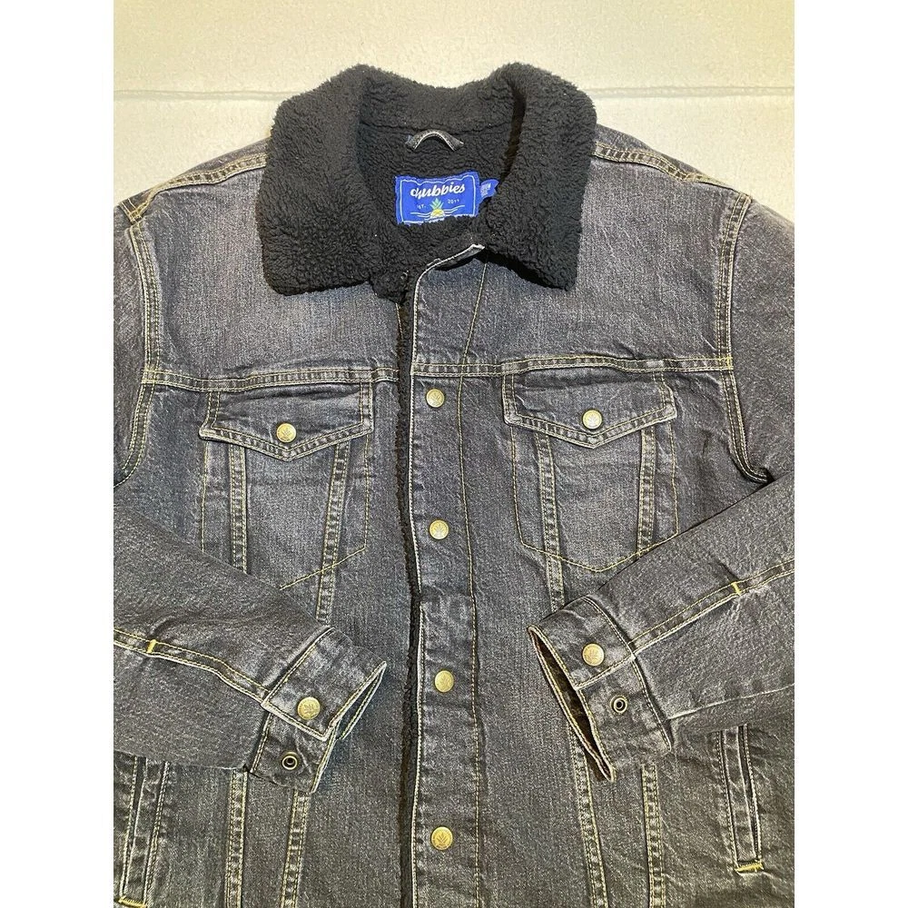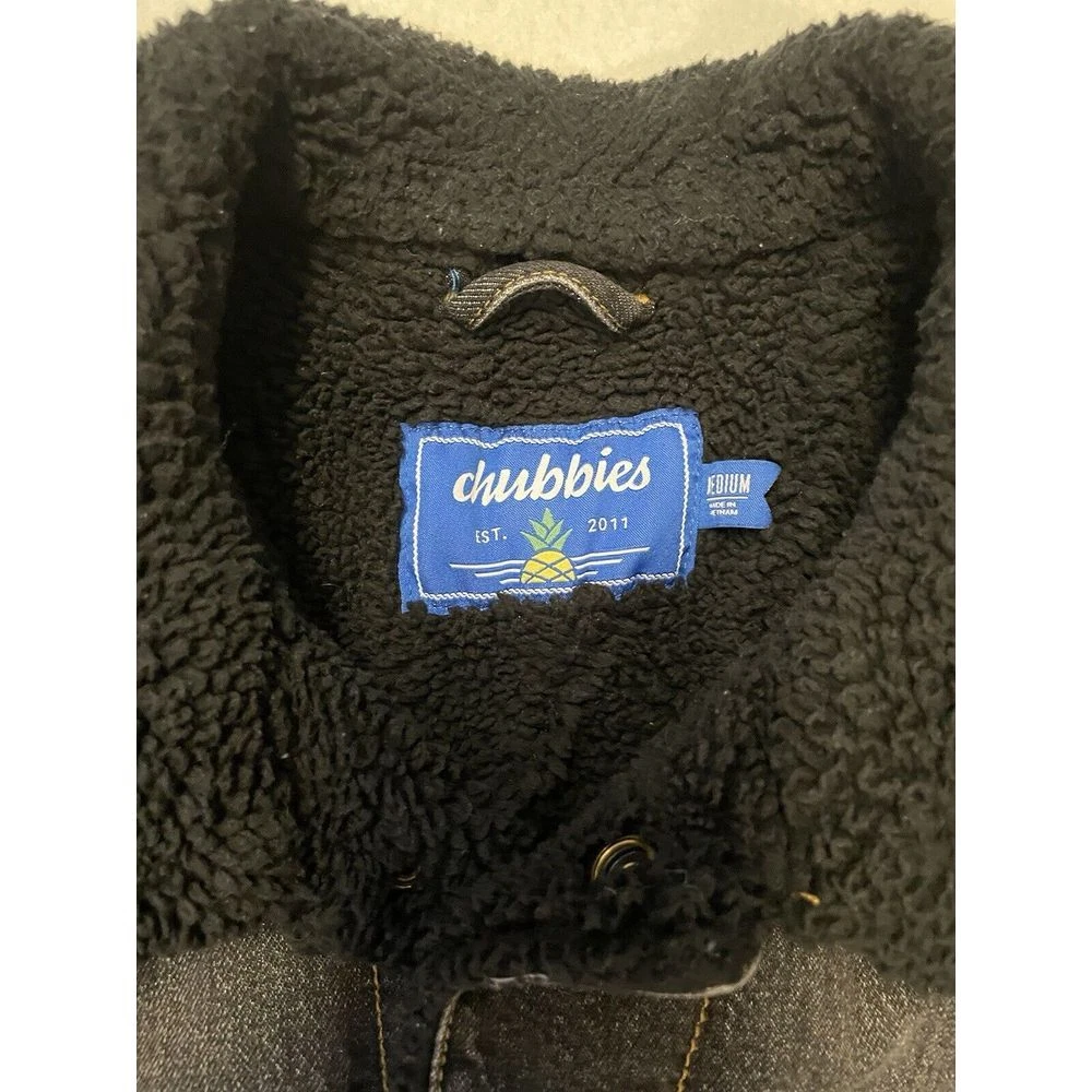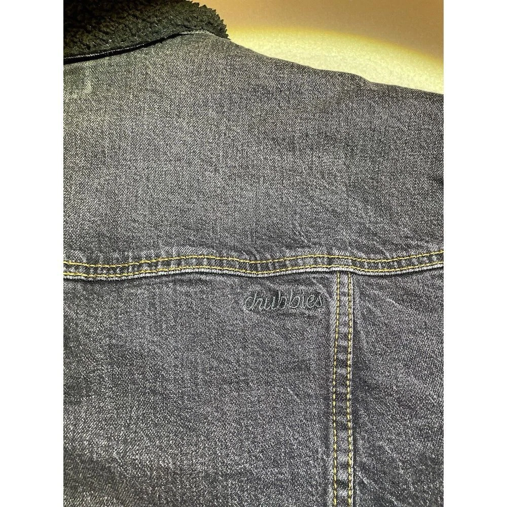 -Used. Sold as is -FITS LIKE A SIZE LARGE** -See photos for measurements -Fast shipping!!! Both stylish and functional, the Chubbies Denim Jean Jacket in a versatile black color is a wardrobe essential for those who appreciate a blend of classic and contemporary. Lots of very impressive stitching and added details. The mid-length Trucker style jacket is Sherpa lined and extra warm! Ensuring warmth during the cooler seasons of fall, spring, and winter.
