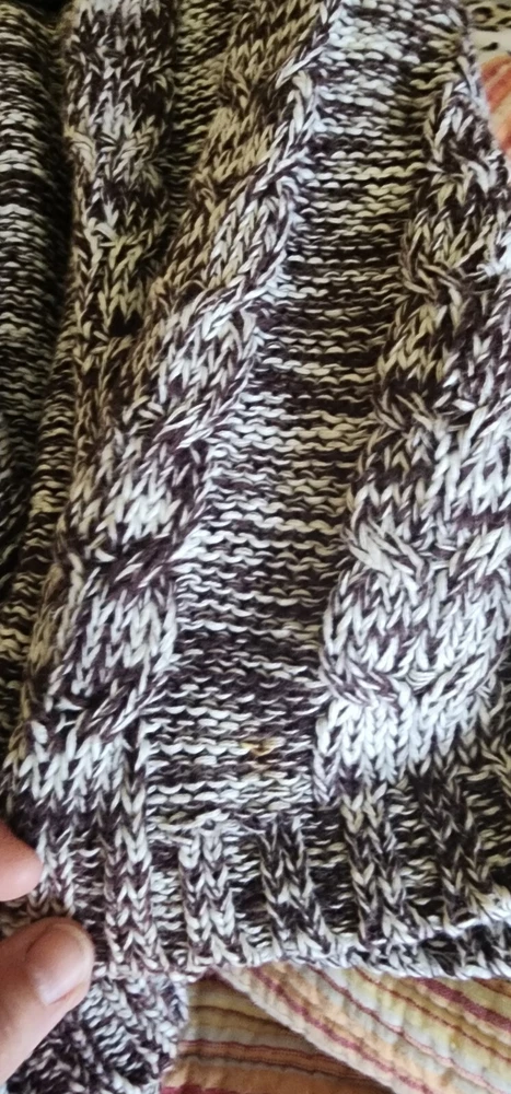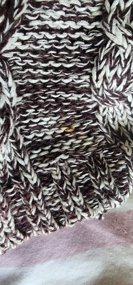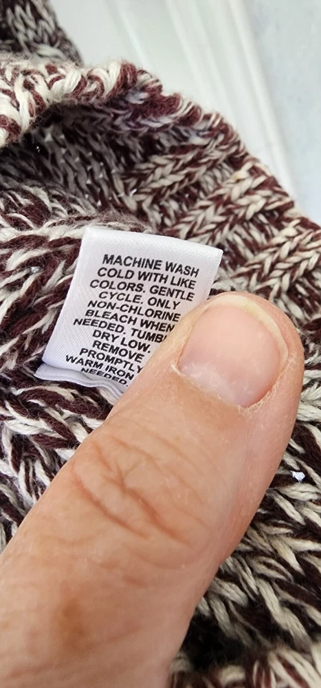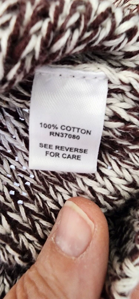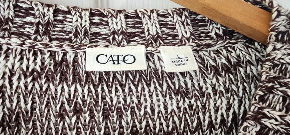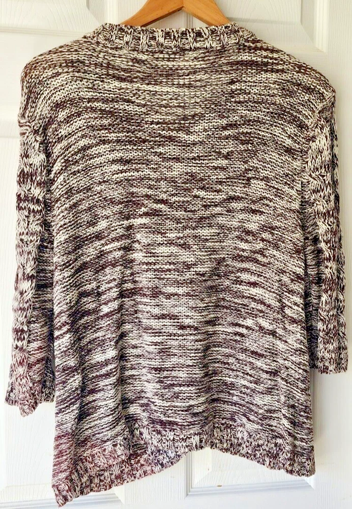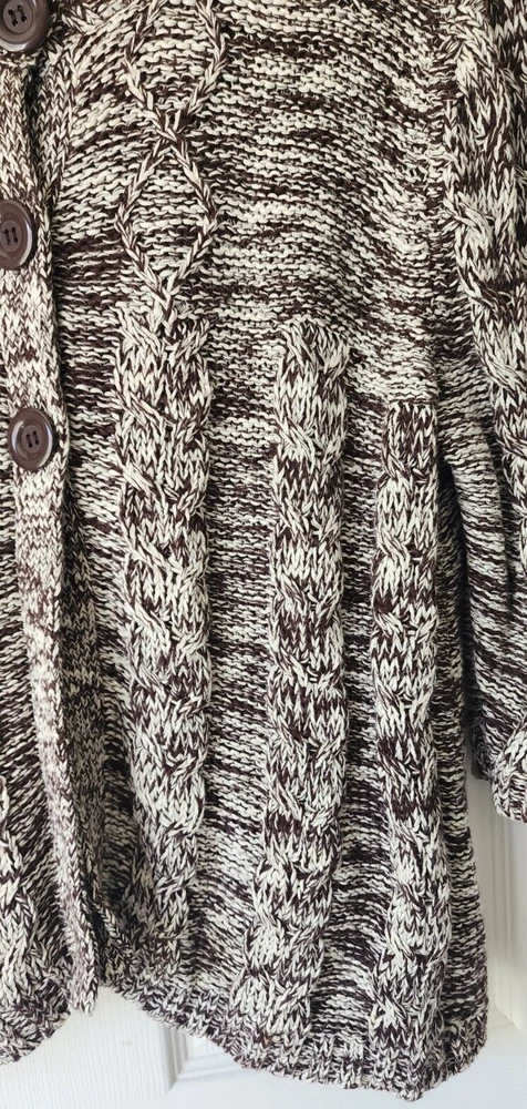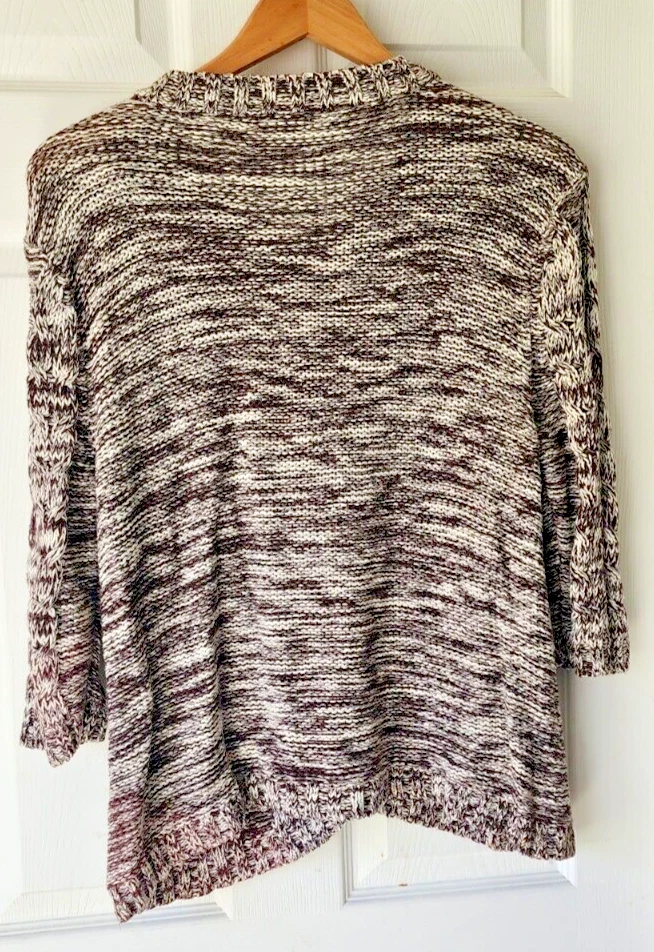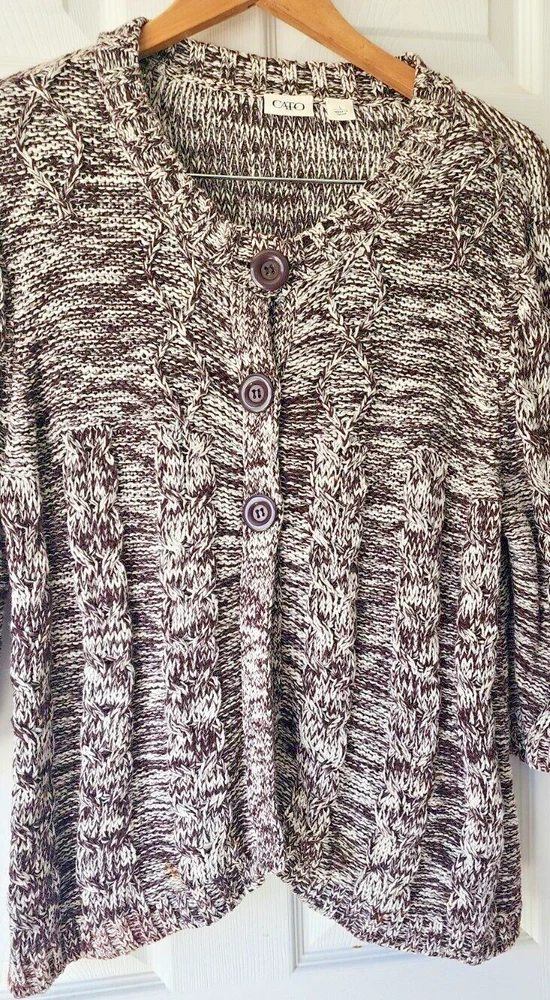 100% cotton Cato Bolero Cardigan Chunky Knit Brown/Cream Sweater. It is lightweight and stretchable, providing comfort and style at the same time. Raglan sleeve cardigan features a round neck and a crocheted fabric type with buttons as accents. The cardigan is available in size L and is fit for regular size type. The sweater is machine washable, making it easy to maintain and keep clean. Measurements Chest 22 " (Double=44") Length 23" Very Good Condition w/ very small stain that iis noticeable up close (last 2 pictures)