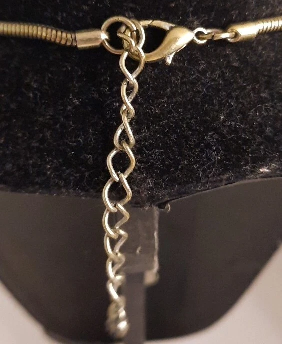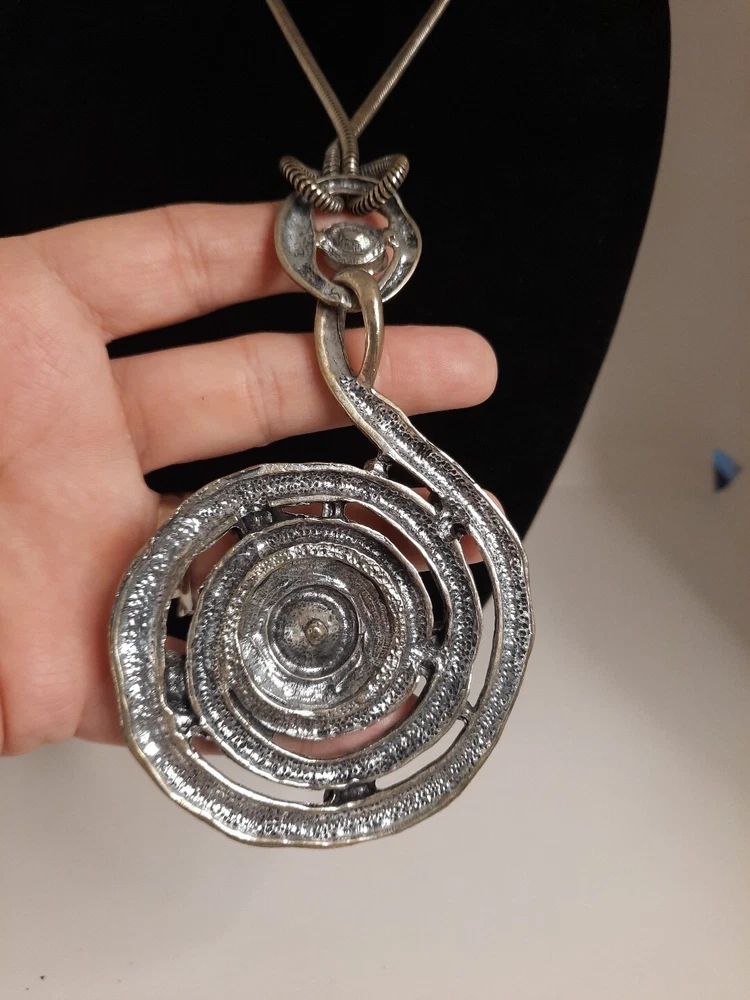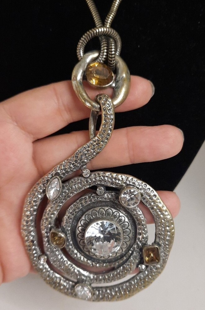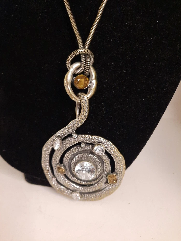 This vintage estate necklace features a chunky spiral cord with a lobster closure and a clear glass beaded chain. The pendant is an amulet style with a round citrine rhinestone and clear rhinestone accents. The necklace is 32 inches long and made of clear rhinestone and glass. The style is bold and beaded, perfect for adding bling to any outfit. The necklace has a beauty, art, and awareness theme and is a unique addition to any jewelry collection. Silver tone.