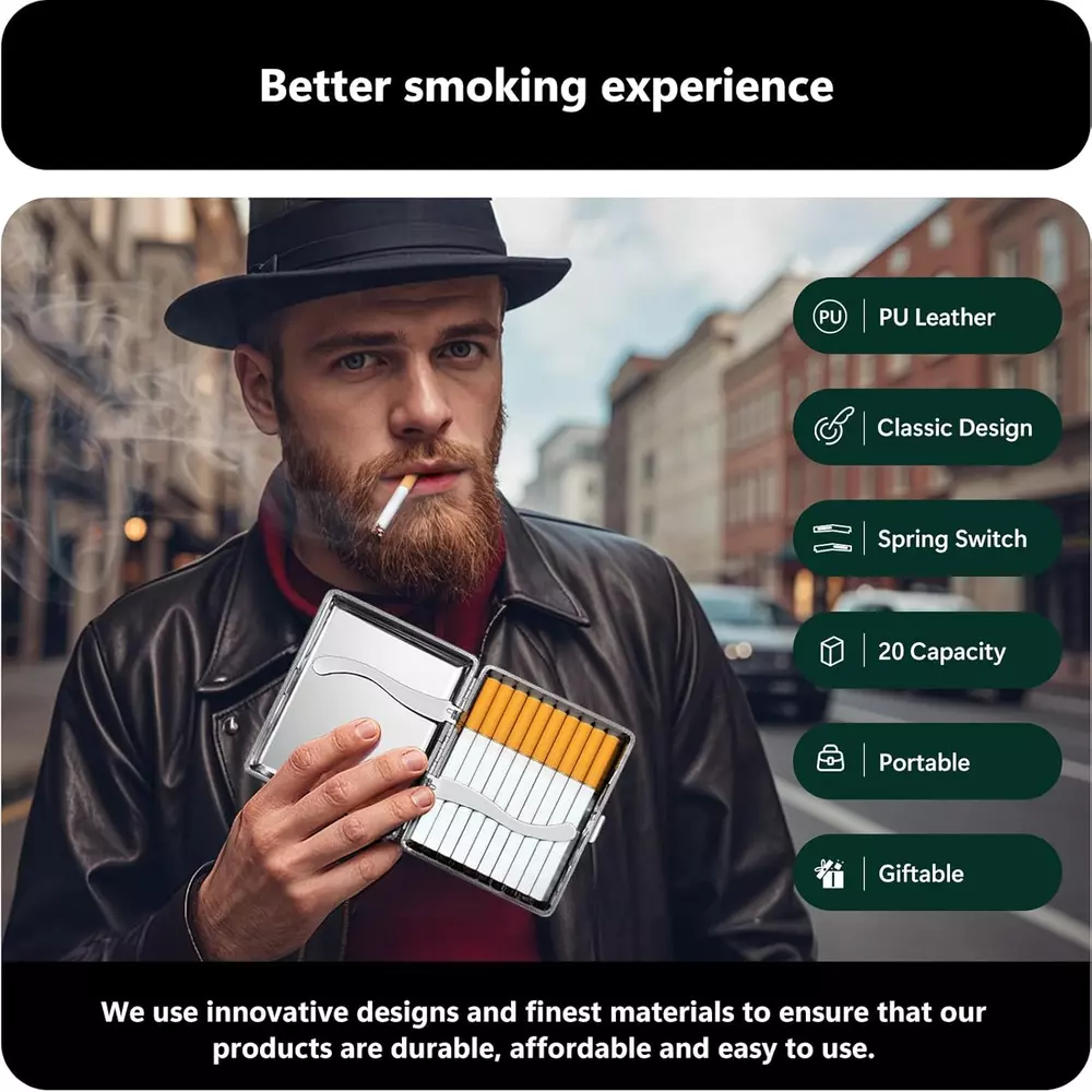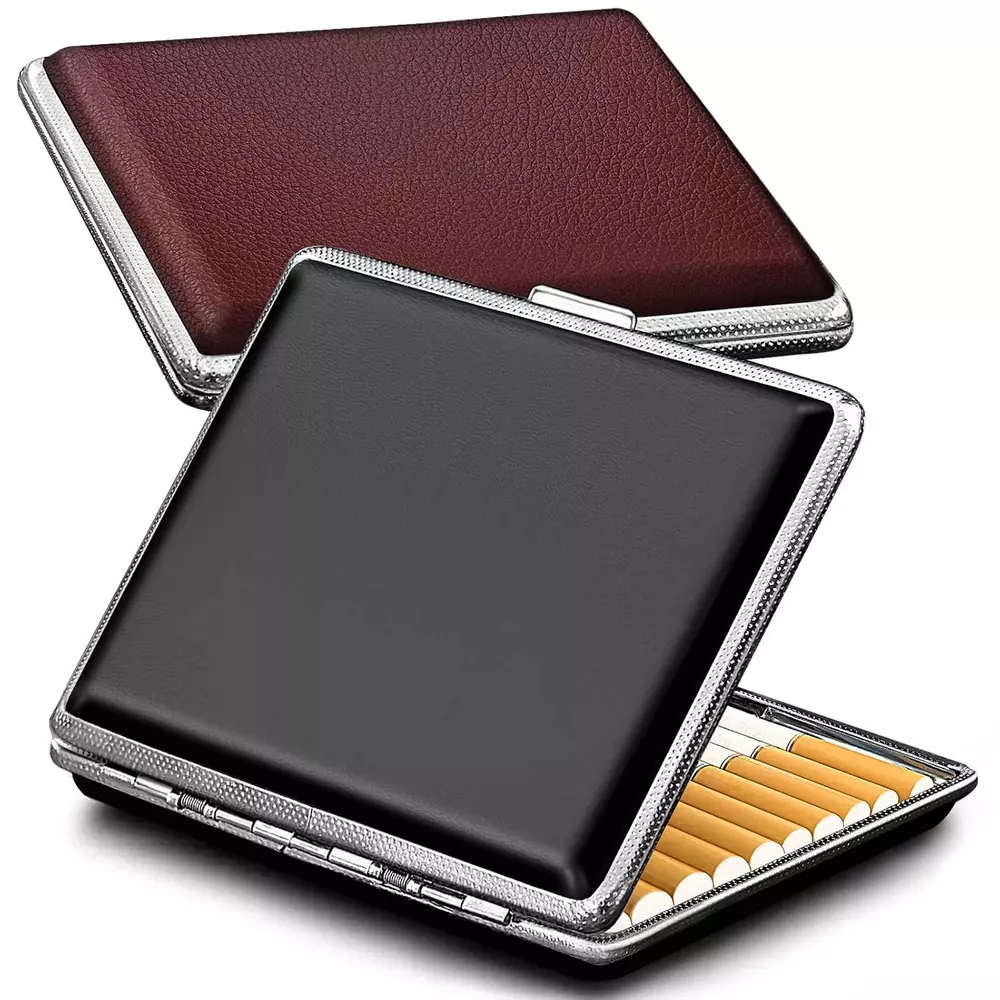 Include Content: Get 3 cigarette case (packaged in exquisite gift box), suitable for personal use and gift giving. Quality Materials: Exterior is made of PU leather and the interior is made of metal, surface is very smooth and the structure conforms to ergonomics. Cigarette Type: Suitable for Regular, King and 100's Size. Can not fit 120mm cigarettes. Design Highlights: Moisture and pressure prevention, can hold 20 cigarettes. Using mechanical switches, double sided spring clip open. Applicable scope: Roygra cigarette case can be used in patio, homes, offices, outdoors, balconies, bars, cafes, hotels, and more. Product Description The video showcases the product in use. The video guides you through product setup. The video compares multiple products. The video shows the product being unpacked.