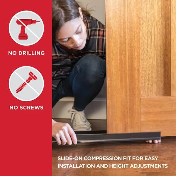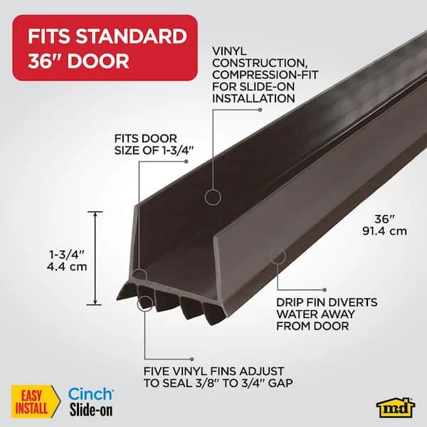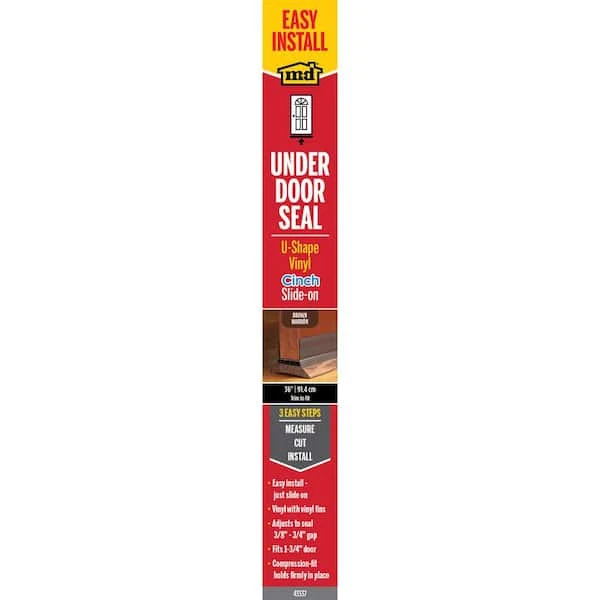 The M-D Vinyl U-Shape Cinch Slide-On Under Door Seal features vinyl fins for protection from drafts, moisture, dust and insects. Save on energy by sealing the bottom of the door and keeping the heat or air conditioning from escaping. Cinch products are easy to install since they do not require hardware and simply slide on to the door. A compression fit secures the Under Door Seal to the bottom of the door. Before installation, cut to desired length using a hacksaw.