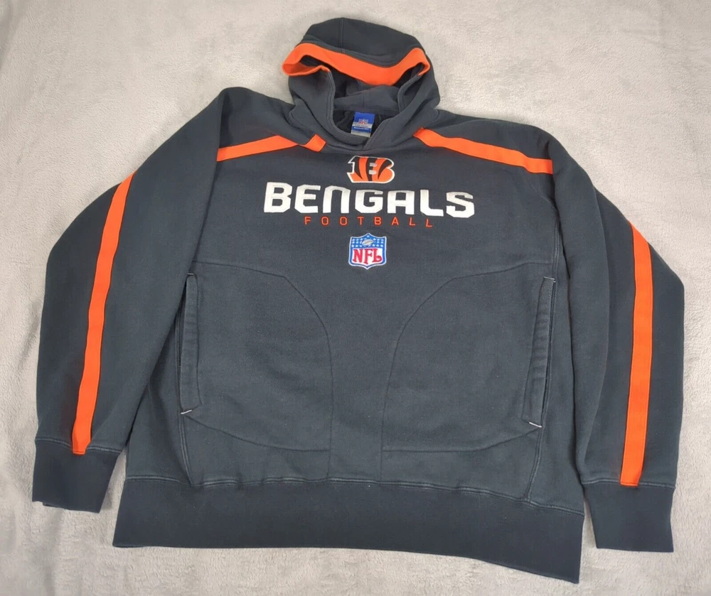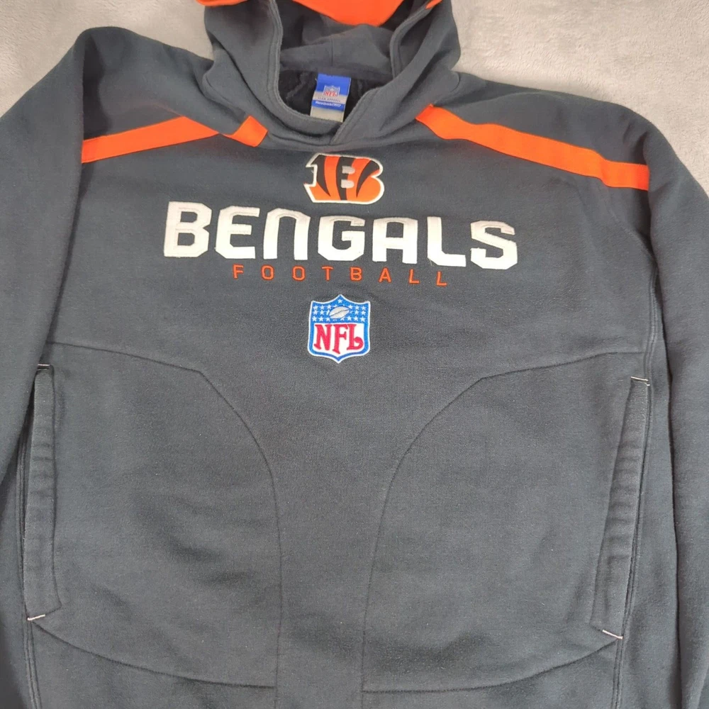 Show your love for the Cincinnati Bengals with this NFL Reebok sweatshirt hoodie. The gray pullover features a graphic print of the team's logo and is made of a comfortable and breathable knit fabric, perfect for any season. The hoodie comes with a hood, long sleeves, and pockets for added convenience. Description may be generated by AI. · Ships within 24 hours · Free 30 Day Returns · Contact us via message for prompt resolution with any issue