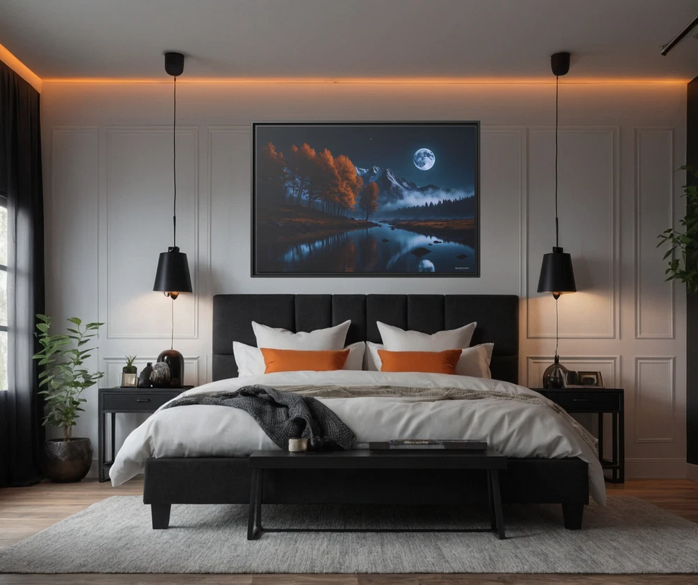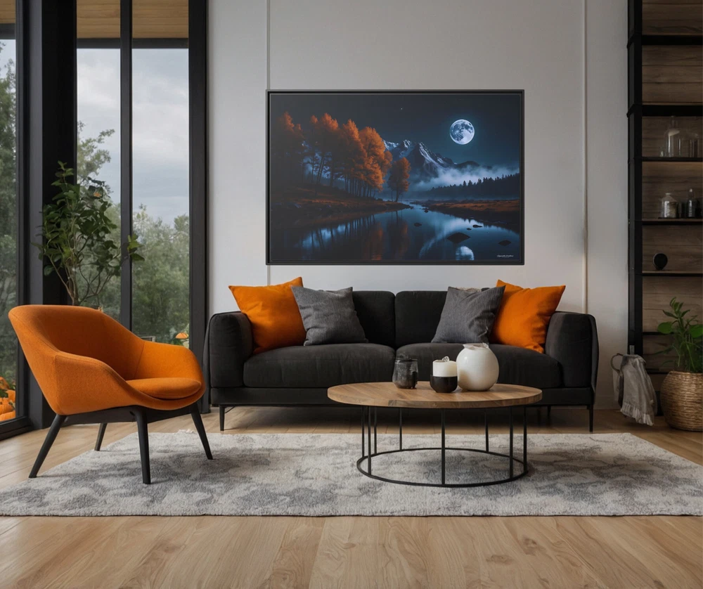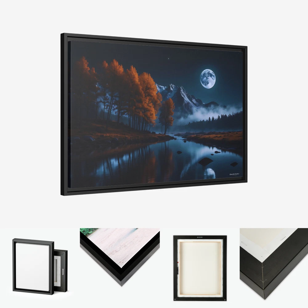 Moody Moonlit Mountain Lake Landscape Illustration Product Description : Immerse yourself in the dramatic beauty of nature with this Moonlit Mountain Lake Landscape Illustration by Hypnotik Creations. This breathtaking piece captures the moody allure of a serene full moon illuminating a tranquil lake with a perfectly still and reflective surface. Framed by rugged rocky mountain peaks in the distance, the landscape transitions into lush pine forests cascading down the slopes on one side and vibrant orange autumn foliage gracing the opposite edge of the lake. With its rich, dark color palette dominated by deep blues and fiery oranges, this photography-inspired illustration brings the raw beauty of the wilderness to life. Expertly printed in HDR on museum-quality cotton-polyester composite gallery-wrapped canvas, this artwork features a proprietary matte finish coating that enhances vibrancy and ensures long-lasting, eye-catching detail. Using UL-certified Greenguard Gold latex inks that are non-hazardous, non-toxic, and non-flammable, the artwork guarantees unmatched quality while being safe for any environment. Encased in a 1.25" solid pine wood frame with a sleek black finish, the canvas creates a stunning floating effect that elevates its aesthetic appeal. Made from sustainably sourced Forest Stewardship Council-certified materials, the frame is an eco-friendly choice that aligns with modern sustainability values. The piece arrives ready to hang, complete with sawtooth hanging hardware pre-attached and rubber dots on the bottom to keep it securely in place. Key Features : Breathtaking Design : Features a tranquil full moonlit lake surrounded by rocky peaks, lush pine forests, and vibrant autumn foliage. Photography-Inspired Art : Dark, rich color palette dominated by deep blues and warm oranges for a striking visual impact. Museum-Quality Canvas : Printed in HDR on a premium cotton-polyester composite gallery-wrapped canvas with a proprietary matte finish coating for long-lasting vibrancy. Eco-Friendly Materials : Crafted with UL-certified Greenguard Gold latex inks and sustainably sourced Forest Stewardship Council-certified pine wood. Elegant Framing : 1.25" solid black pine wood frame provides a modern floating effect to enhance any interior space. Ready to Hang : Comes with pre-attached sawtooth hanging hardware and rubber dots for stability. Durable and Safe : Uses non-hazardous, non-toxic, and non-flammable inks; canvas can be gently wiped with a clean, damp cloth to maintain its beauty. Slight Size Variations : Due to the production process, allow for size deviations within +/- 1/8" (3.2mm). Transform your space with this striking depiction of nature’s untamed beauty. Ideal for nature enthusiasts and art lovers, this captivating piece creates a tranquil yet dramatic focal point in any setting. * Shipping to Alaska, Hawaii, and unincorporated territories of the United States can take additional 7 ? 12 business days, weather permitting.