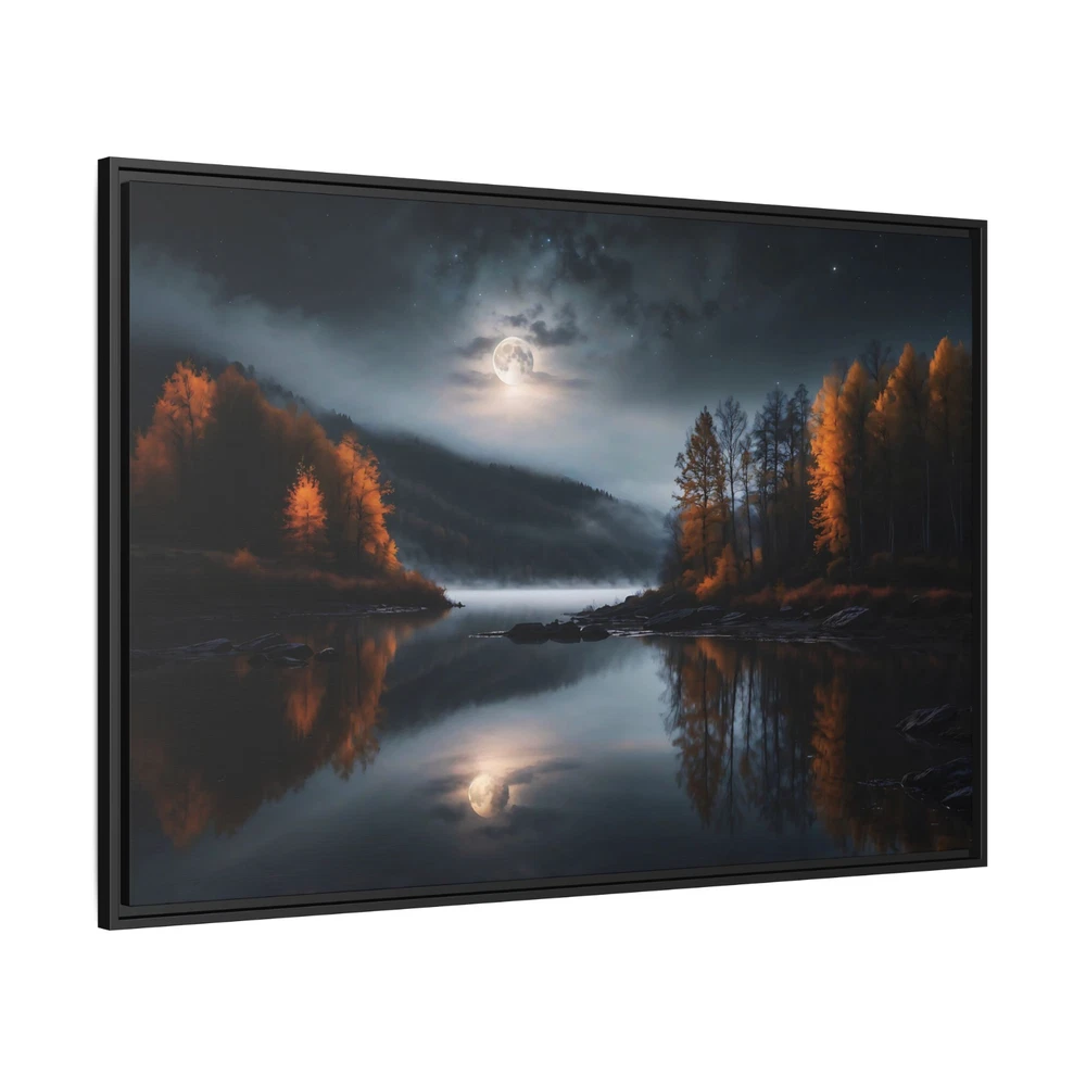 Moonlit Autumn Serenity: Cinematic Landscape Art on Framed Canvas Transform your space with the evocative beauty of Moonlit Autumn Serenity , a cinematic illustrative art piece capturing the tranquil charm of a moonlit mountain lake nestled amidst vibrant autumn foliage and a serene forest. The moody atmosphere and intricate details create an immersive experience, making this artwork a centerpiece that inspires relaxation and connection to nature. Expertly printed on museum-quality, eco-friendly cotton-polyester canvas , this masterpiece showcases crisp colors and a rich depth of detail that enhance its visual impact. The black handcrafted pine wood frame complements the artwork, adding sophistication while ensuring durability. This framed canvas arrives ready to hang , making it an effortless way to bring the serene essence of autumn into your home or office. Key Features: Cinematic Design: Captures a moonlit mountain lake surrounded by autumn foliage and a tranquil forest. Premium Materials: Printed on museum-quality, eco-friendly cotton-polyester canvas for exceptional detail and color vibrancy. Handcrafted Frame: Encased in a black handcrafted pine wood frame, offering a sleek and durable finish. Ready to Hang: Convenient pre-installed hanging hardware for effortless installation. Eco-Friendly: Crafted with sustainable materials, perfect for the environmentally conscious. Size Options: 30x20, 36x24 & 48x32 Experience the serene allure of nature with this Moonlit Autumn Serenity art piece, a perfect blend of elegance and tranquility. * Shipping to Alaska, Hawaii, and unincorporated territories of the United States can take additional 7 ? 12 business days, weather permitting.