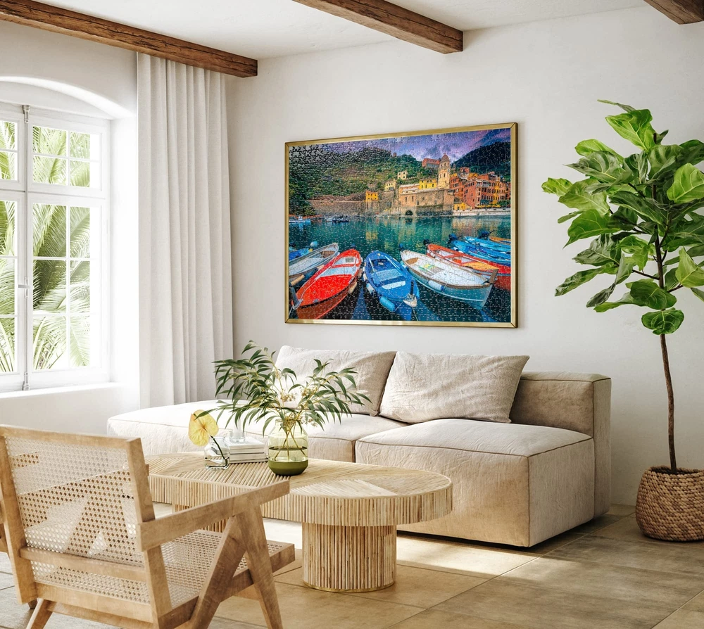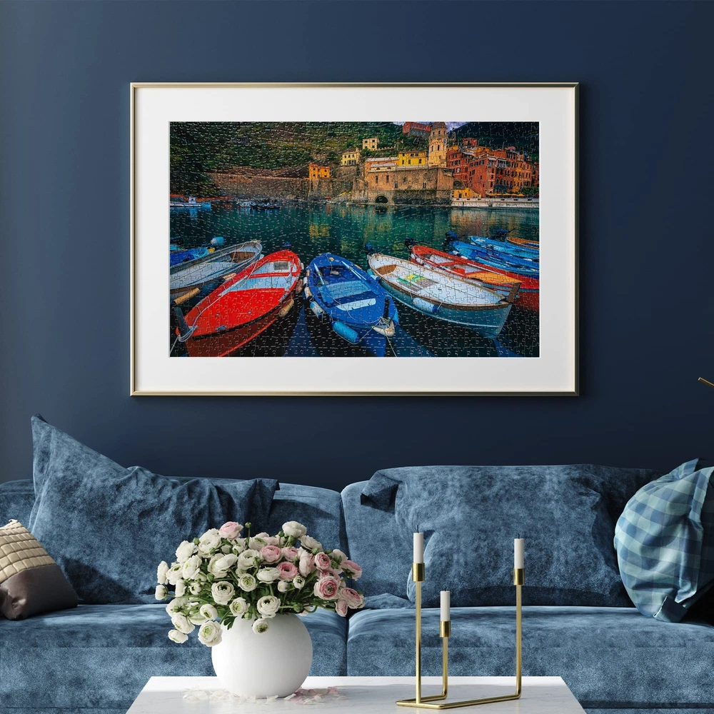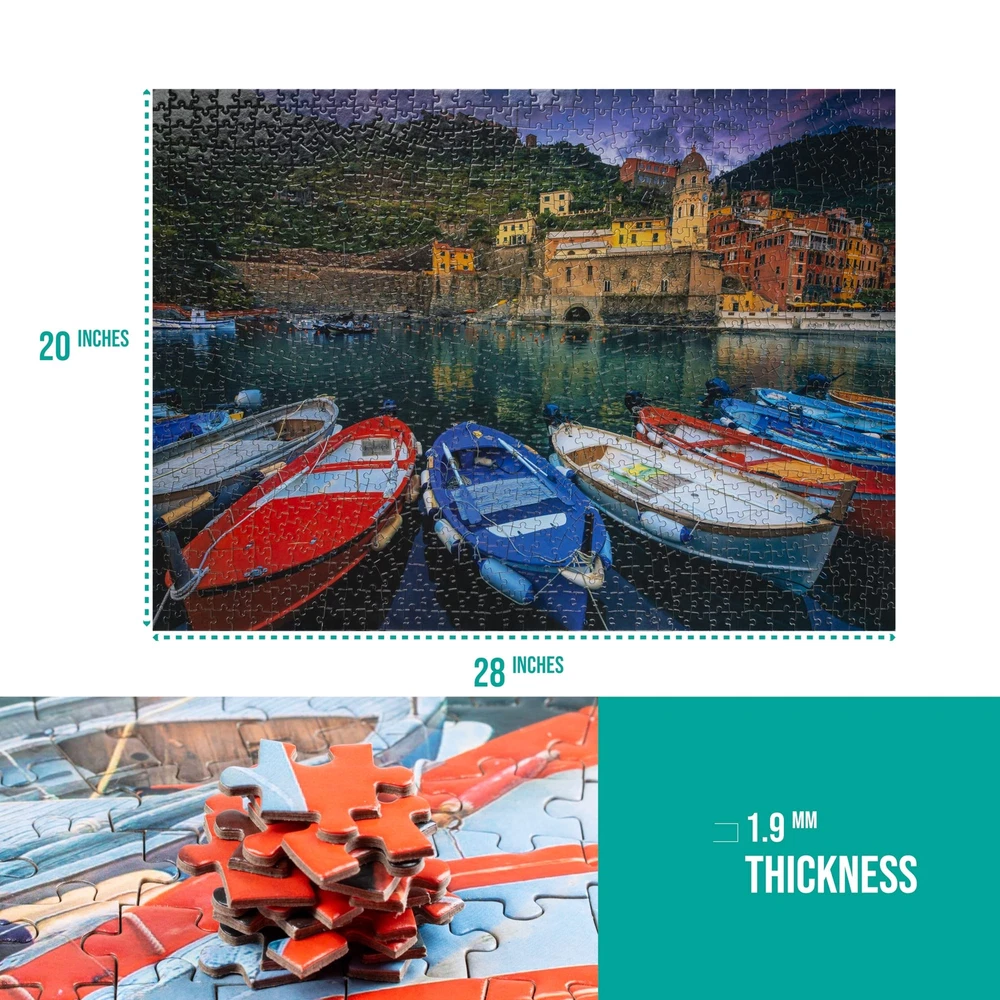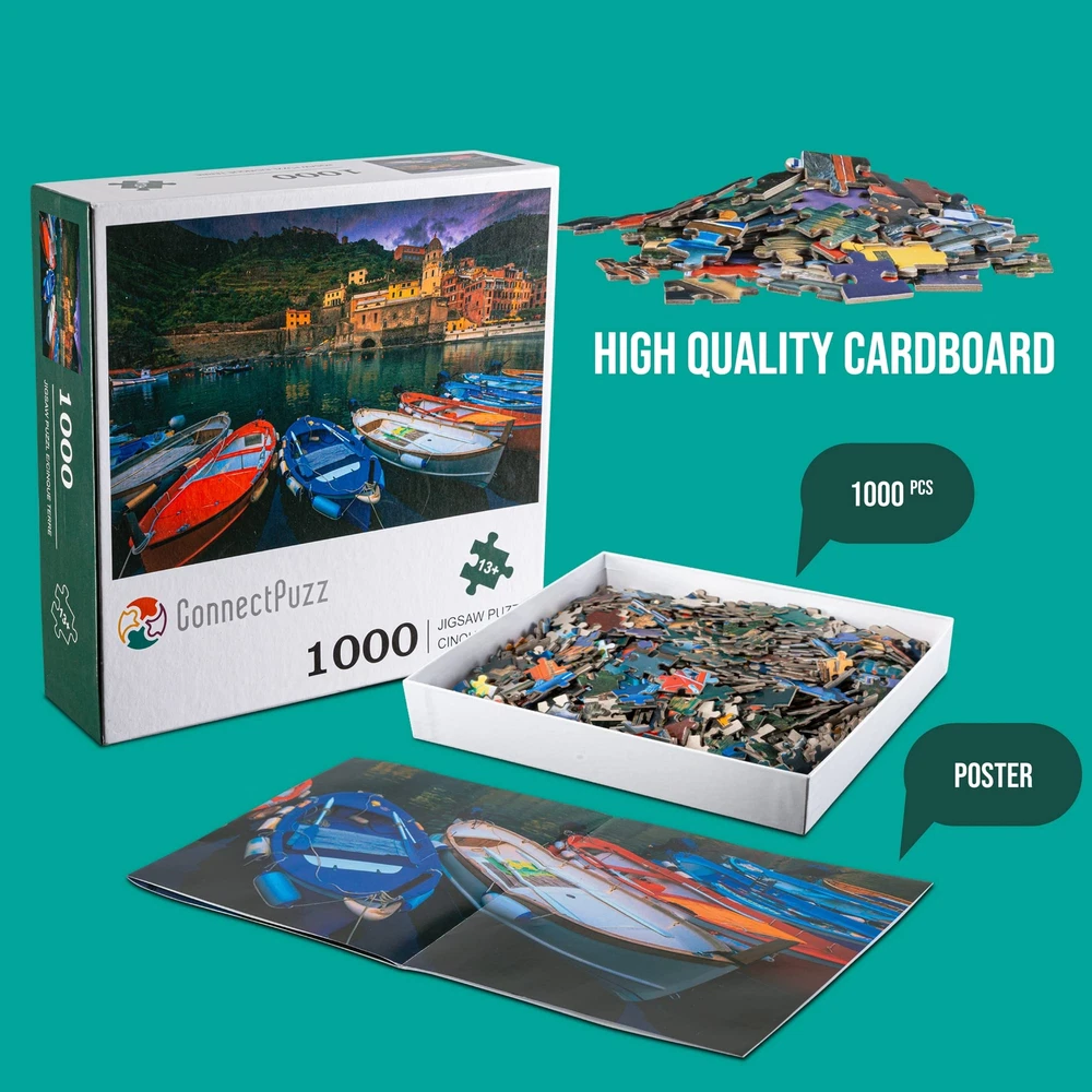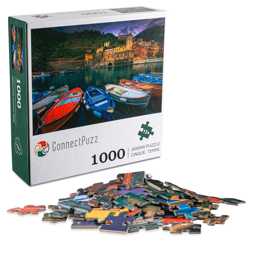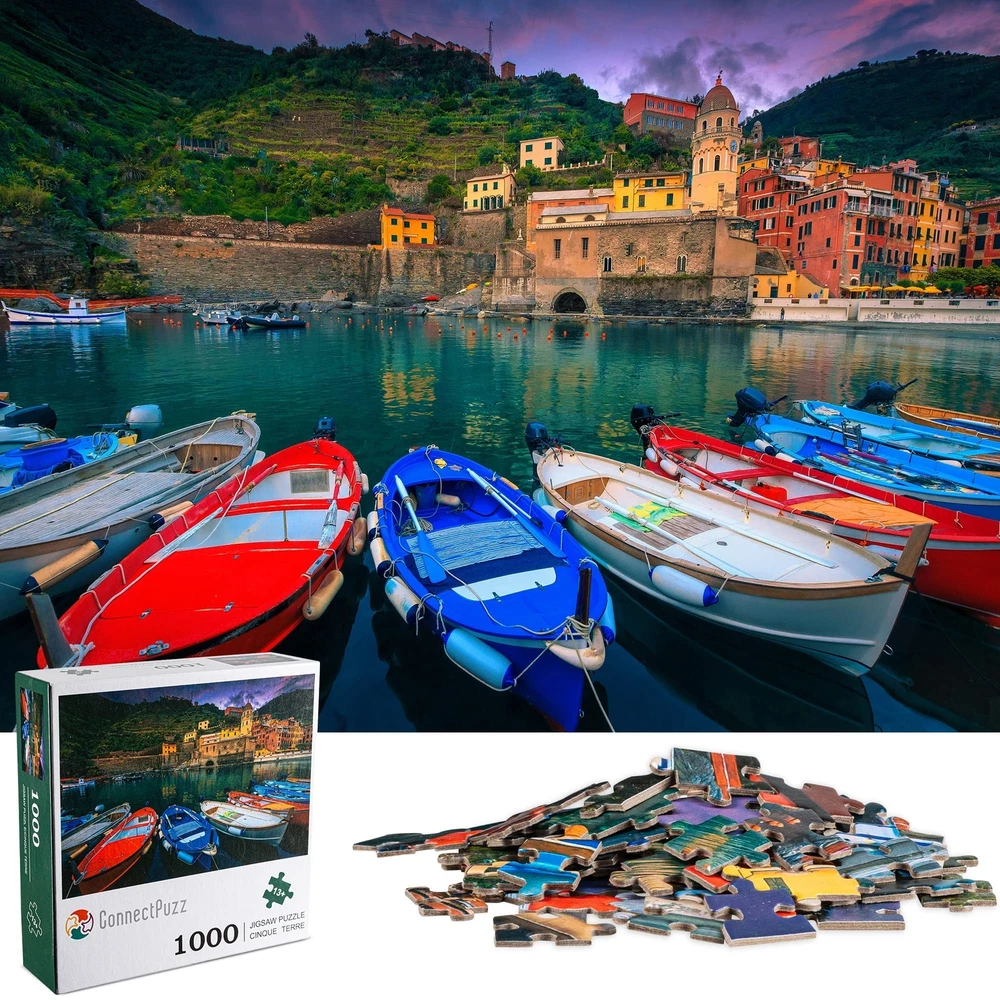 Unlock the Beauty of a Cinque Terre Summer with this Gorgeous 1000-Piece Puzzle from If you love putting together challenging puzzles and revealing stunning images of landscapes, nature, or rustic European cities nothing beats the quality and vibrance of a Cinque Terre 1000-Piece Jigsaw Puzzle. Designed with precision and elegance these challenging puzzles reveal boats floating along serene water with the majestic city and countryside behind them. A fun and interactive choice for anyone who loves puzzles get this Cinque Terre puzzle today and once you put it together you’ll quickly put it on your vacation list. Building Stronger Family Bonds Puzzles don’t just create a bright, colorful image they’re a fun way to bring family and friends together towards a common goal. They’re especially good for keeping active, reducing , and enjoying time together when you’re stuck inside or need an outlet to keep your mind focused and sharp. Quick-Snap Pieces We ensure each interlocking piece is carefully cut with smooth, durable, rounded edges so that they snap together cleanly with no forcing. All so you don’t have to worry about bends, tears, or crumpled edges. Exciting Gift Idea These premium puzzles make a great choice for birthday, holiday, or Christmas presents for and adults alike. Get for yourself today or get for your son, daughter, niece, nephew, or grandchild who loves puzzles and creating something beautiful from scratch. Product Details: 1000-Piece Jigsaw Puzzle Image of Cinque Terre, Italy Bright, Vibrant, and Colorful Pieces High Quality Recycled Cardboard Interactive Fun for and Adults Storage Box Included Premium Cinque Terre Puzzle – Capturing the breathtaking landscape of village near Tuscany this Cinque Terre jigsaw puzzle features beautiful views of the city and the water’s edge complete with small, colorful boats. Challenging, Fun, and Colorful – These 1000-piece puzzles for adults and make it exciting to unlock each new section as you bring the city to life. You’ll love putting it together alone or with friends to challenge your skills. Precision-Cut Pieces – Here at we use the highest-quality pieces in our puzzles for adults to ensure they fit together perfect. They’re also made from recycled cardboard to ensure eco-friendly sustainability. Display It Proudly When You’re Finished – Once you’ve put together this 1000-piece puzzle you can gloss it with a sealant or glue (not included) and create a poster or decorative piece you can add to a bedroom or living room. Trusted Quality and Customer Support – puzzles are designed for style, elegance, and quality. More importantly, they’re backed by unbeatable to ensure your total satisfaction from start to finish.