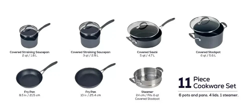 Circulon 11 Piece Non-Stick Cookware Set, A1 Series Scratchdefense, Aluminum NEW Features: Impact Bonded base ScratchDefense Non-Stick Interior Compatible with All Cooktops, Including Induction Ergonomic Silicone Grip Handles Dishwasher Safe & Oven Safe up to 400°F Specifications Brand Circulon Cleaning Recommendation Dishwasher Safe Coating Type PTFE Non-Stick Color Gray Features Induction Features Non-stick Features Oven Safe Features Riveted Handles Material Aluminum Model 81841-T Number of Frying Pan(s) 2 Frying Pans Number of Lid(s) 4 Lids Number of Pieces 11 Piece Number of Saucepan(s) 2 Saucepans Number of Saute Pan(s) 1 Saute Pan Number of Skillet(s) 0 Skillets Number of Stock Pot(s) 1 Stock Pot Oven Safe Temperature 400 F.