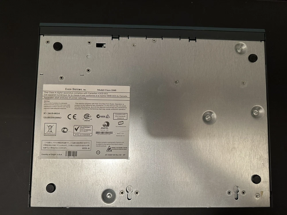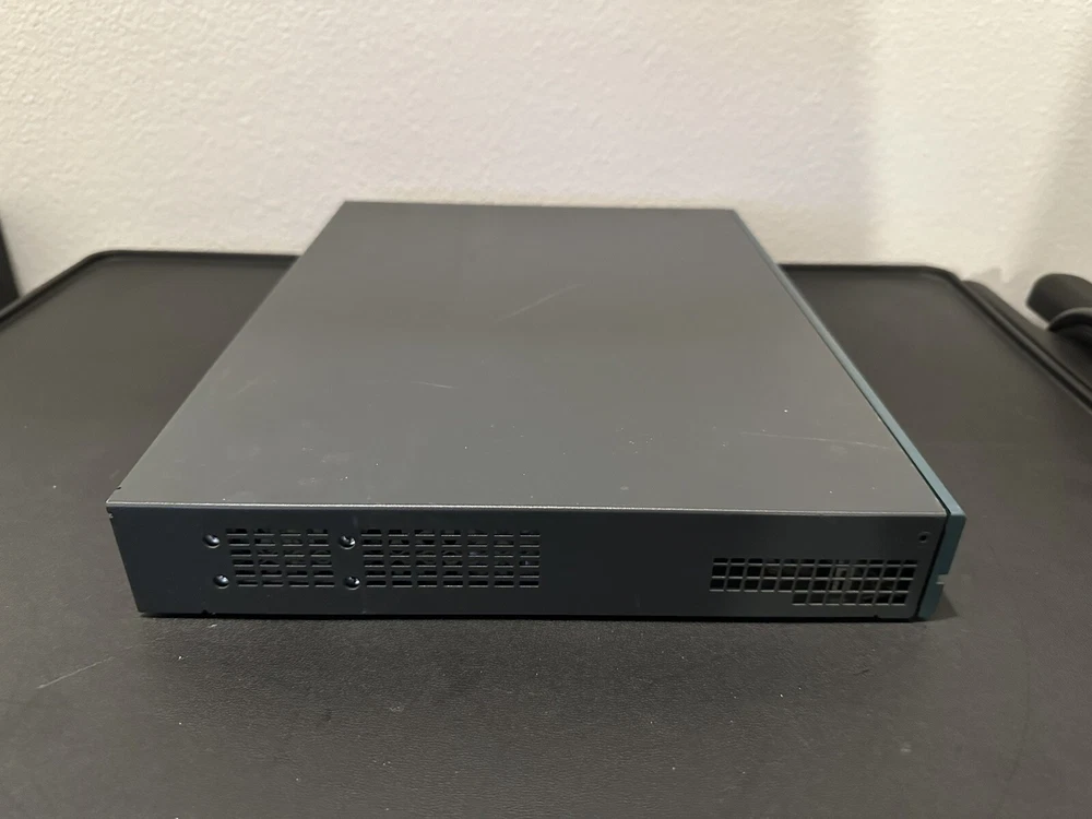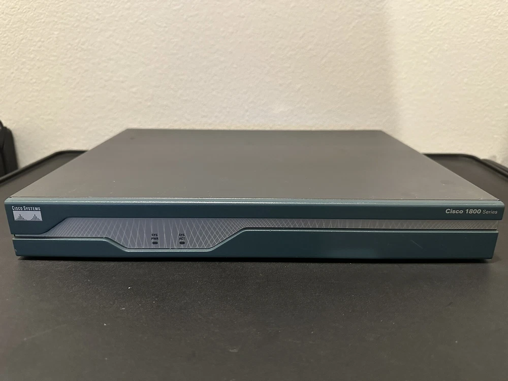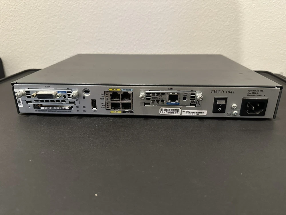 Cisco 1841 V05 Integrated Services Router with ADVENTERPRISE IOS 15.1 image loaded. 128MB Flash Card installed. 1 WIC-1DSU-t1-V2 and 1 WIC-1T card installed. Good for home lab or training purposes. More information below: Router>sh ver Cisco IOS Software, 1841 Software (C1841-ADVENTERPRISEK9-M), Version 15.1(4)M1, RELEASE SOFTWARE (fc1) Copyright (c) 1986-2011 by Cisco Systems, Inc. Compiled Tue 14-Jun-11 16:56 by prod_rel_team ROM: System Bootstrap, Version 12.4(13r)T, RELEASE SOFTWARE (fc1) Router uptime is 8 minutes System returned to ROM by power-on System restarted at 11:59:26 UTC Mon Jan 2 2006 System image file is "flash:c1841-adventerprisek9-mz.151-4.M1.bin" Last reload type: Normal Reload This product contains cryptographic features and is subject to United States and local country laws governing import, export, transfer and use. Delivery of Cisco cryptographic products does not imply third-party authority to import, export, distribute or use encryption. Importers, exporters, distributors and users are responsible for compliance with U.S. and local country laws. By using this product you agree to comply with applicable laws and regulations. If you are unable to comply with U.S. and local laws, return this product immediately. Cisco 1841 (revision 7.0) with 358400K/34816K bytes of memory. Processor board ID FTX1134**** 2 FastEthernet interfaces 1 Serial interface 1 Serial(sync/async) interface 2 Virtual Private Network (VPN) Modules DRAM configuration is 64 bits wide with parity disabled. 191K bytes of NVRAM. 125440K bytes of ATA CompactFlash (Read/Write) License Info: License UDI: ------------------------------------------------- Device# PID SN ------------------------------------------------- *0 CISCO1841 FTX1134**** Configuration register is 0x2102 Router>sh inv NAME: "chassis", DESCR: "1841 chassis" PID: CISCO1841 , VID: V05 , SN: FTX1134**** NAME: "motherboard", DESCR: "C1841 Motherboard with 2 Fast Ethernet" PID: CISCO1841 , VID: V05 , SN: FOC1131**** NAME: "WIC 0", DESCR: "WAN Interface Card - DSU/CSU T1 Fractional (V2)" PID: WIC-1DSU-T1-V2 , VID: 1.2, SN: FOC1129**** NAME: "WIC 1", DESCR: "WAN Interface Card - Serial (1T)" PID: WIC-1T= , VID: 1.0, SN: 3403**** NAME: "Virtual Private Network (VPN) Module on Slot 0", DESCR: "Encryption AIM Element" PID: AIM-VPN/SSL-1 , VID: V01, SN: FOC1132538R Router>sh env Fan 1 OK ILP Power Supply - Not supported Fan Speed Setting: Normal Router>sh flash -#- --length-- -----date/time------ path 1 47331716 May 27 2014 19:54:48 +00:00 c1841-adventerprisek9-mz.151-4.M1.bin 7 416354 Aug 21 2007 21:22:54 +00:00 sslclient-win-1.1.3.173.pkg 8 1164288 Aug 21 2007 21:20:44 +00:00 COMMON.TAR 9 861696 Aug 21 2007 21:20:20 +00:00 ES.TAR 10 1038 Aug 21 2007 21:21:04 +00:00 home.shtml 11 113152 Aug 21 2007 21:21:24 +00:00 HOME.TAR 12 6036480 Aug 21 2007 21:19:54 +00:00 SDM.TAR 13 1821 Aug 21 2007 21:19:04 +00:00 sdmconfig-18xx.cfg 14 1697952 Aug 21 2007 21:22:24 +00:00 securedesktop-ios-3.1.1.45-k9.pkg 70520832 bytes available (57645056 bytes used)