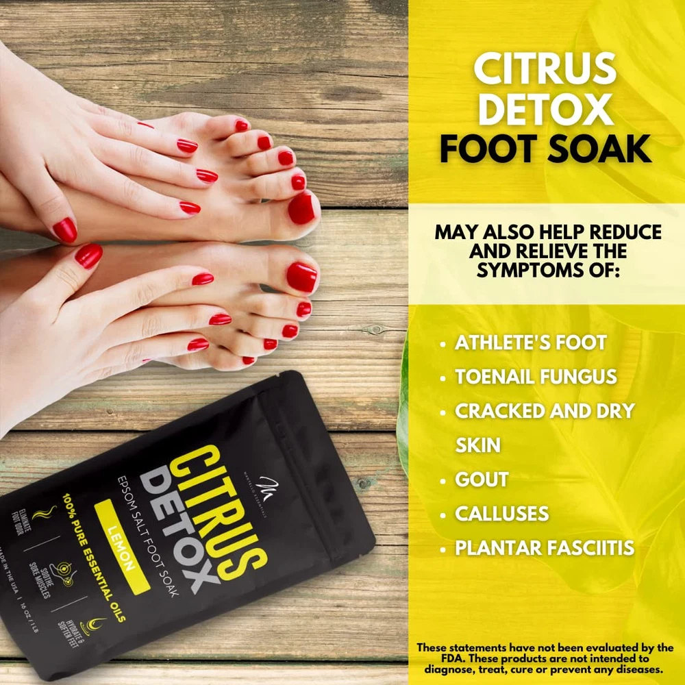 CITRUS DETOX FOOT BATH – Draw out dirt and toxins from tired feet with the Citrus Detox Foot Soak. An essential-oils-infused foot bath soak formulated to refresh and detox, this foot spa soak is the best way to revitalize your feet. MADE IN THE USA – Our foot detox soak is made in the USA with the highest standards for ingredients and essential oils in our feet soaking products. You can trust that you are getting the best foot care with no harsh chemicals or additives! BABY SOFT FEET – Our unique foot soaker blend of Epsom salt and essential oils not only soothes tired muscles, but also helps eliminate foot odor, and softens calluses and skin. A suitable foot soak for fungus toenails and treats the symptoms of Athlete's foot. INGREDIENTS YOU CAN TRUST – The ultimate foot soak for dry cracked feet, rich with all-natural ingredients: Epsom salts for soaking feet, sea salt, vitamin E, lemon oil, bergamot oil, eucalyptus, ginger extract, rosemary, and frankincense. FULL FOOT SOAK SALTS LINE – Our body detox foot soak line ranges from Tea Tree Oil foot soak to Sweet Dreams Lavender to Citrus Detox foot soak. Try our full range of foot care products, including our feet soaking tub, and treat your feet!