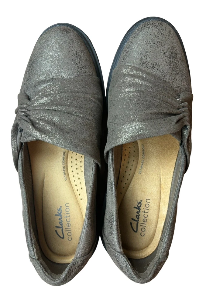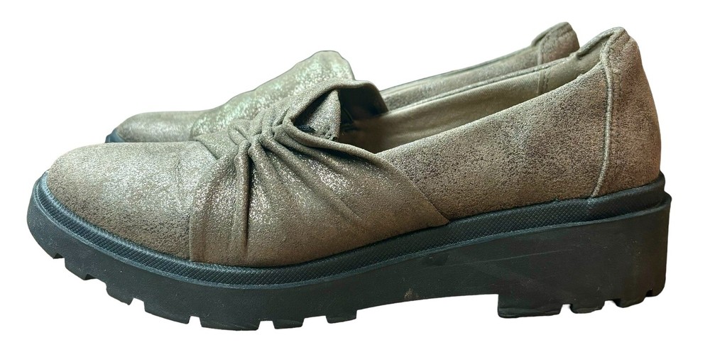 Elevate your shoe collection with these stylish Clarks Calla loafers in bronze brown. The slip-on design makes them perfect for casual occasions, while the lug-sole outsole provides comfort and durability. The fabric and suede upper material is accented with a metal theme, and the shoes are available in UK size 6, US size 8.5, and EU size 39.5. These flats are suitable for all seasons, whether it's winter, summer, fall, or spring. The insole material is also made of fabric for added comfort. These Clarks Calla loafers are a must-have for any fashion-forward woman looking for a comfortable and stylish shoe.
