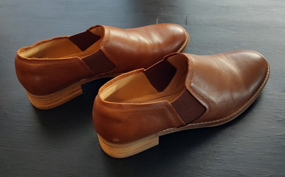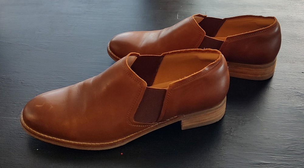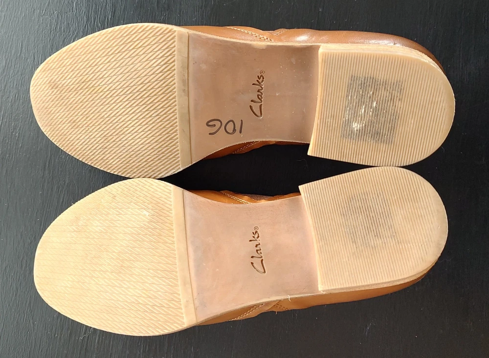 Clarks Cushion Light Brown Leather Slip-on Loafer Dress Shoes Women's 8 US. Shoes are in very good pre-owned condition with only light general wear including some writing and light wear to soles as pictured. Please review all images prior to purchasing.