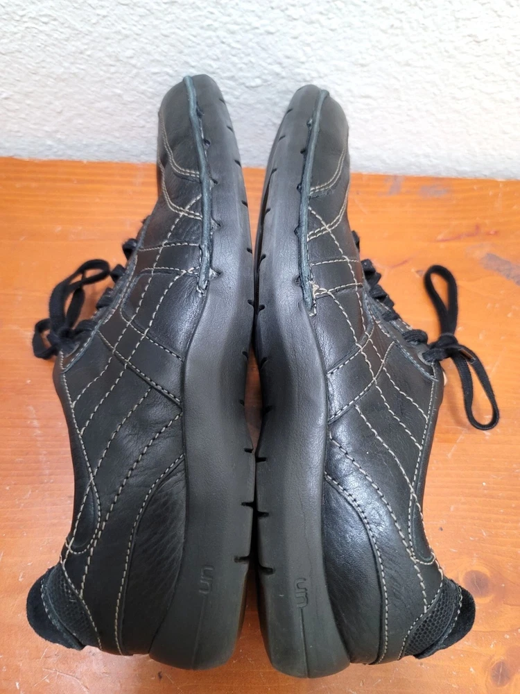 Designed for all-day comfort, these black leather sneakers feature a supportive sole and a lace-up design. Ideal for casual daily wear. • Lace-up closure for secure fit • Cushioned insole for comfort • Durable leather upper with contrast stitching • Flexible outsole for easy movement CONDITIONS pre owned, Light scuffs on leather, good conditions. see photos for flaws details,