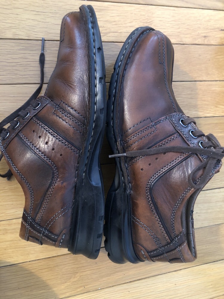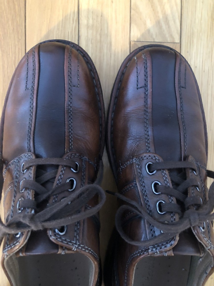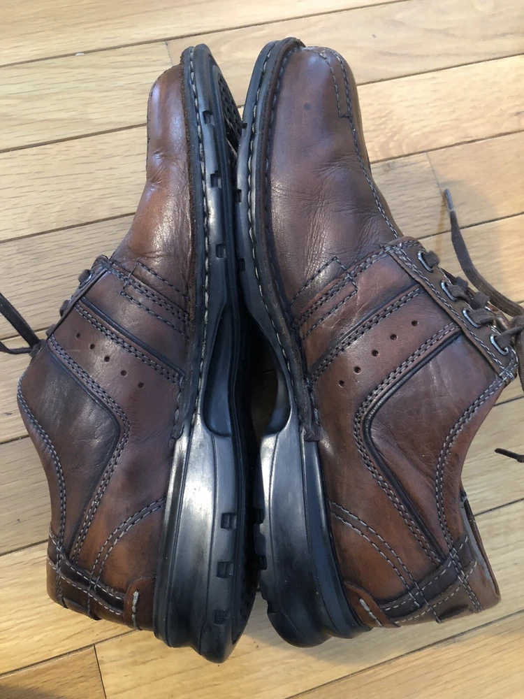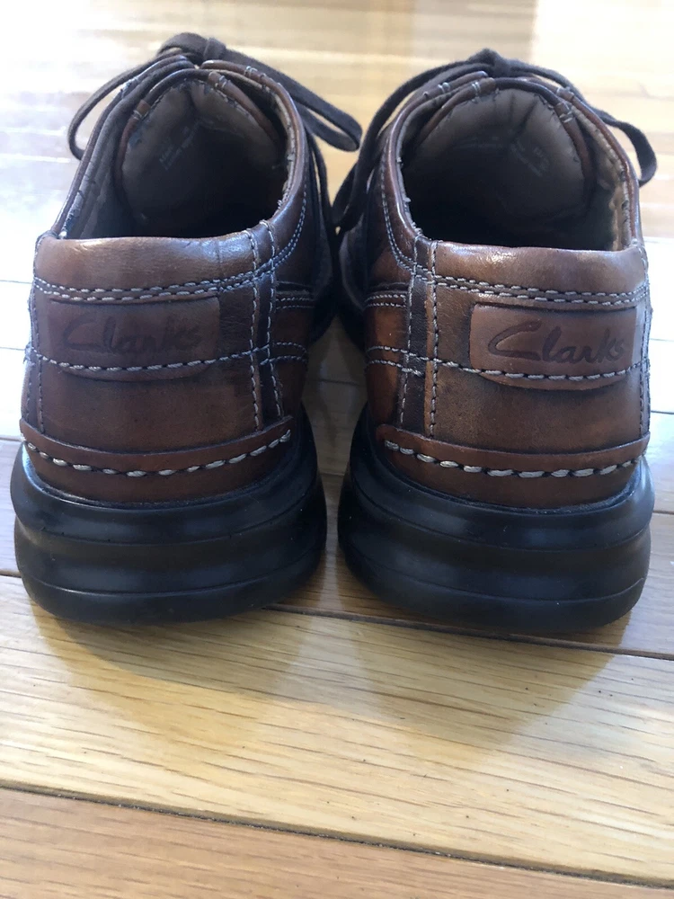 Clarks Men's Touareg Brown Two Toned Leather Lace Up Oxford 70852 Size 7.5 Gently worn shoes with some normal wear of leather on inside along eyelets and heel of right shoe. Please view photos. Comfortable, everyday shoes! Please feel free to contact me with any questions. Thank you for your interest.