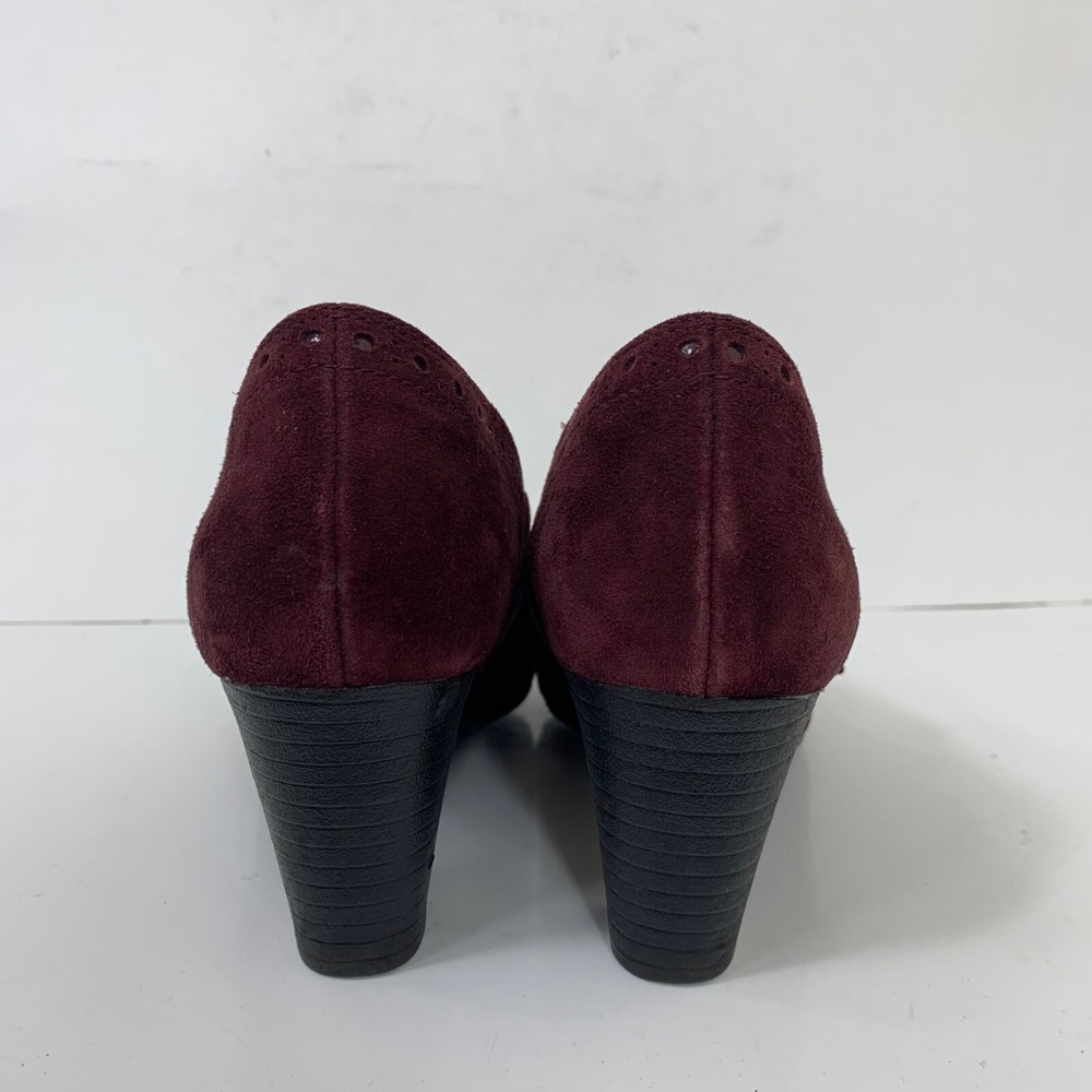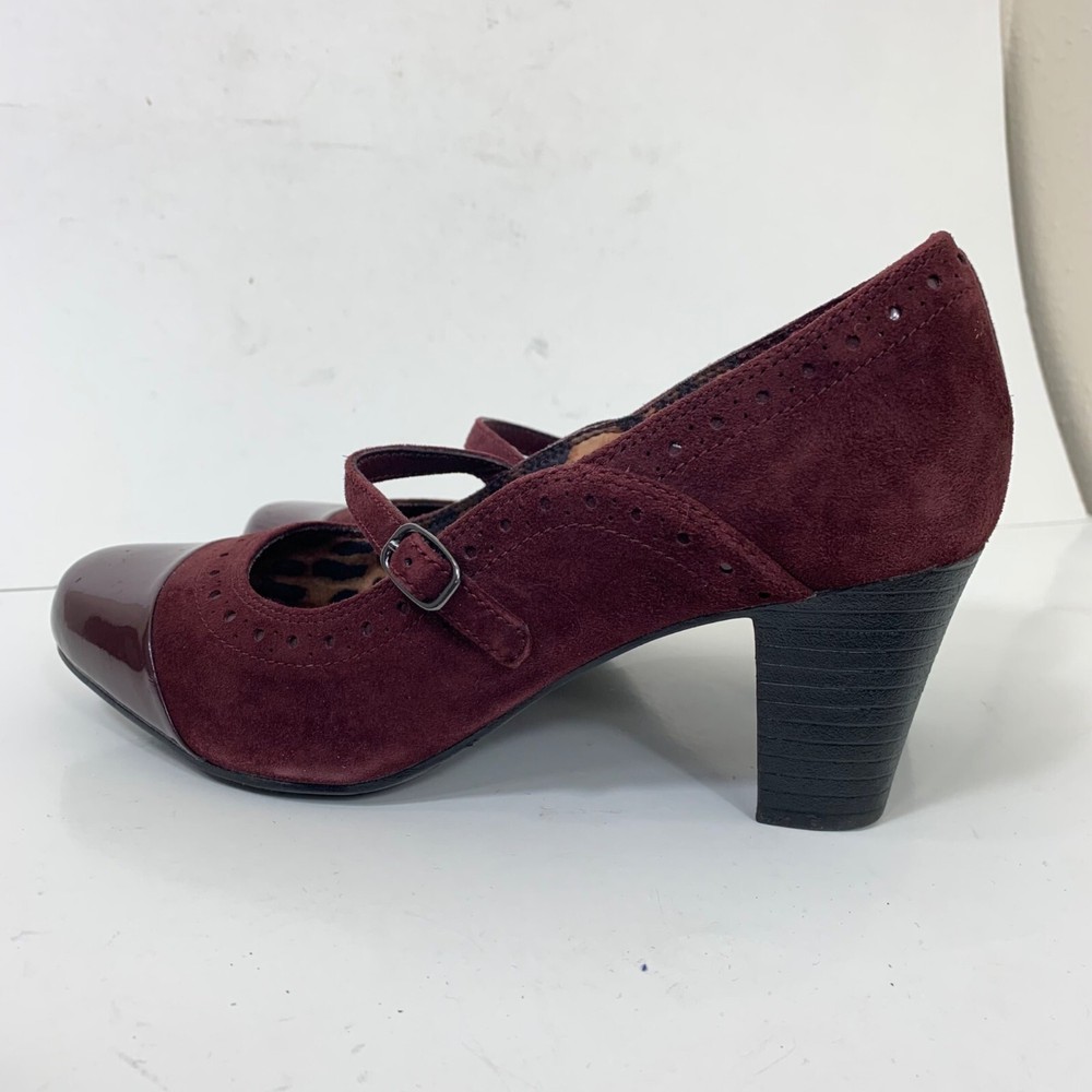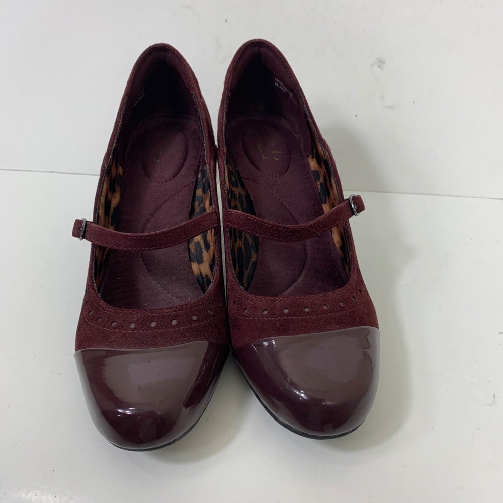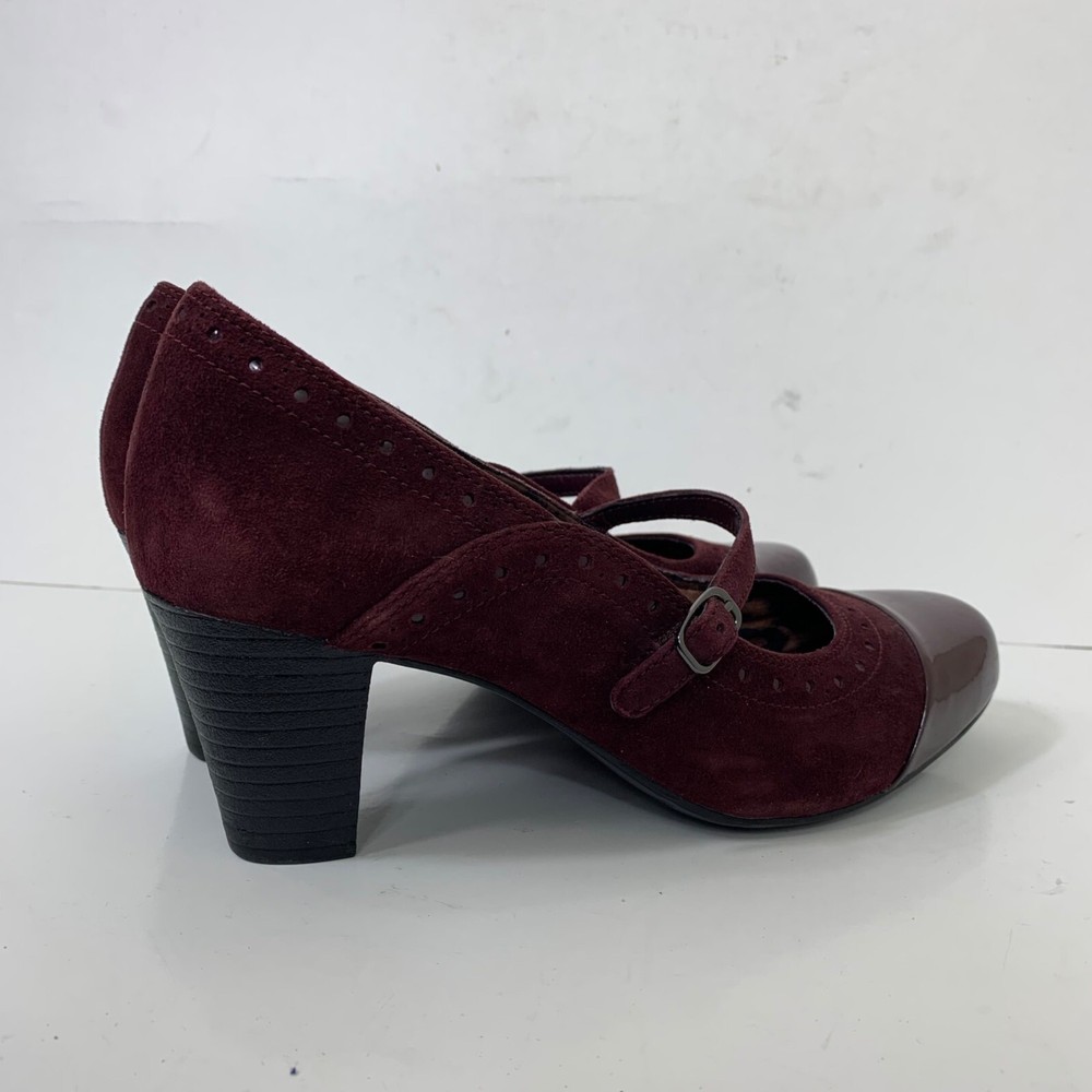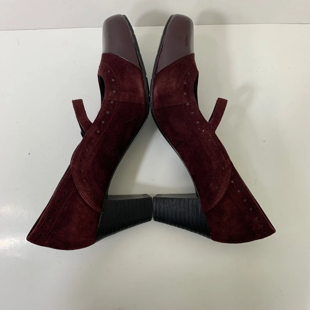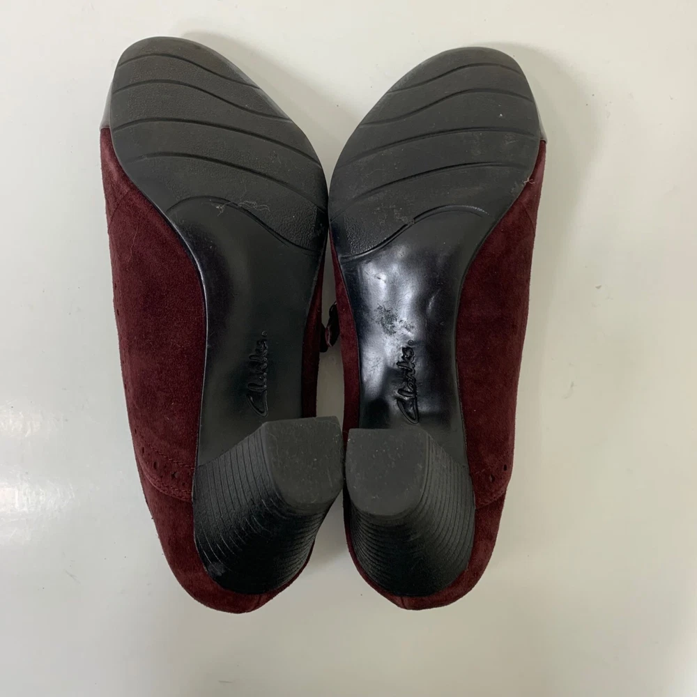 Clarks Sapphire Vase Burgundy Suede Mary Jane Leather Pumps Size 7.5 Excellent preowned condition! Buckle closure Patent leather toes 2.75” stacked block heel 1P35 1 lb 1 oz Box 8 Tags: witch, Whimsigoth, vamp, sexy, goth