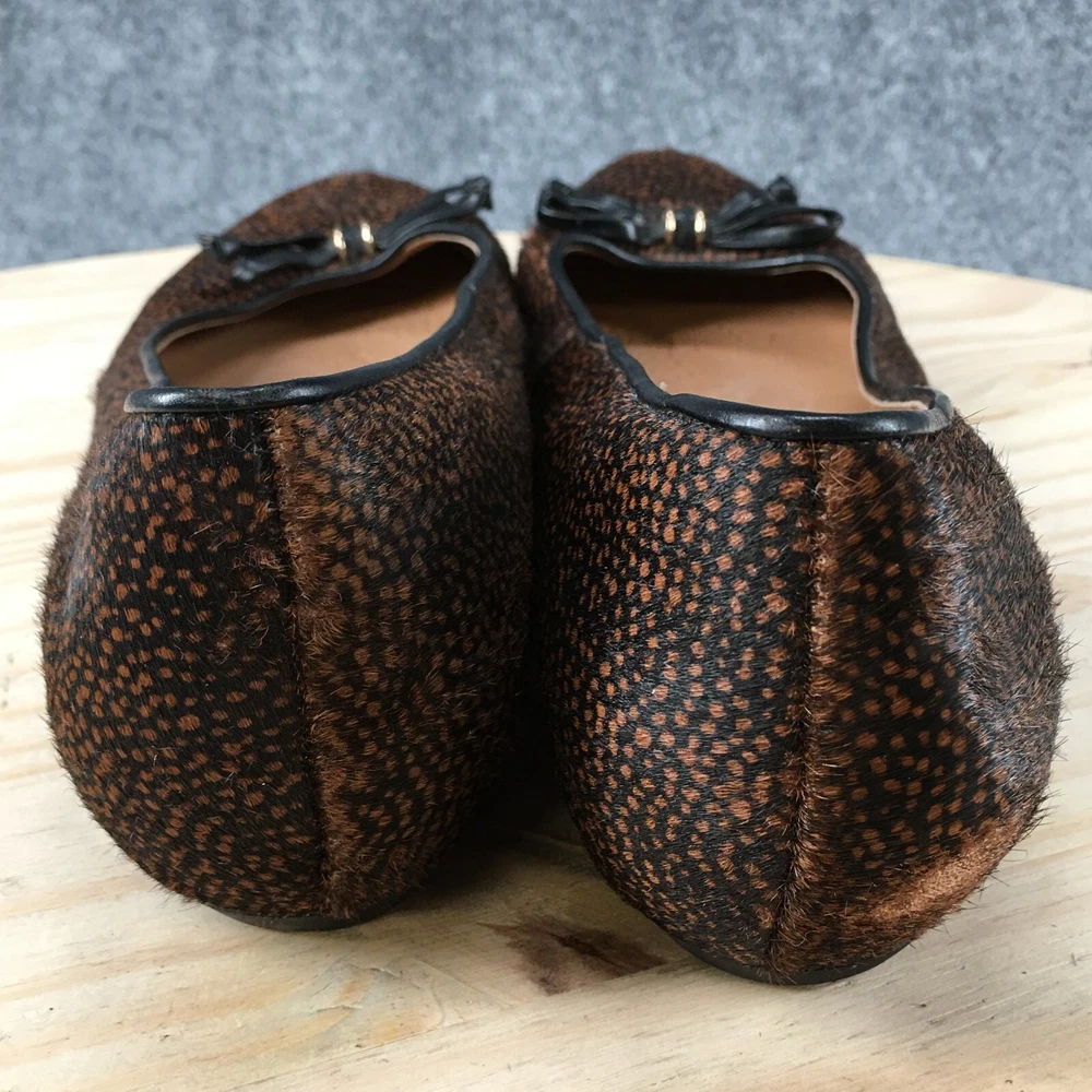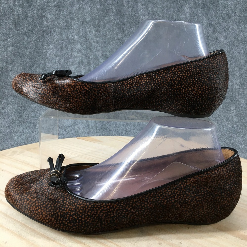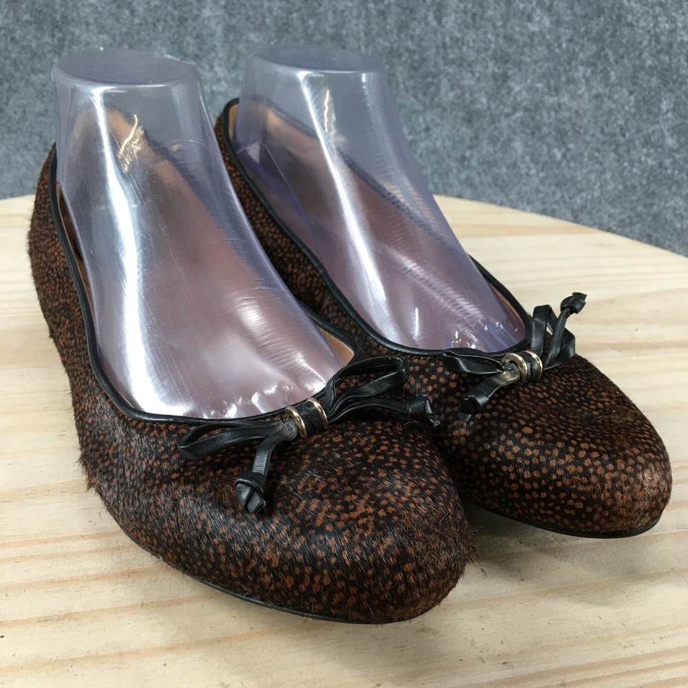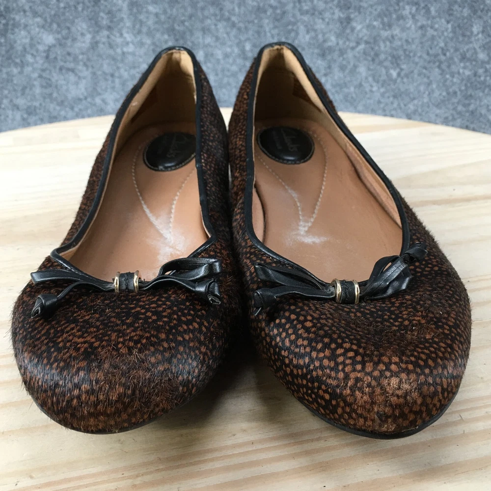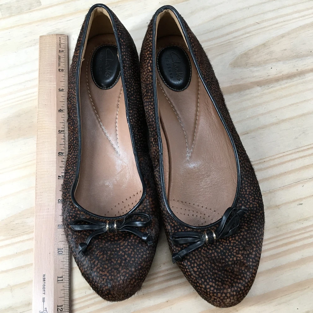Clarks Shoes Womens 9.5M Alitay Giana Ballet Flats Bow Cheetah Print Brown Suede *Please read the entire description* Good Condition: Tops have scuffing and insole wear. Bottoms have heel wear and sole wear. US Size: 9.5 M UK Size: 7 AU Size: 8 Euro Size: 41 Item well cared for. We ship SAME DAY the item is ordered so expect a FAST delivery! Condition of shoes are best viewed by zooming in on pictures. Please look at all of them :) The photo with a ruler is lined up with the back of the heel and shows the approximate length of the shoe from the top view. Measure and compare your own shoes in the same fashion. We are sorry but we cannot answer any questions regarding further measurements. The tag on the shoes is just a SKU number for organization and is not a size or a price tag. Message me if you have any problems and we will make it right QUICKLY! We post 100s of items every week in my store. Check it out!