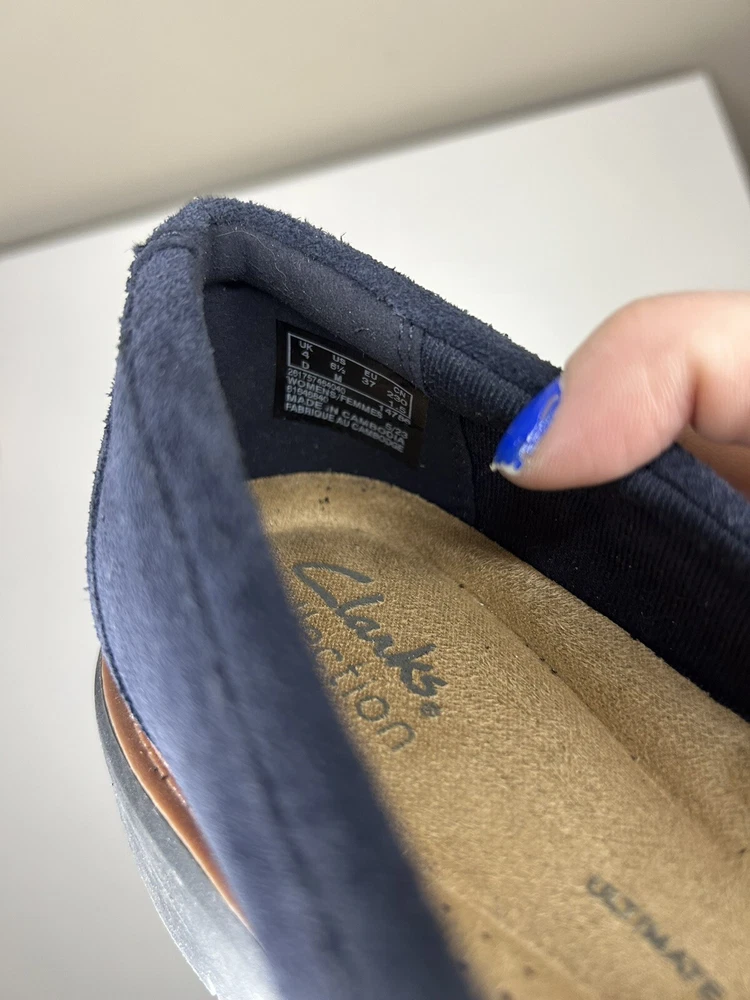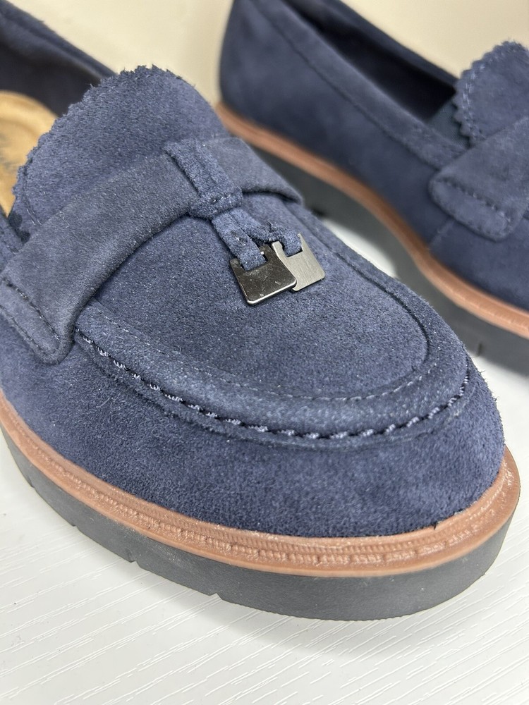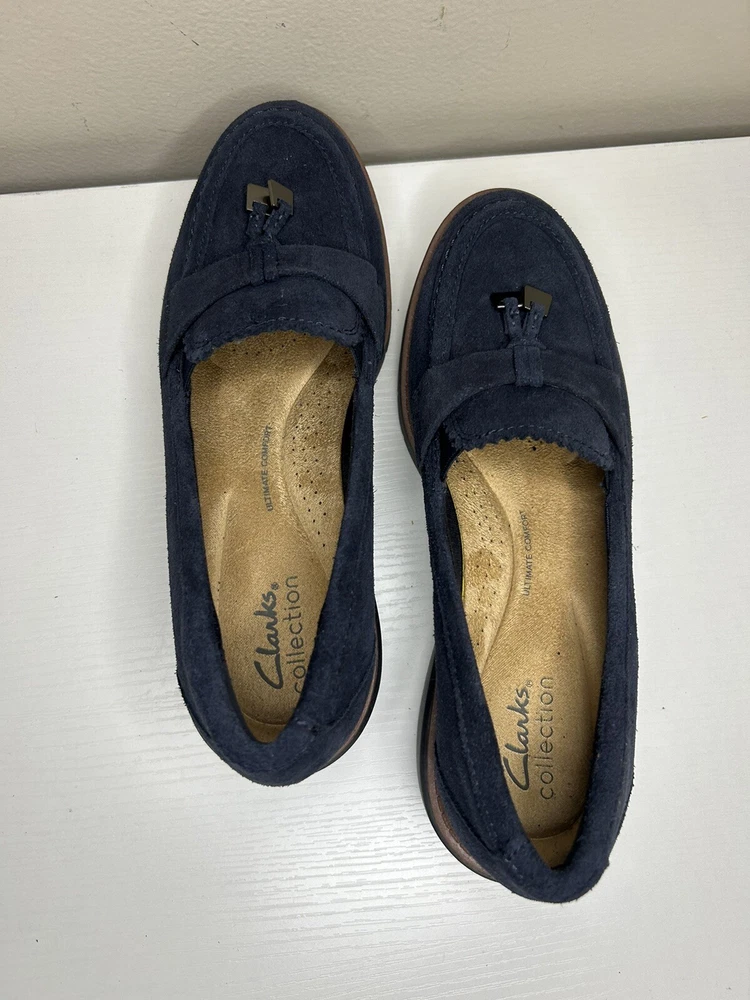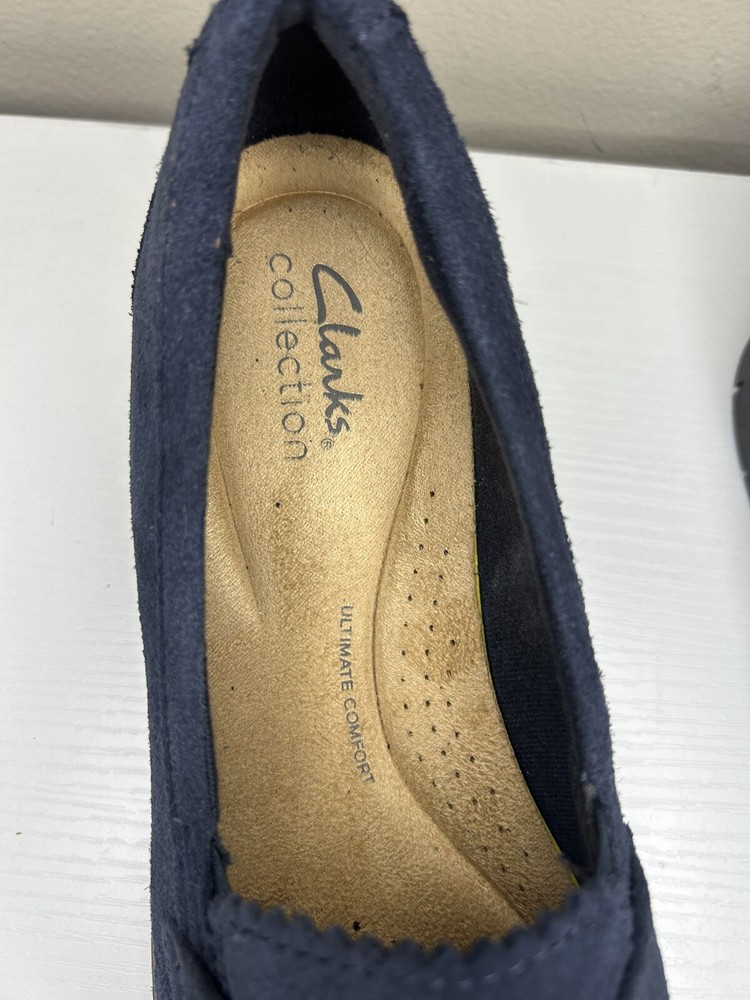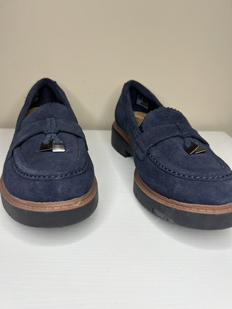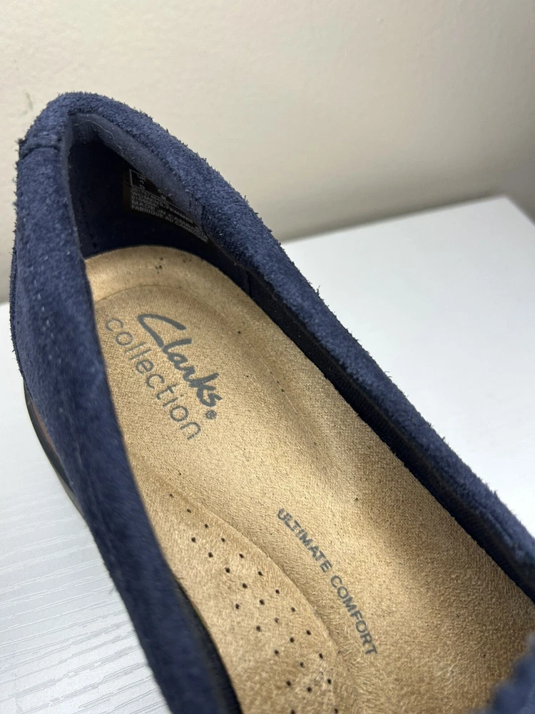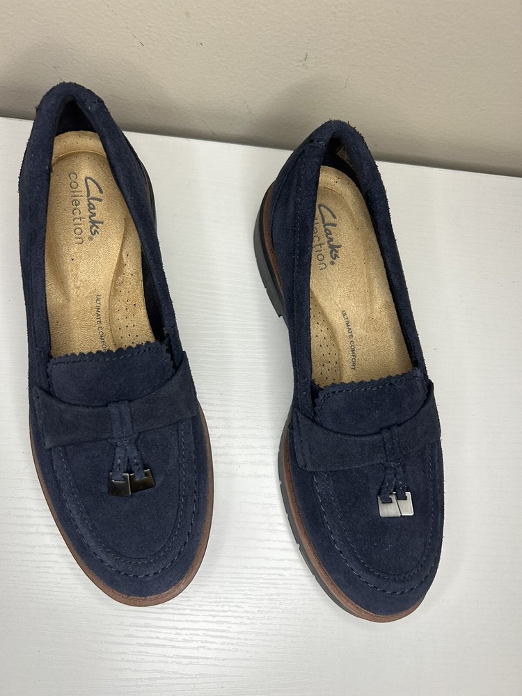 The Clarks Collection Leather Loafer with Tassel in Westlynn Bella Navy Suede is a stylish and comfortable slip-on loafer for women. Made from high-quality suede and featuring tasseled accents, these loafers are perfect for adding a touch of sophistication to any outfit. With a cushioned foam insole, these loafers provide all-day comfort and support, making them a versatile and practical choice for everyday wear. The classic blue color and timeless loafer style make these shoes a staple in any woman's wardrobe.