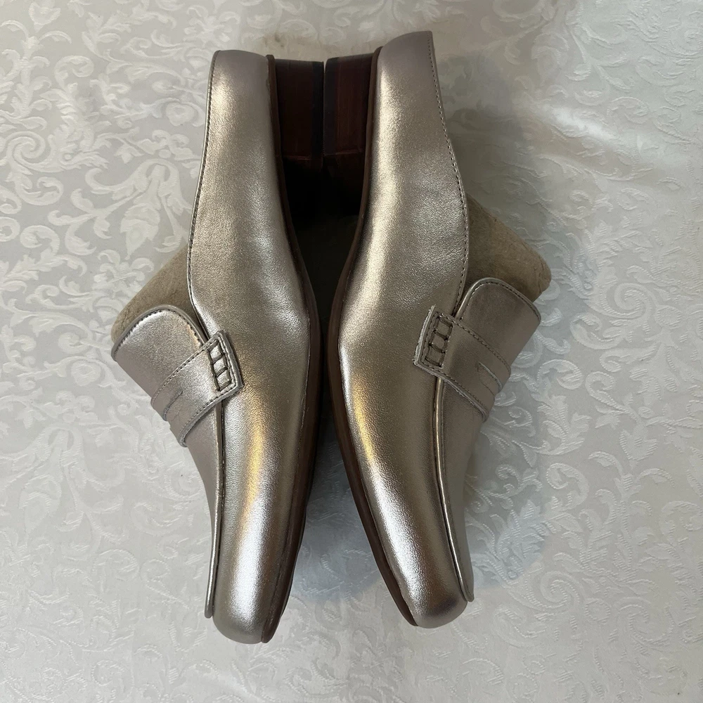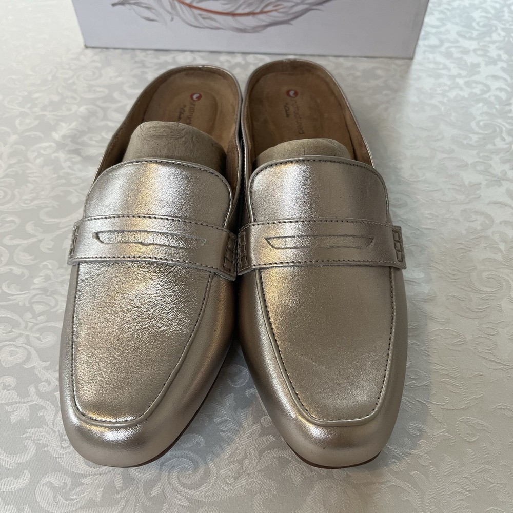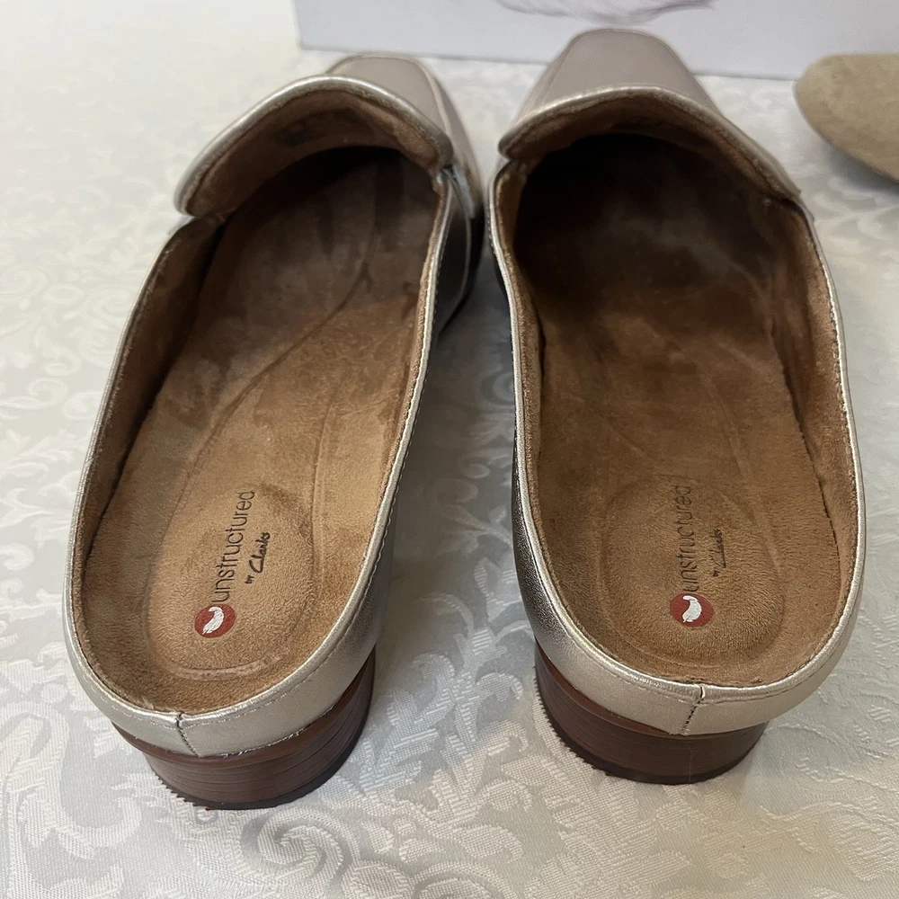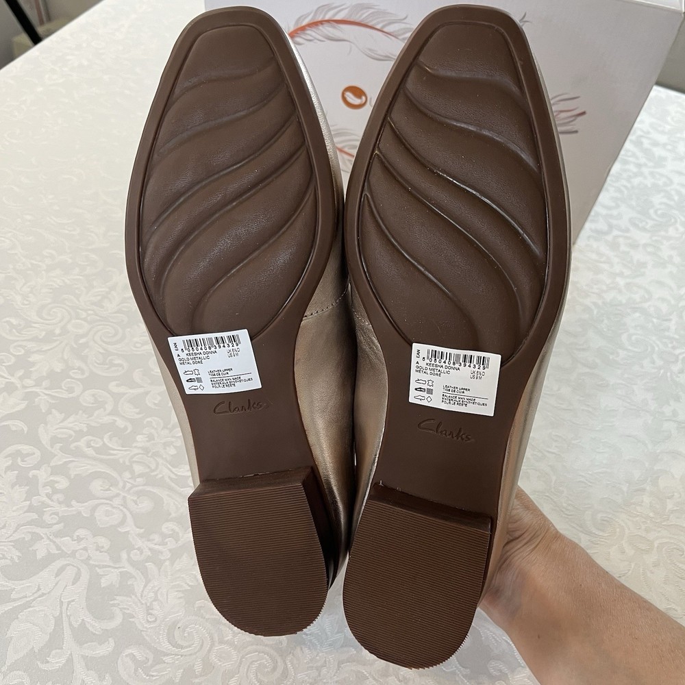 NEW Clarks Women 9M Keesha Donna Gold Metallic Leather Slip On Open Back Mules -A few tiny imperfections on one shoe shown in last pictures -Smoke free location