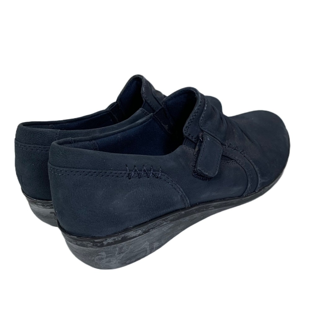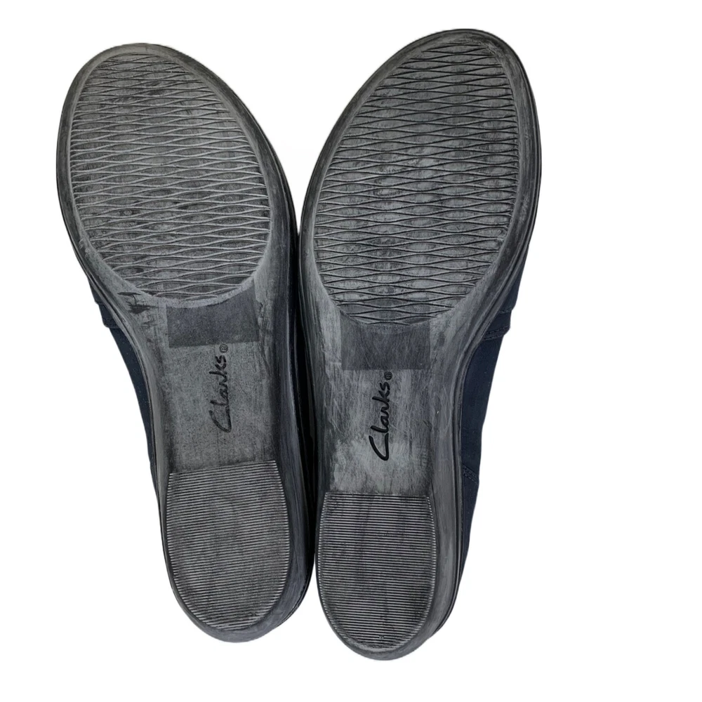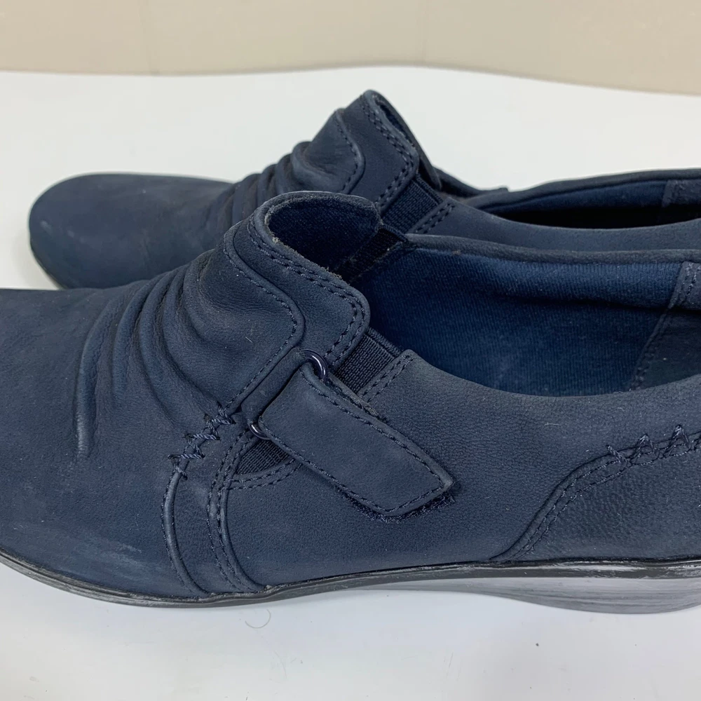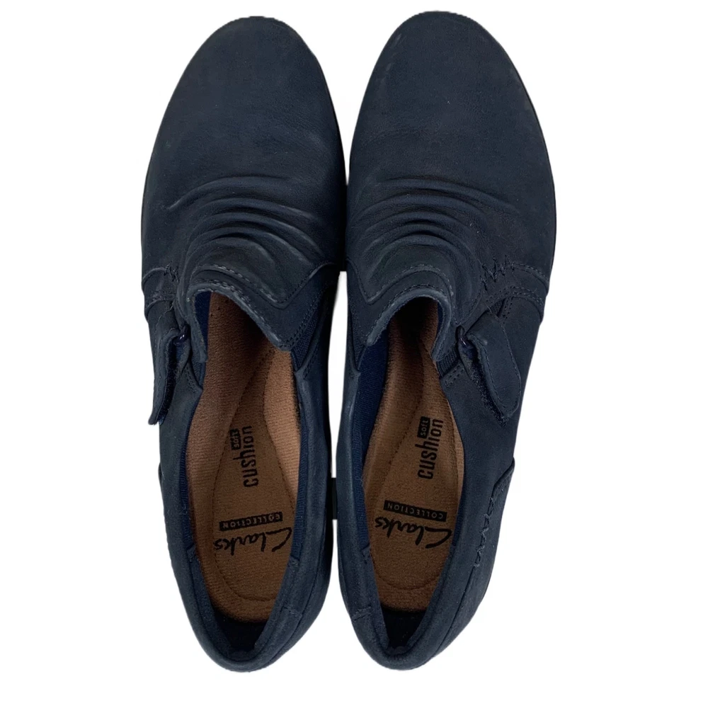 Clarks Women’s Everlay Coda Loafers in Blue Suede - Size 7.5 The soles are turning white, and there are some small signs of wear. Besides that, these shoes are in great shape! Blue leather, ruched upper with buckle and rubber soles. 2P20 46-2814 1 lb 3 oz Tags: casual, comfortcore, cozycore