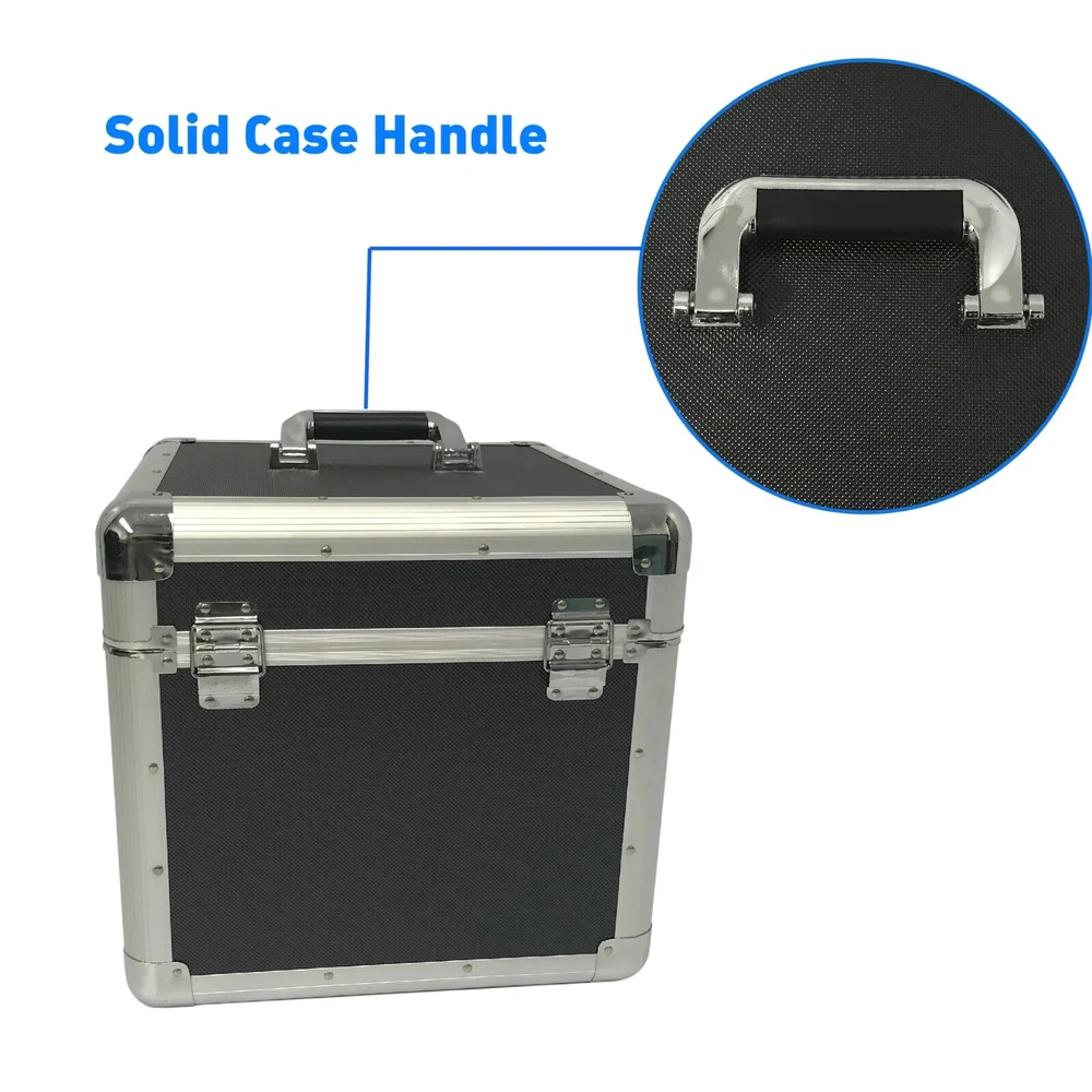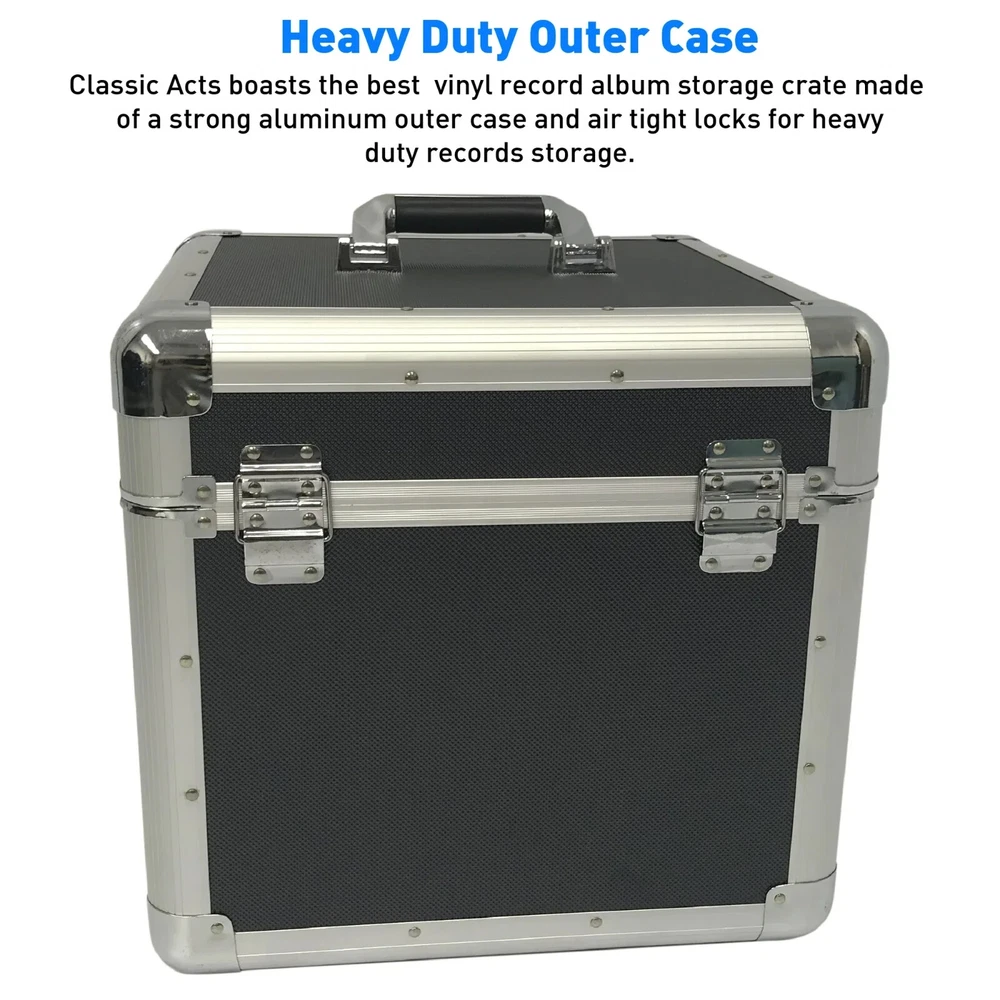 Product details Are you tired of the stacks of your vinyl records laying around unprotected? Forget the milk crate and wooden crates for storing your vinyl records! Classic Acts offers the perfect organizer storage product to protect your lps in between the time when you listen to the records. Made from strong aluminum, our storage crates boast heavy duty protection better than any wooden storage or milk crate for your vinyl records. Each vinyl record crate is equipped with a plush foamed roof, felt sides and air tight locks for protection against dust and any mishandling. Not only does each crate come with the best record storage, it also comes with a solid case handle sturdy enough for all heavy lifting and keeps each album safe and sound inside unlike faulty wood storage. Classic Acts boasts a large vinyl player storage amount that fits up to 50 doubles and up to 75 singles. Many record player companies’ offer a wooden table or wooden crate for storage but Classic Acts with its heavy duty aluminum and overall interior protection can give you and your vinyl records the best quality guaranteed. Heavy Duty Outer Case- Classic Acts boasts the best vinyl record album storage crate made of a strong aluminum outer case and air tight locks for heavy duty records storage. Overall Interior Protection- Each of our vinyl record crates is equipped with a plush foamed roof, felt sides and air tight locks to keep your vinyl records safe from dust and falls. Solid Case Handle - Forget the milk crate and wooden crates to keep your records safe, Classic Acts provides a sturdy handle for heavy lifting. Large Quantity Storage- While many record player storage organizer storage products can only store a certain limit, Classic Acts’ lps crate can fit up to 50 doubles and up to 75 singles.