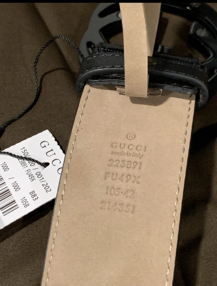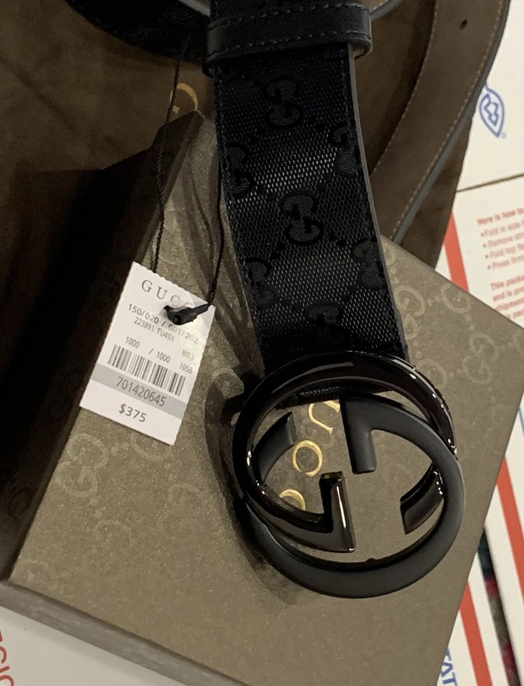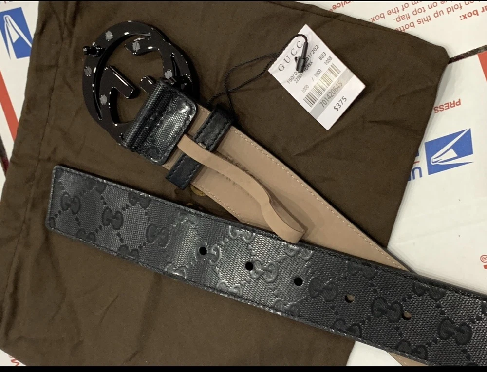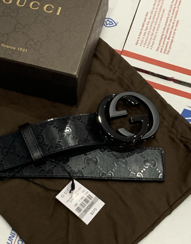 Classic GUCCI Men’s Belt GG Black shiny canvas Two toned black/matte buckle Size 105/42 Fits 36/37 Pants/Jeans. Comes with dust bag and box Like new never worn in mint condition Flawless! Priority mail same day shipping!