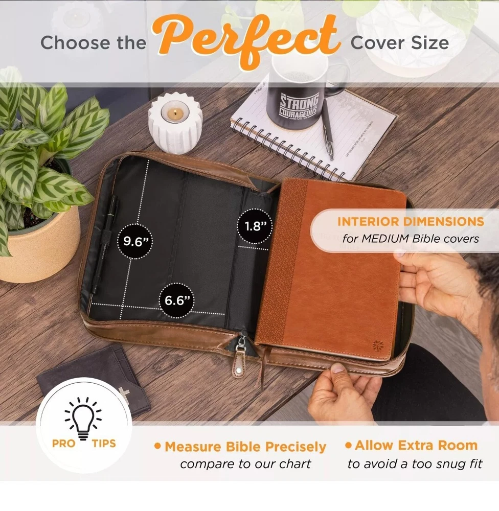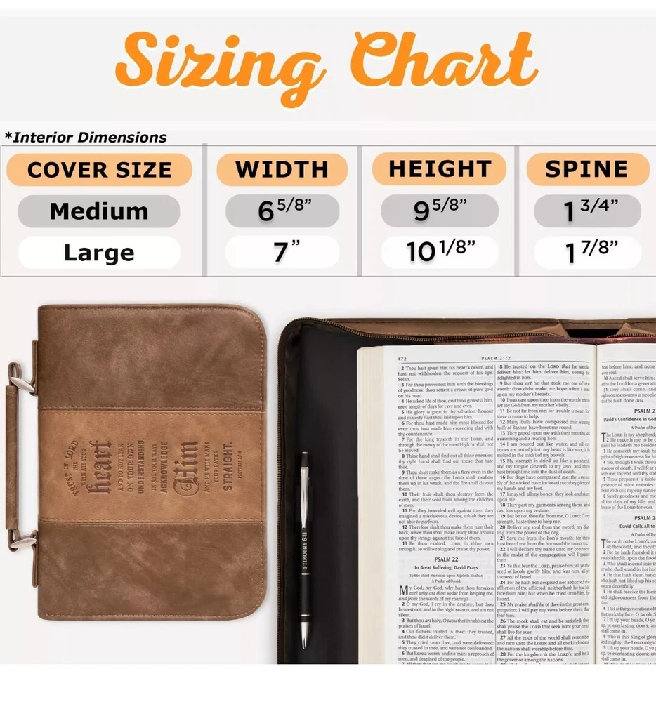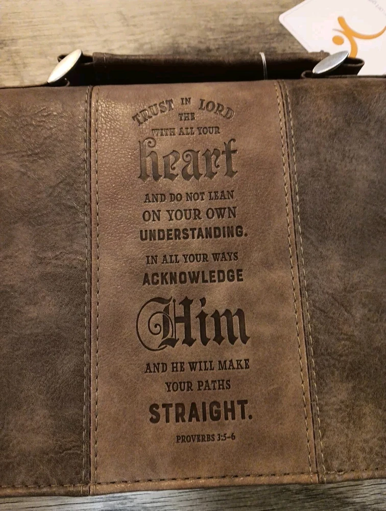 Classic Medium Bible Cover Trust in The Lord Proverbs 3:5 Brown Faux Leather. Brand new with tags. Fits most standard size bibles and books up to 6-5/8" wide, 9-5/8" length, 1-3/4" height. * 2 tone faux leather * exterior slip pocket * lay-flat carry handle * 2 pen loops inside * heat embossed text