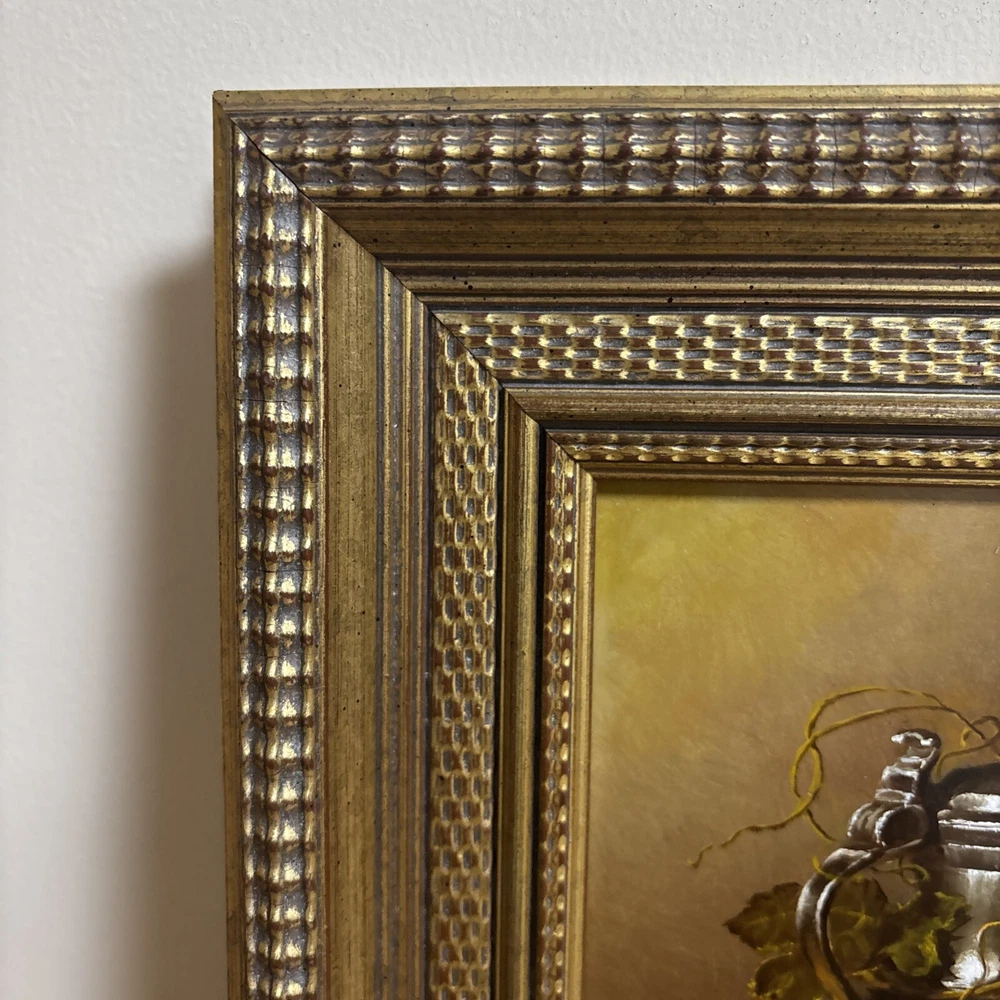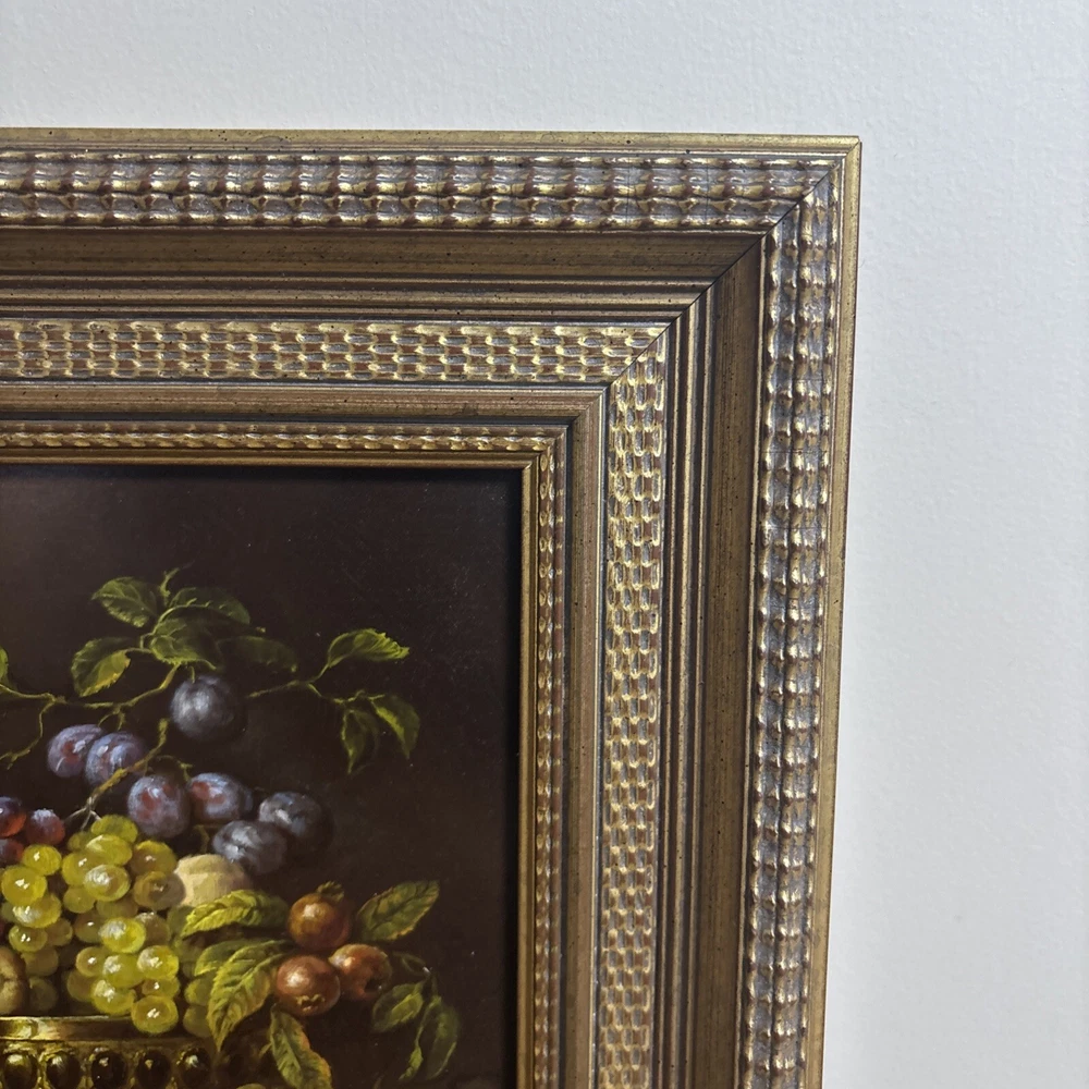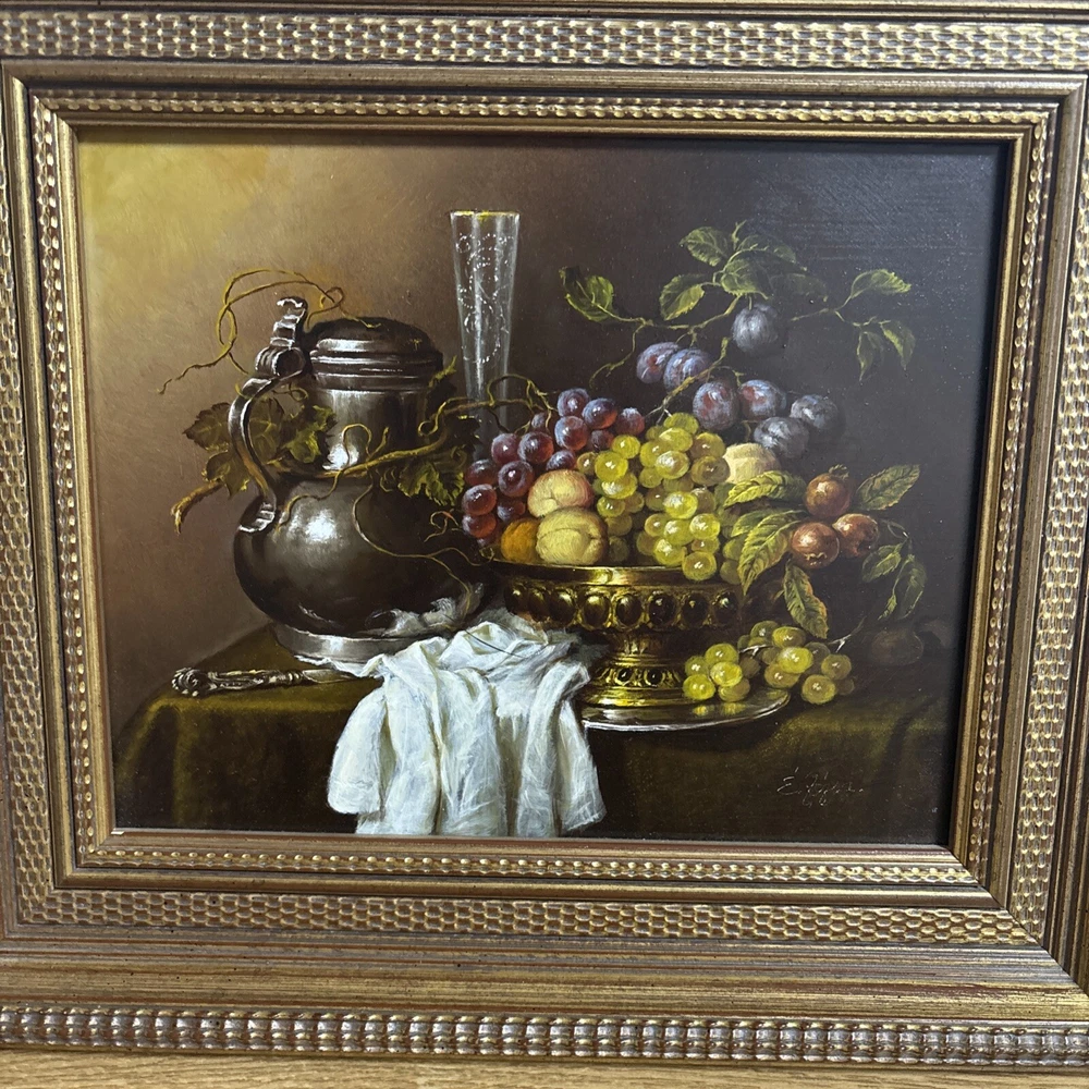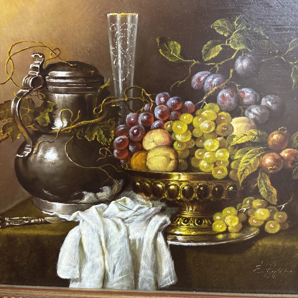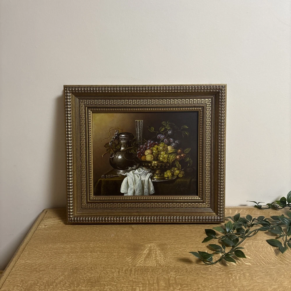 This stunning classic still life painting captures a beautifully detailed arrangement of fruit, a silver vessel, and a draped cloth, all rendered with masterful use of light and texture. The composition is both elegant and timeless, showcasing the artist’s skill in traditional still-life artistry. The artwork is signed in the lower corner, but the signature is not fully legible. Despite this, the piece exudes quality and craftsmanship, making it a wonderful addition to any art collection. Measuring 35 cm in width and 31 cm in height, the painting is framed in an ornate gold-tone frame that enhances its classic appeal. This piece is ideal for adding warmth and sophistication to living rooms, dining areas, or kitchens. We take great care to provide accurate descriptions, and we encourage you to thoroughly review the accompanying photos for a comprehensive understanding of the item's details. If you have any questions or need additional information, please don't hesitate to reach out to us.